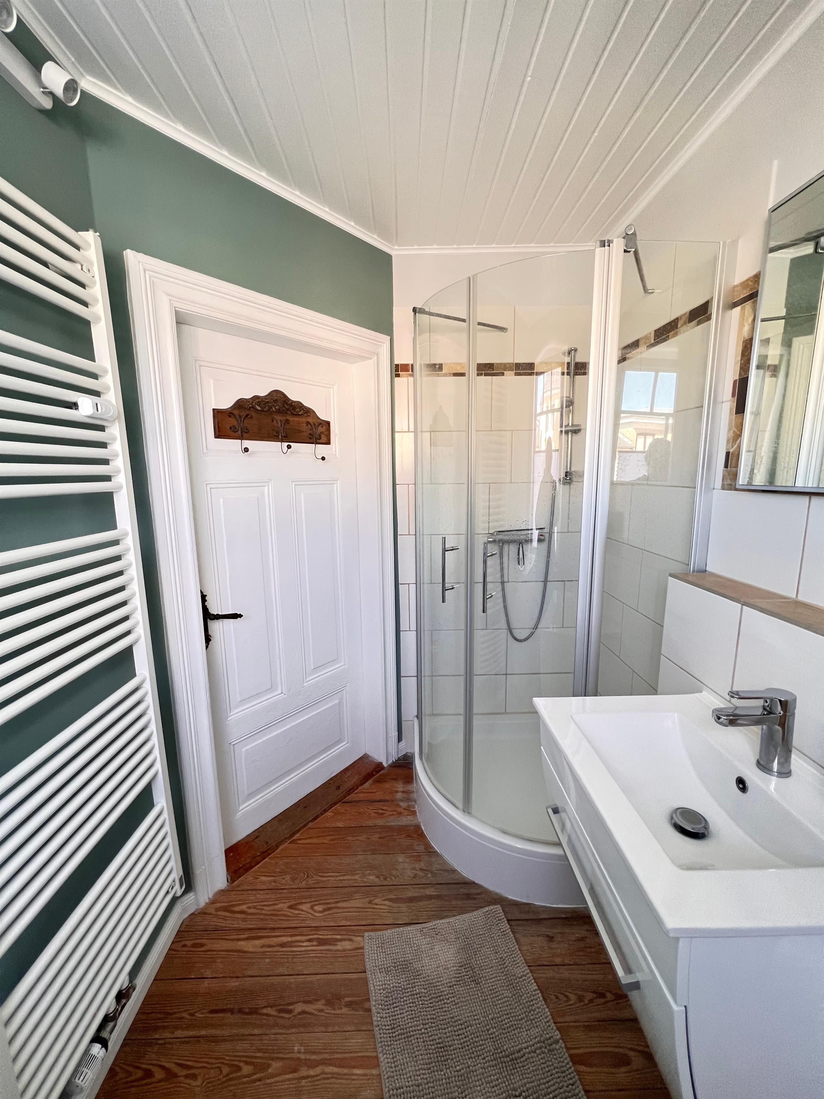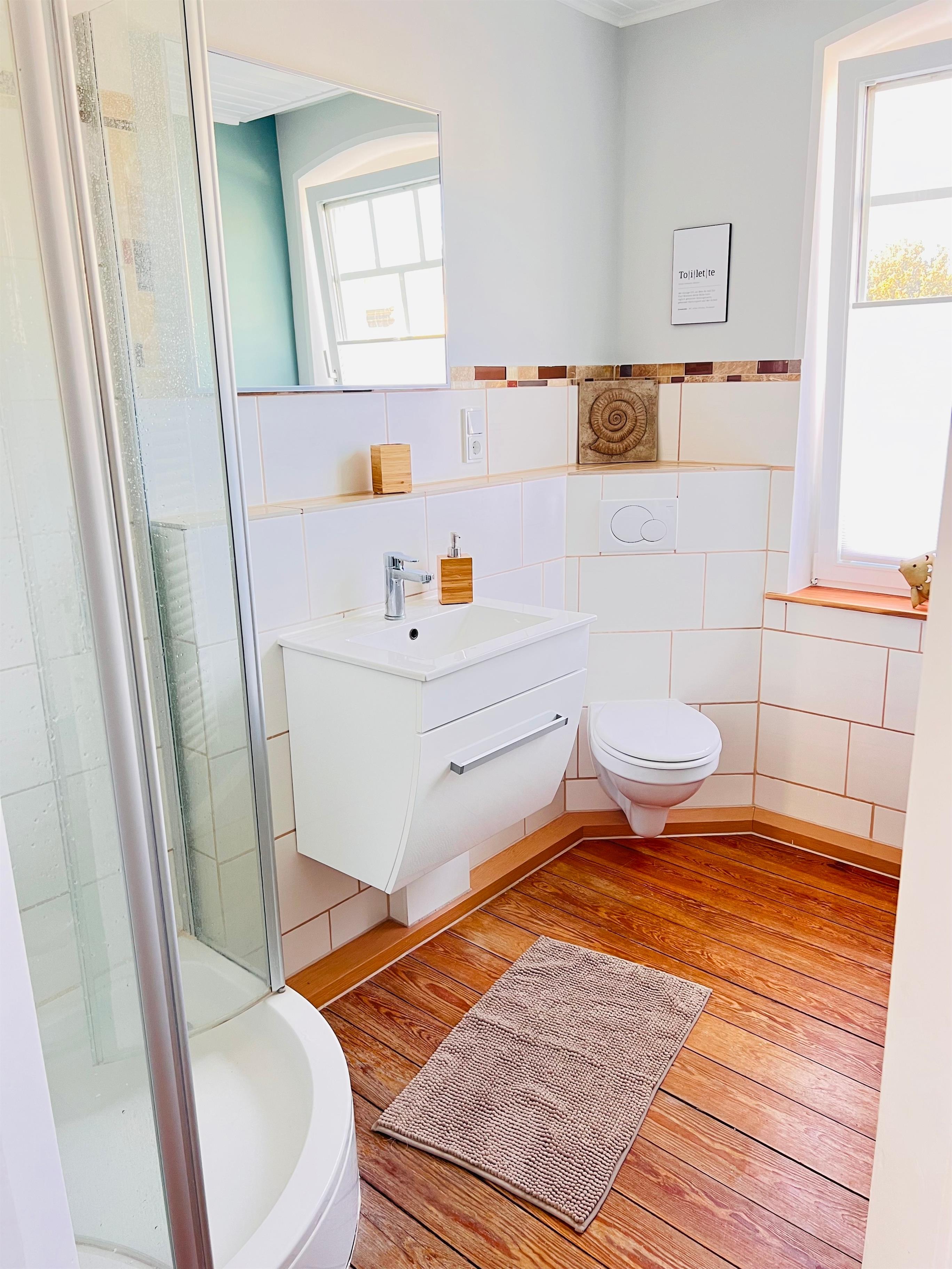 - Ein Badezimmer mit Dusche, WC, Fenster, Waschmaschine