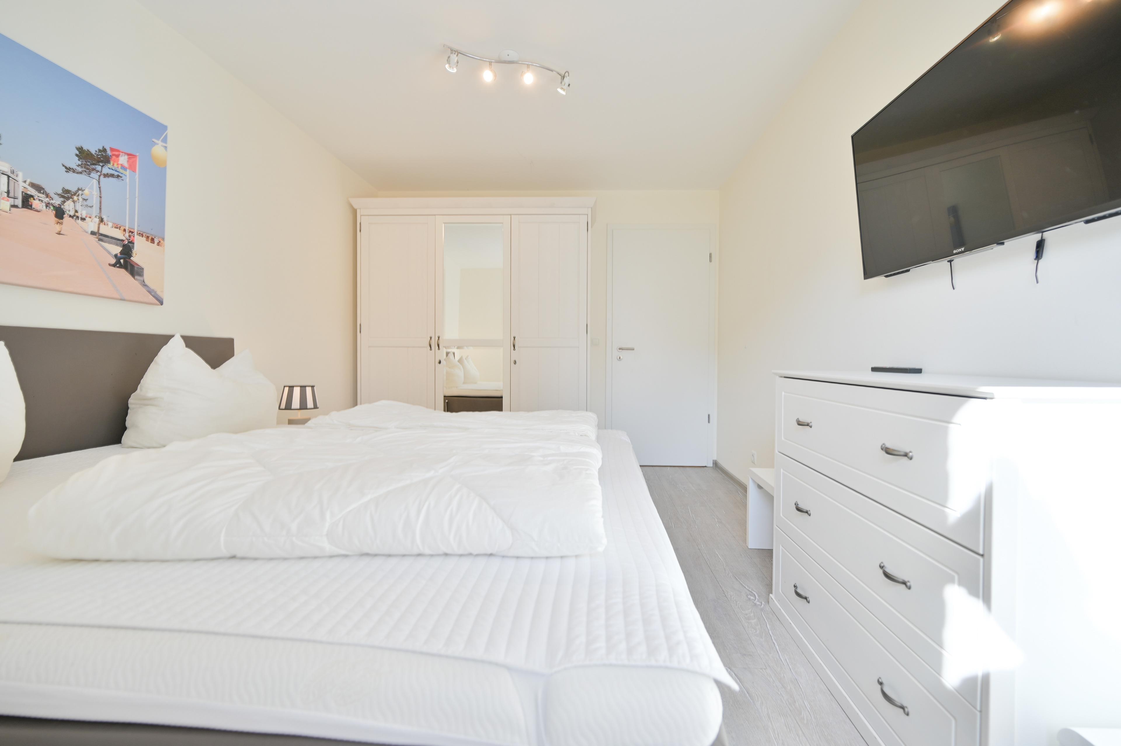 Im Schlafraum befinden sich außerdem ein zweites großes TV-Gerät und ein großer Kleiderschrank.