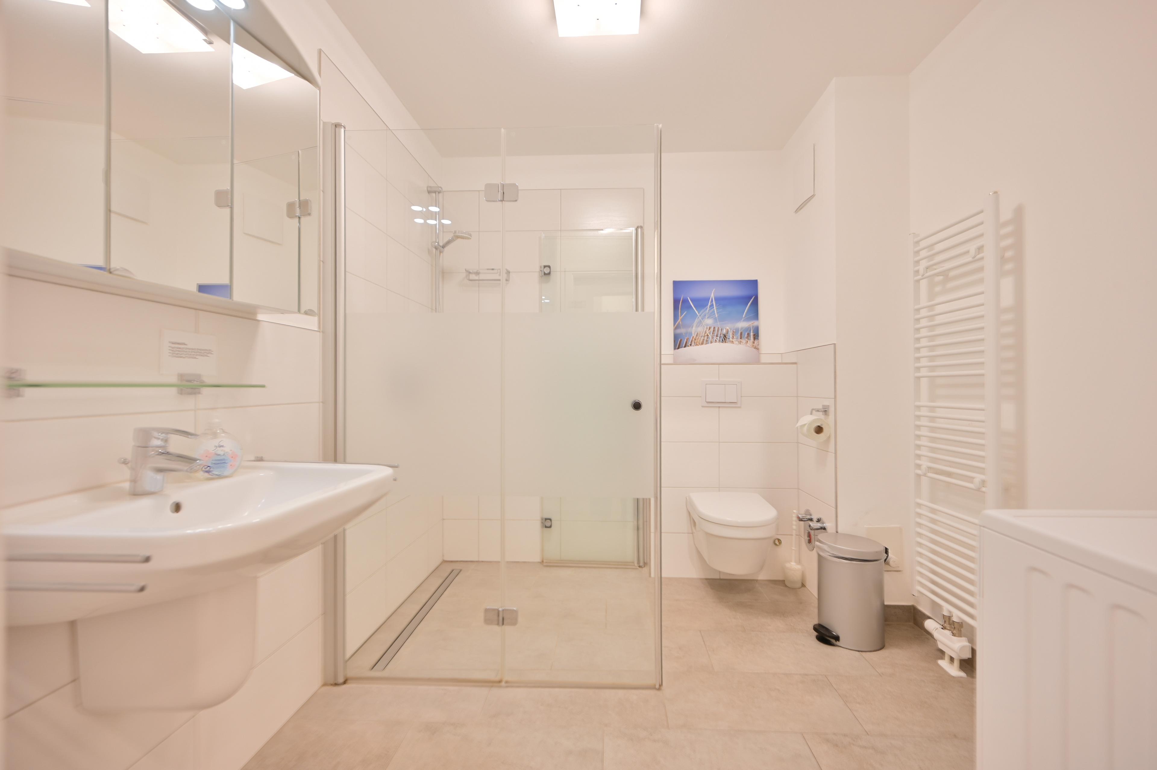 Das Badezimmer ist mit einer Dusche, WC, Spiegelschrank