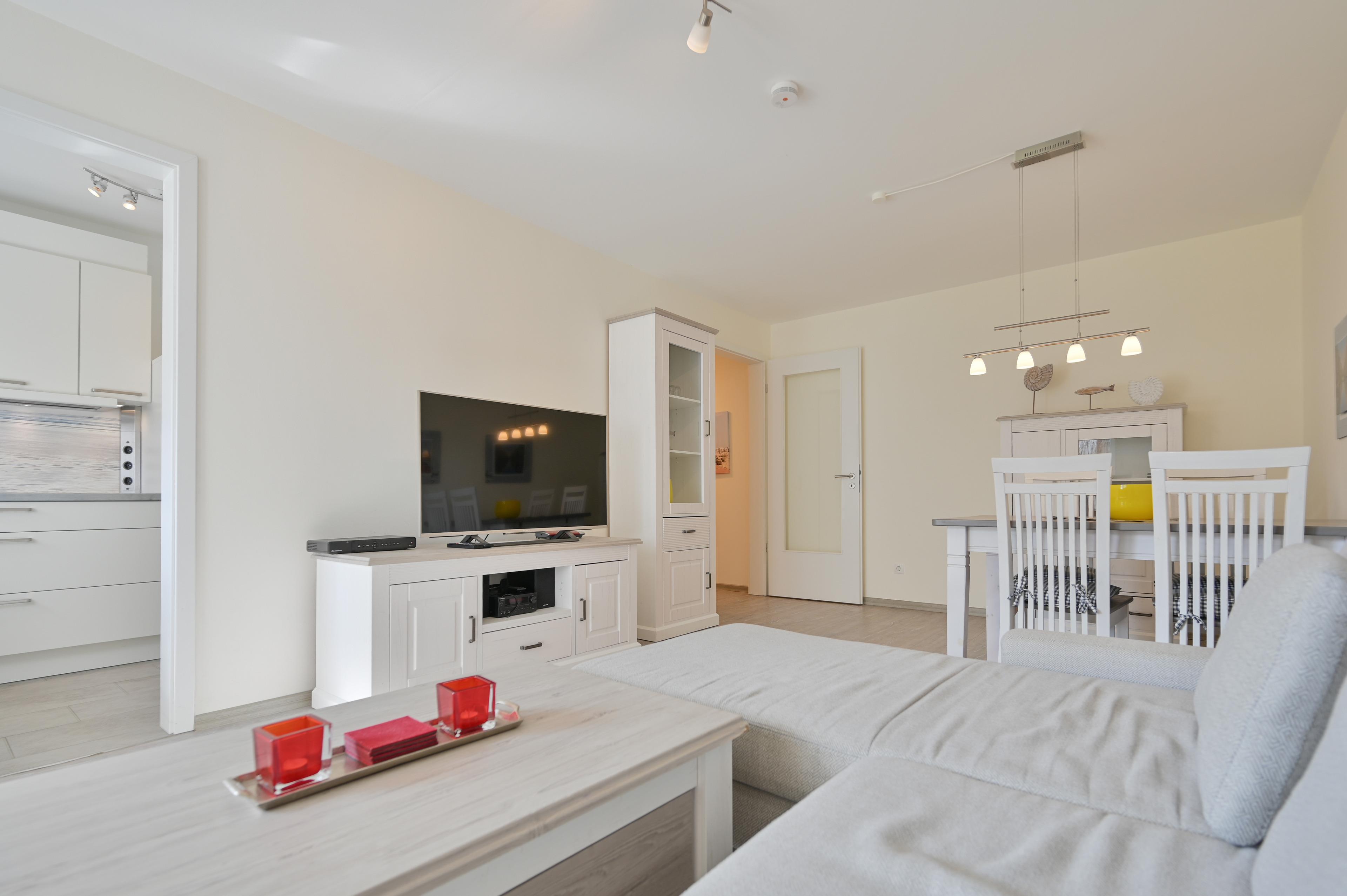 Das 2-Raum-Appartement verfügt über ein sonniges Wohn-Schlafzimmer mit Wohnzimmertisch, einem Sideboard und einer gemütlichen Eckcouch, die Gästen zusätzlich eine Schlaffunktion bietet.