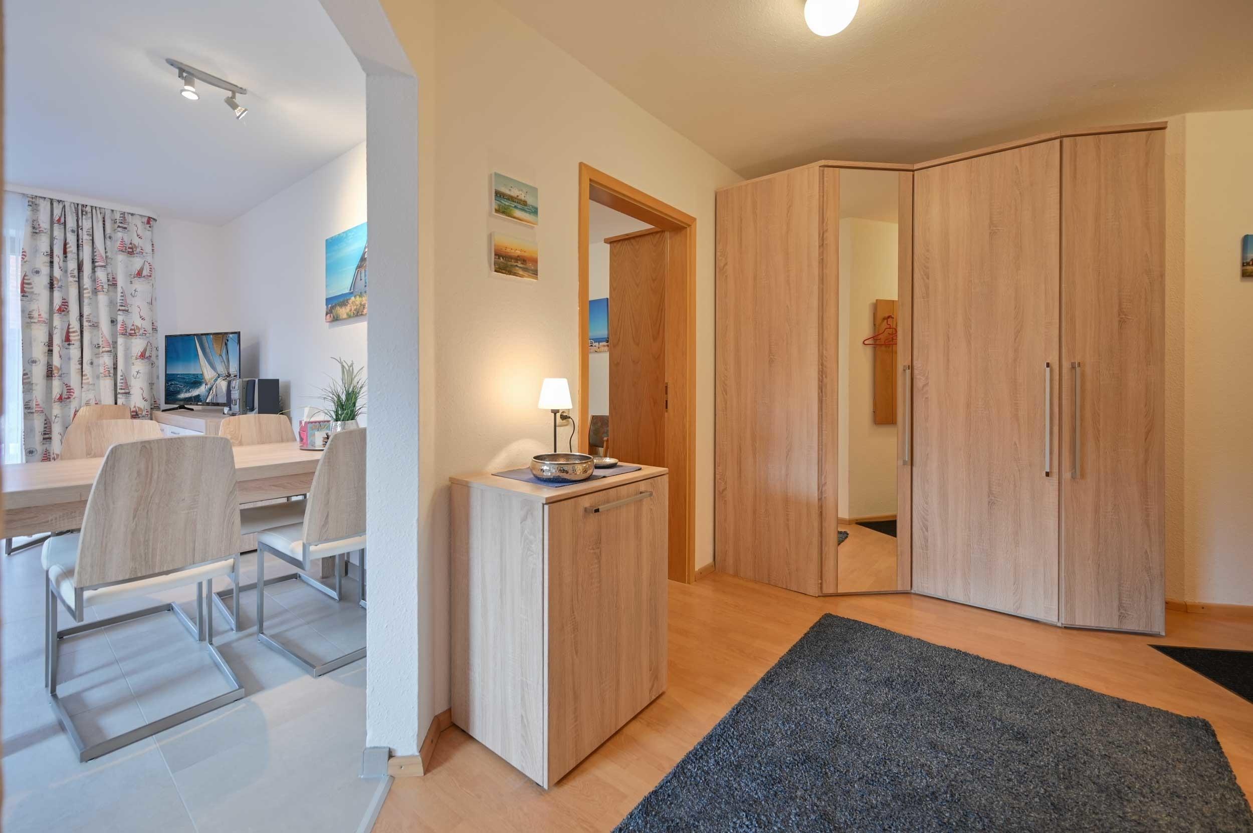 Im Flur steht eine Garderobe, Kommode, Schuhregal und ein großer Einbauschrank mit integriertem Spiegel.