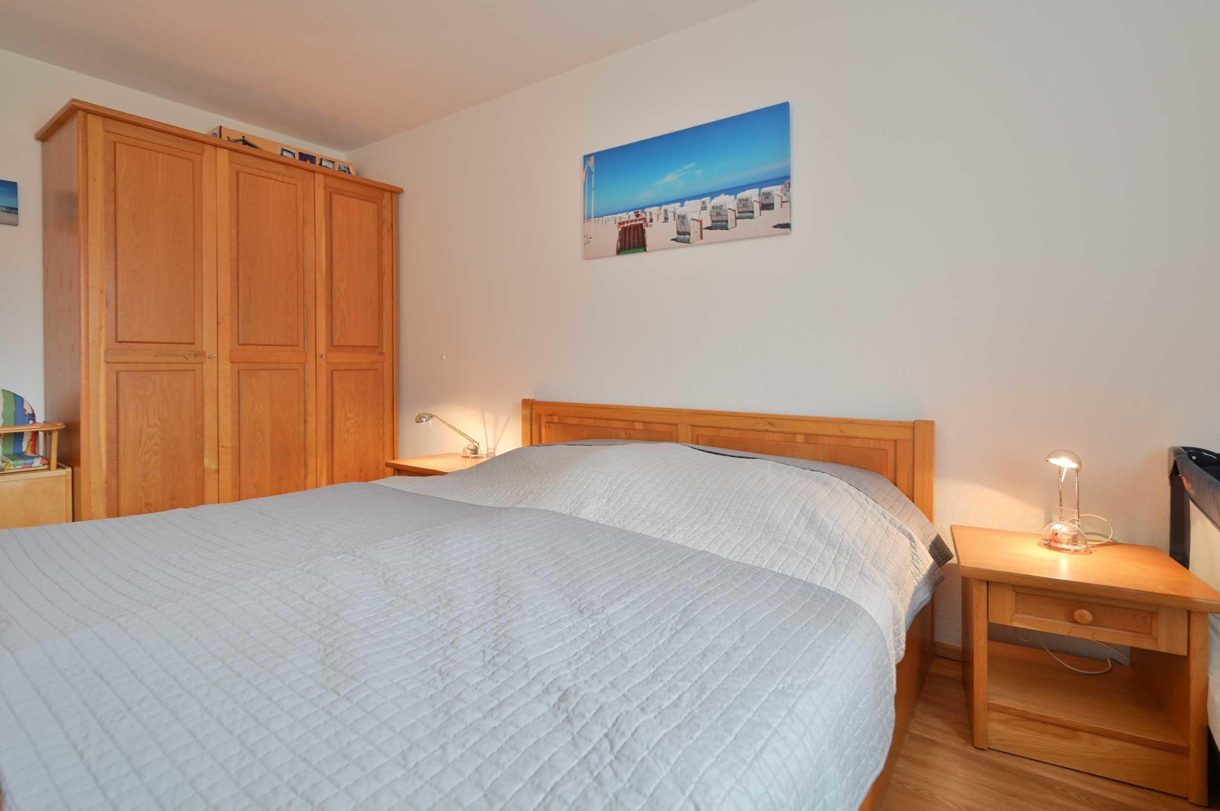 Zudem gehören zur Fewo ein separates Schlafzimmer mit Doppelbett (200 x 200cm), Nachttischen, Kleiderschrank und einem feststehenden Kinderbett