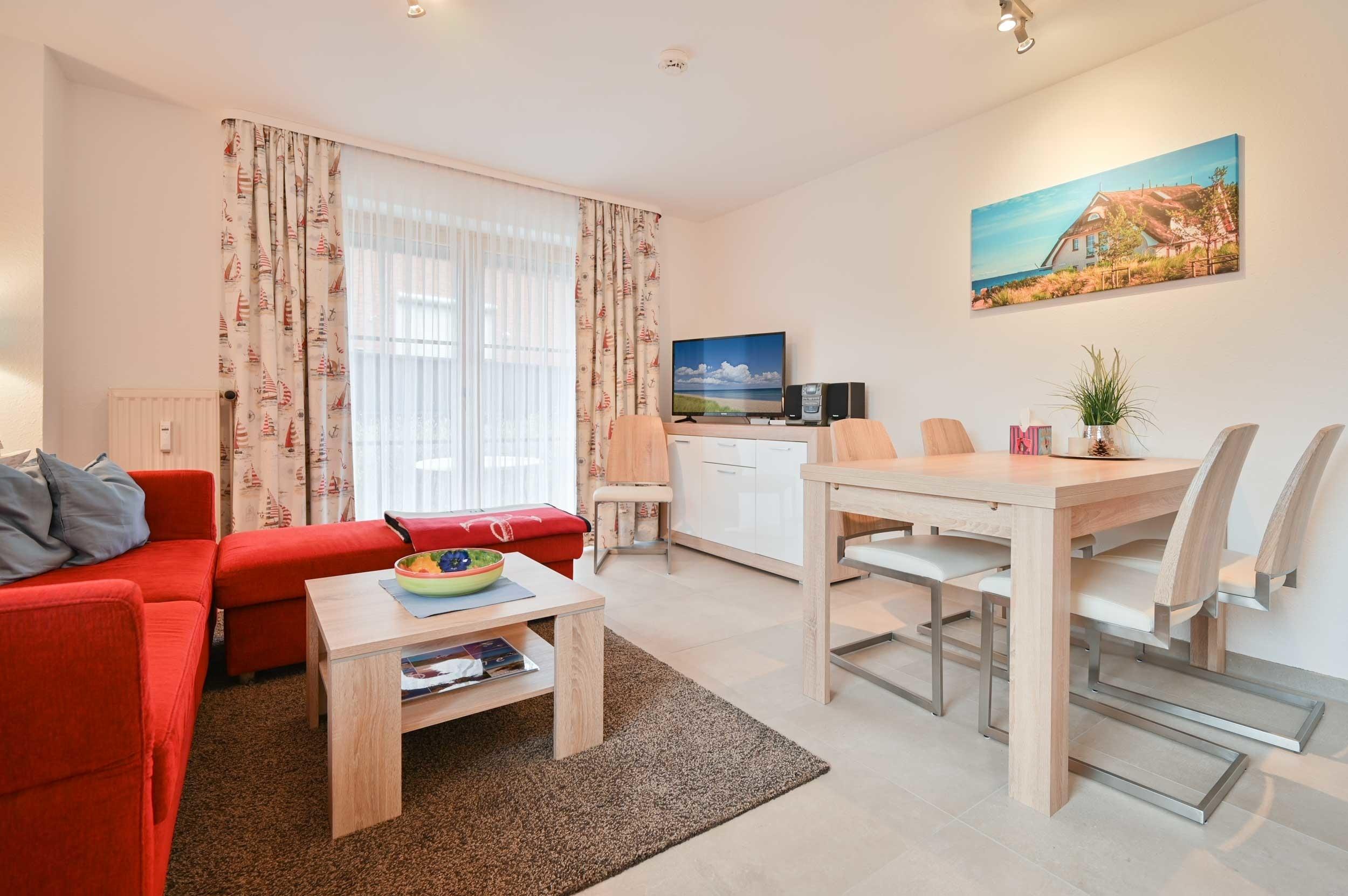 Die Ferienwohnung von Familie Starke im Ostseebad Dahme verfügt über ein Wohnschlafzimmer mit Schlafsofa, Couchtisch, Phonoschrank, integrierter Wohn-Küche (NEU 2021 eingebaut) und Esstisch der für bis zu 8 Personen ausgelegt ist.