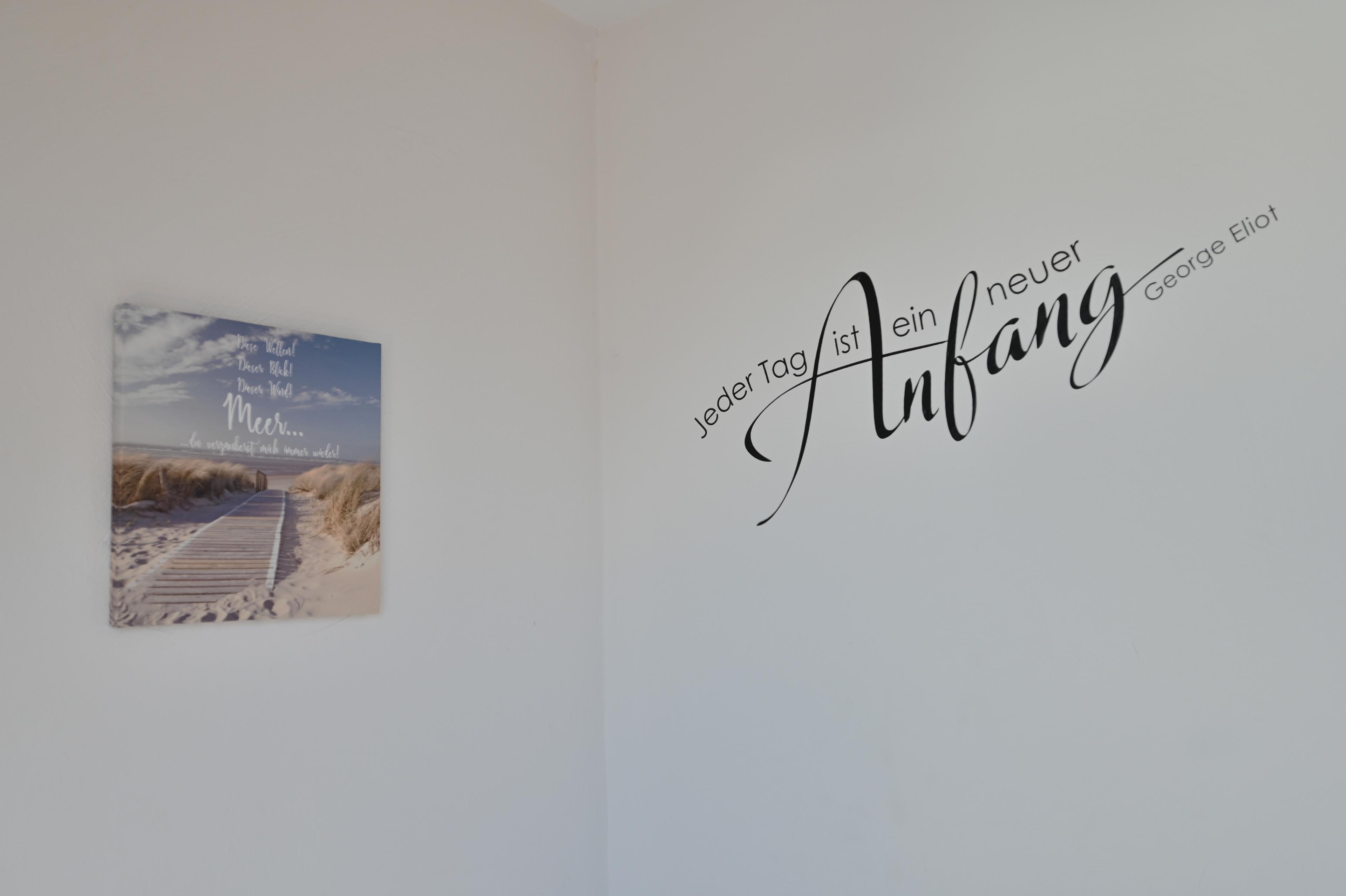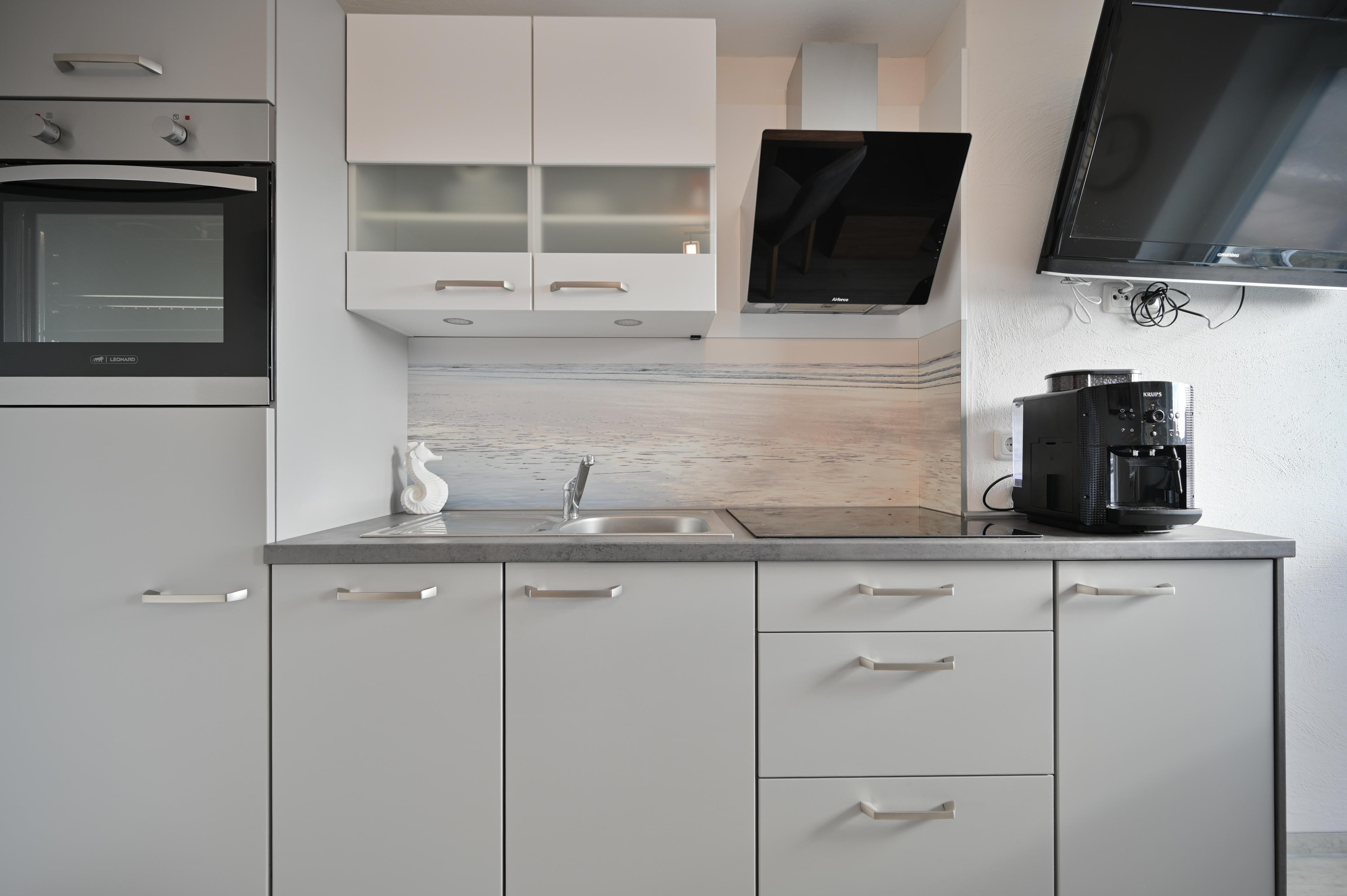 Die neue Küche verfügt über einen Backofen, ein Ceranfeld sowie eine Spülmaschine und einen Kaffeevollautomaten und eine Mikrowelle. Ebenfalls befindet sich im Wohn und Küchenbereich ein Essplatz für vier Personen, sowie einer Couch mit Schlaffunktion, Couchtisch und Flachbild-TV. Von hieraus besteht die Möglichkeit auf den sonnigen Balkonbereich mit Gartenmöbeln zu gelangen.