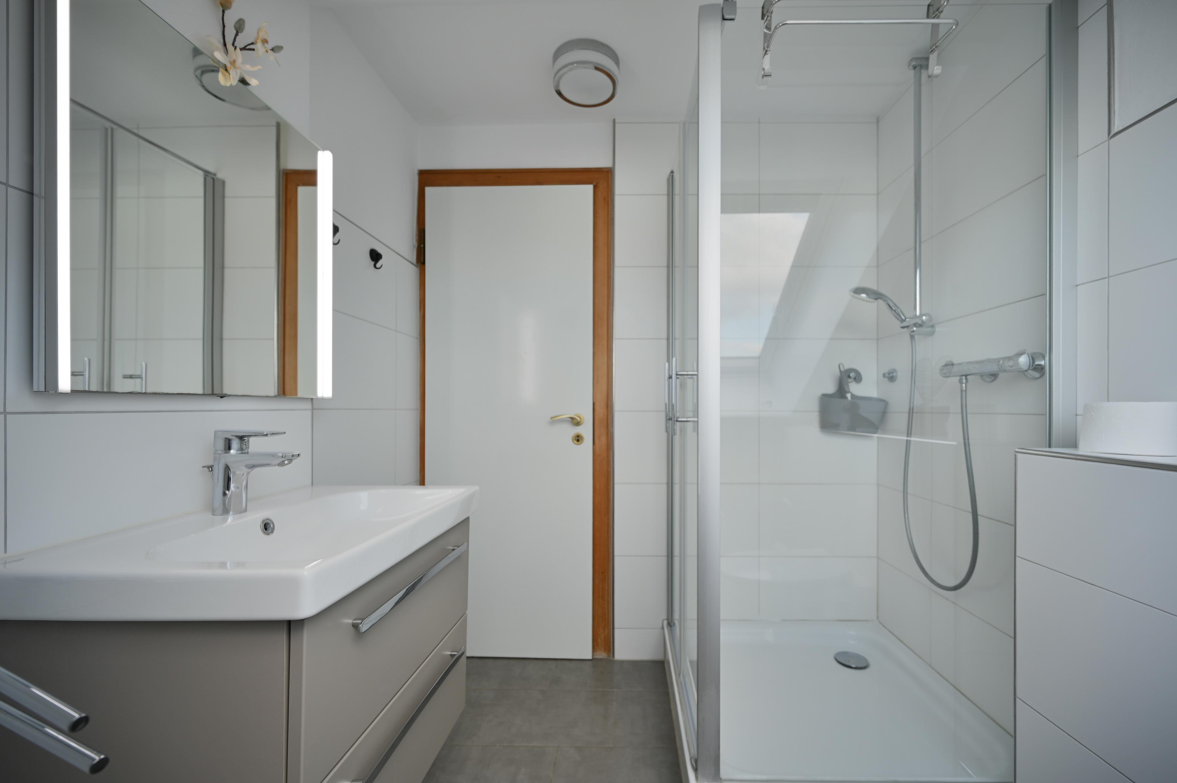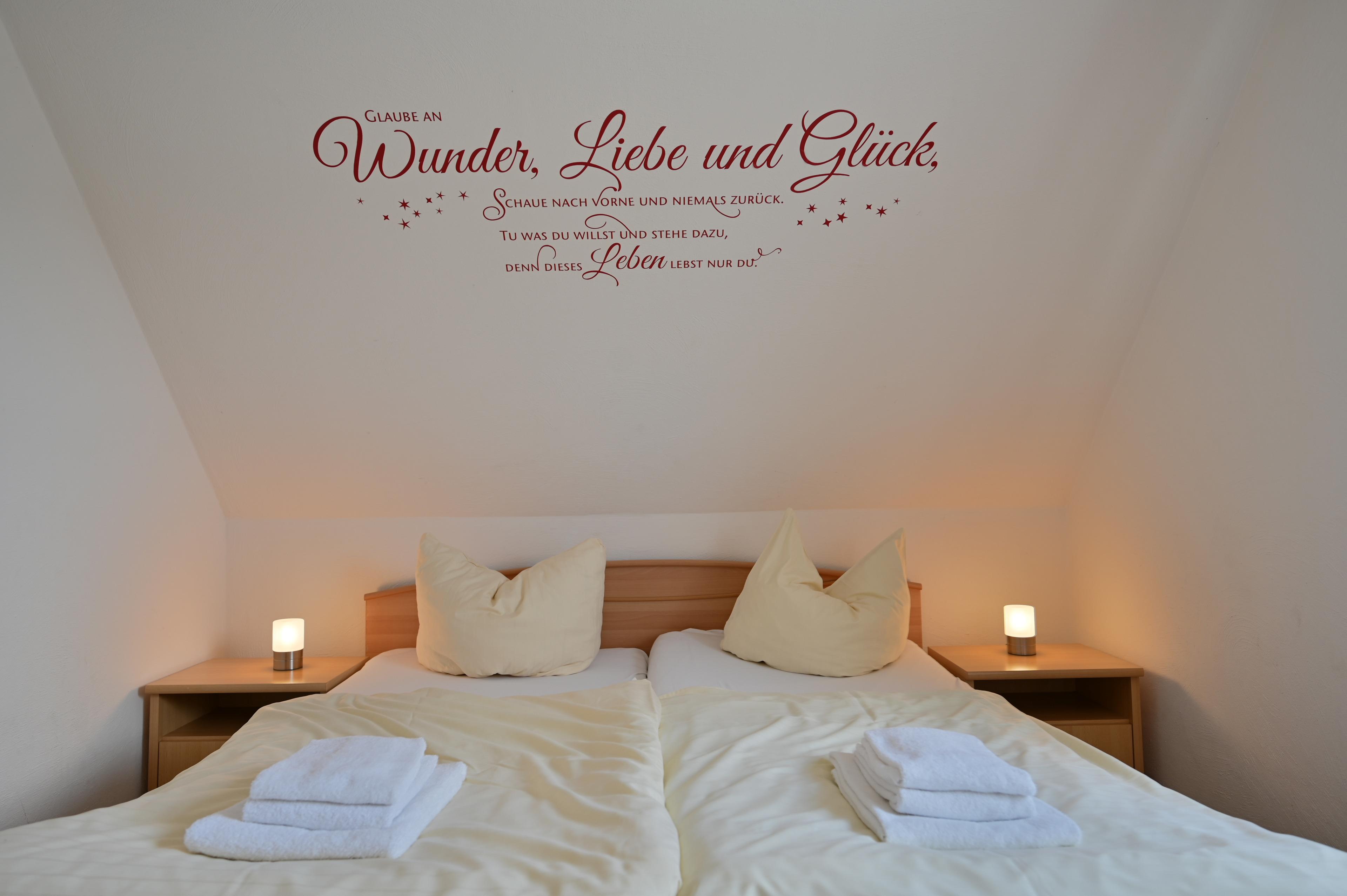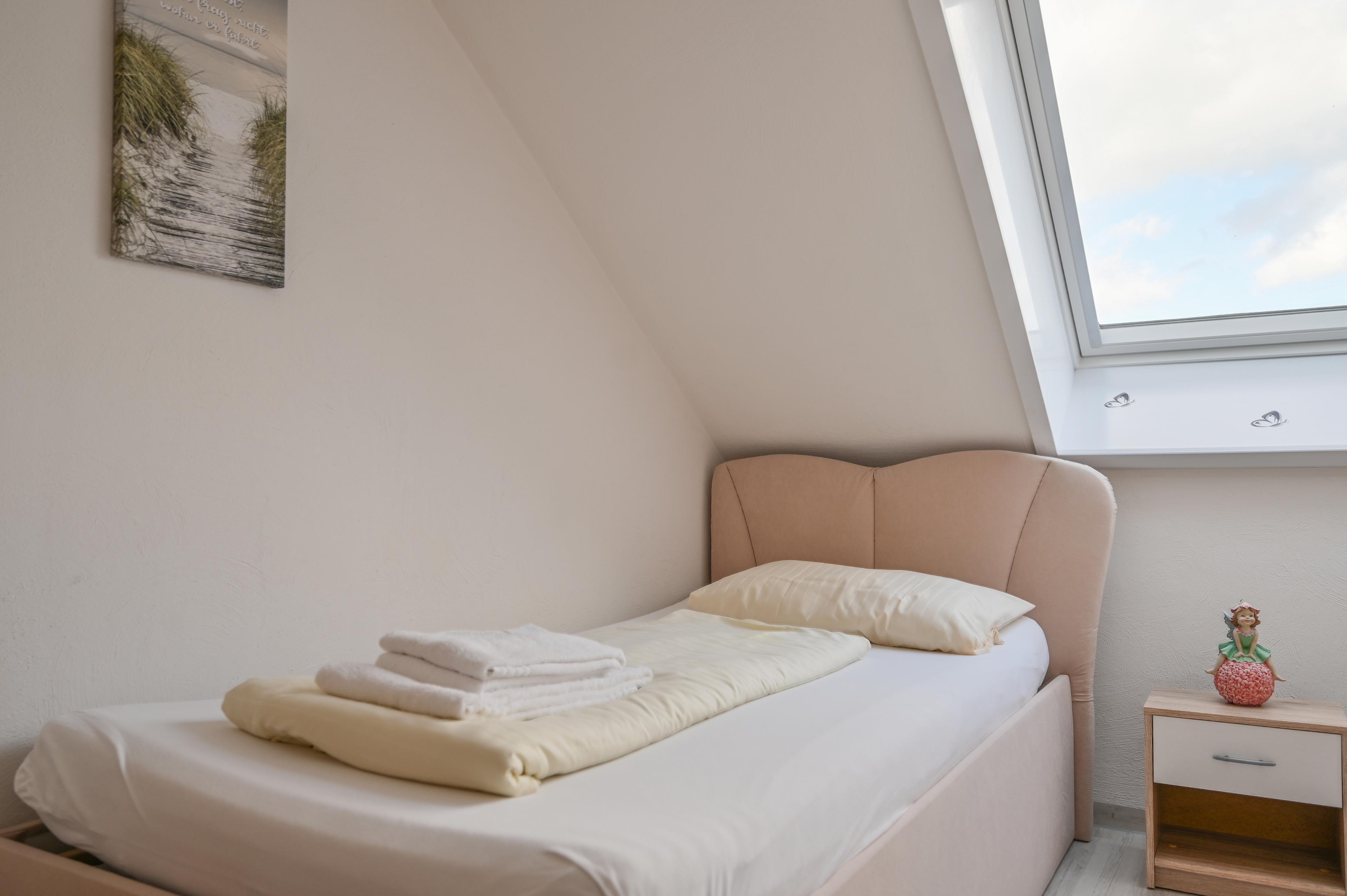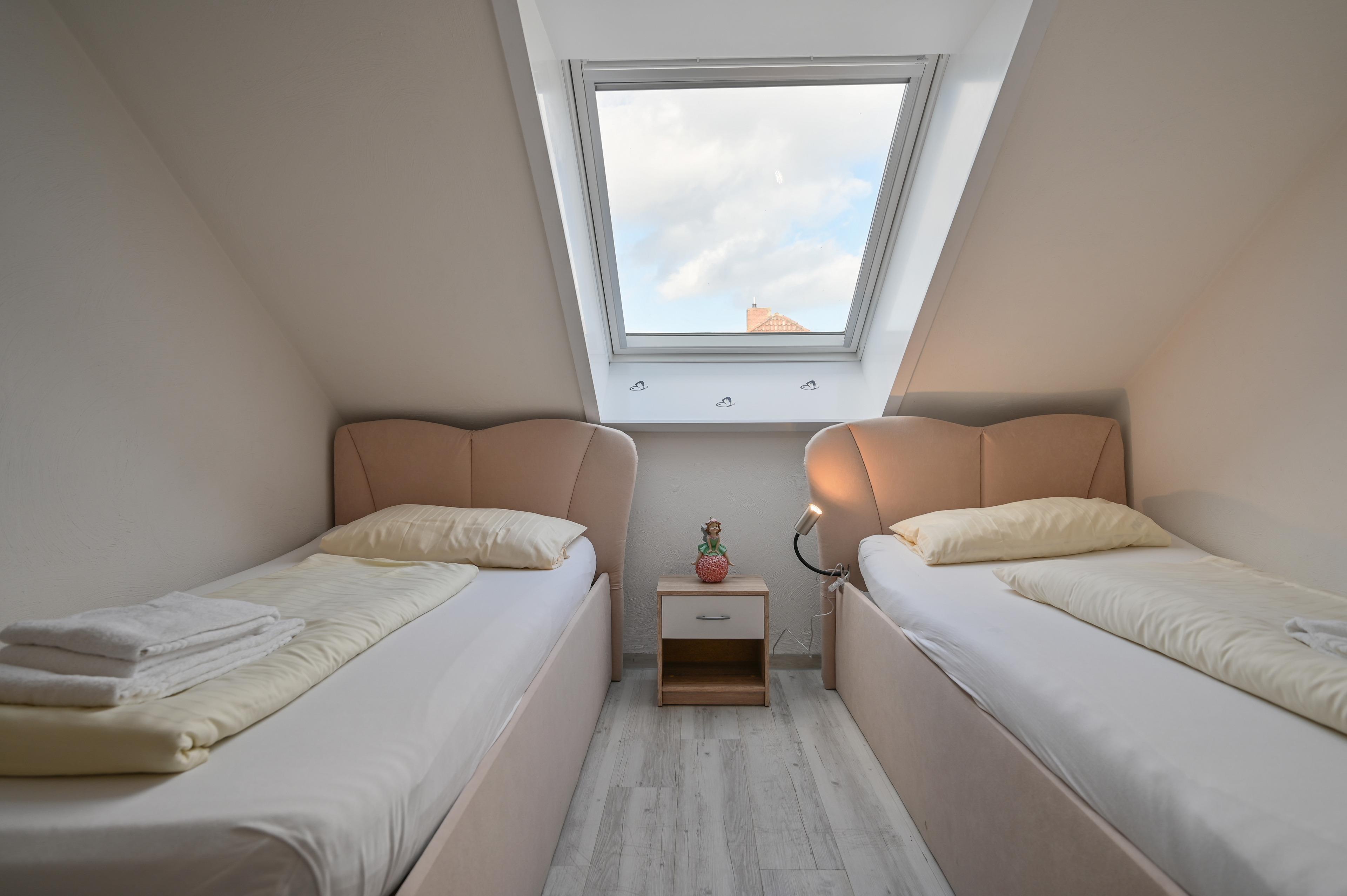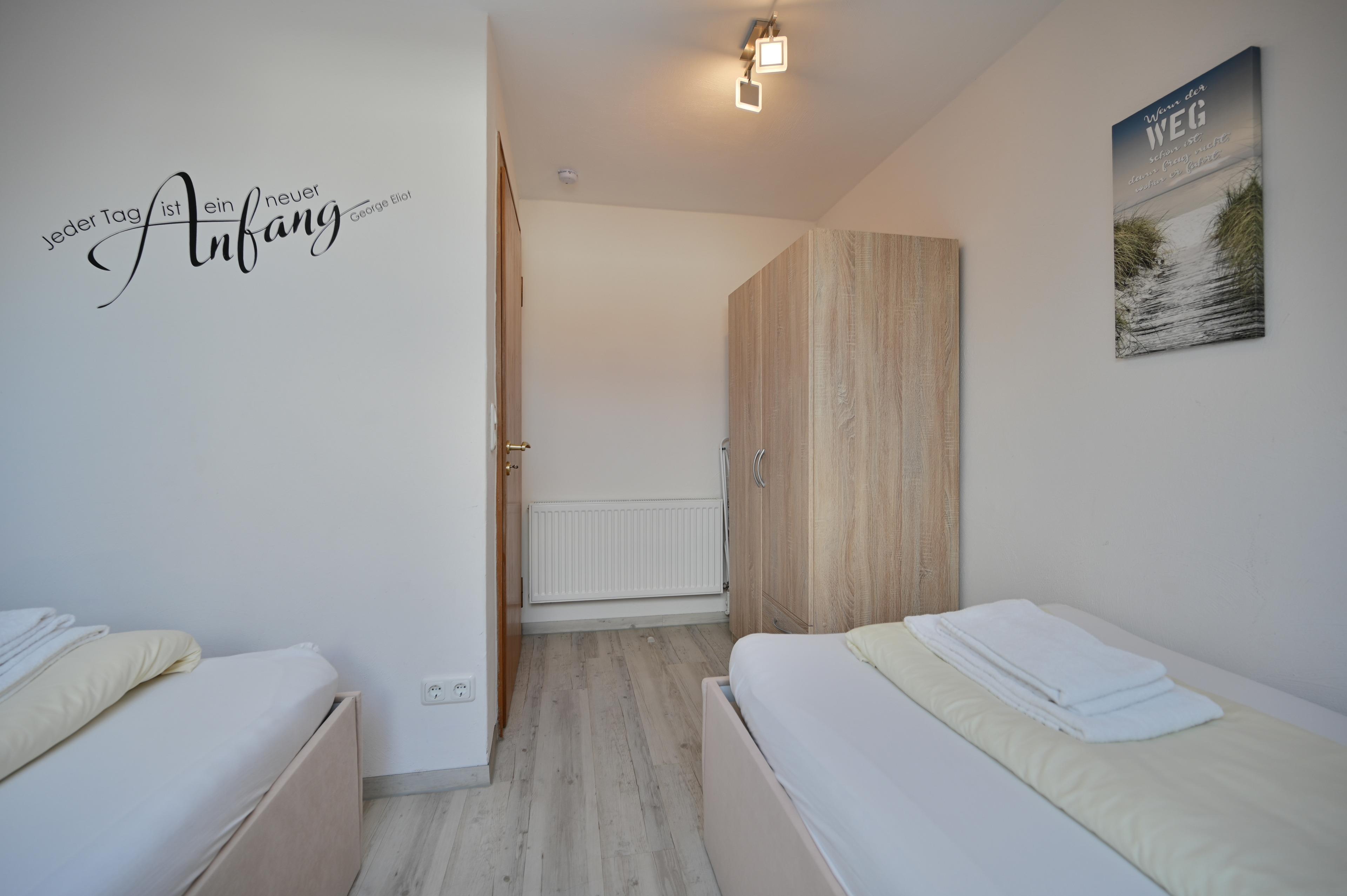 Das große Schlafzimmer besteht aus einem Doppelbett mit zwei Nachttischen und Kleiderschrank, dass zweite Schlafzimmer verfügt über zwei Einzelbetten mit Kleiderschrank. Sollte ein Kleinkind mitreisen, steht ein Kinderreisebett und ein Hochstuhl bereit. Das Badezimmer verfügt über ein Außenfenster zum Lüften und besteht aus einer Dusche mit Glastüren und einem WC.