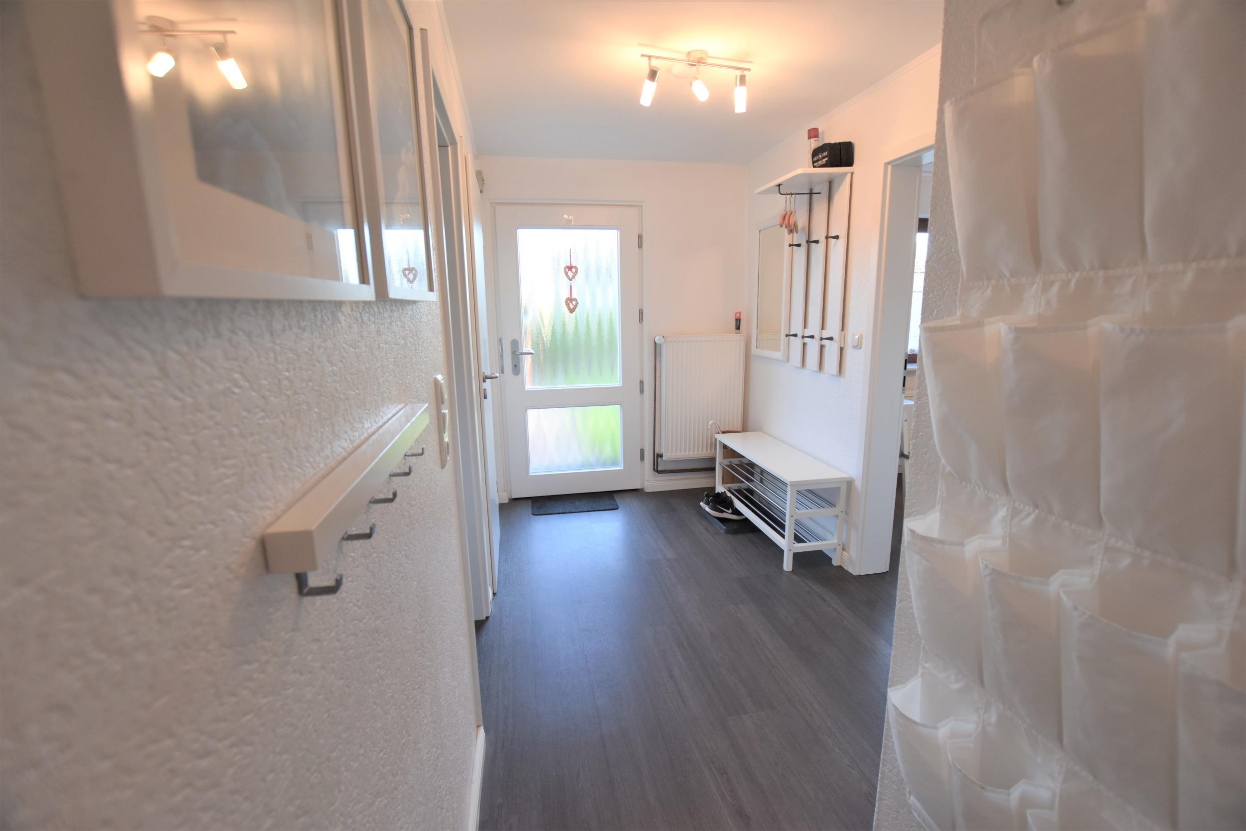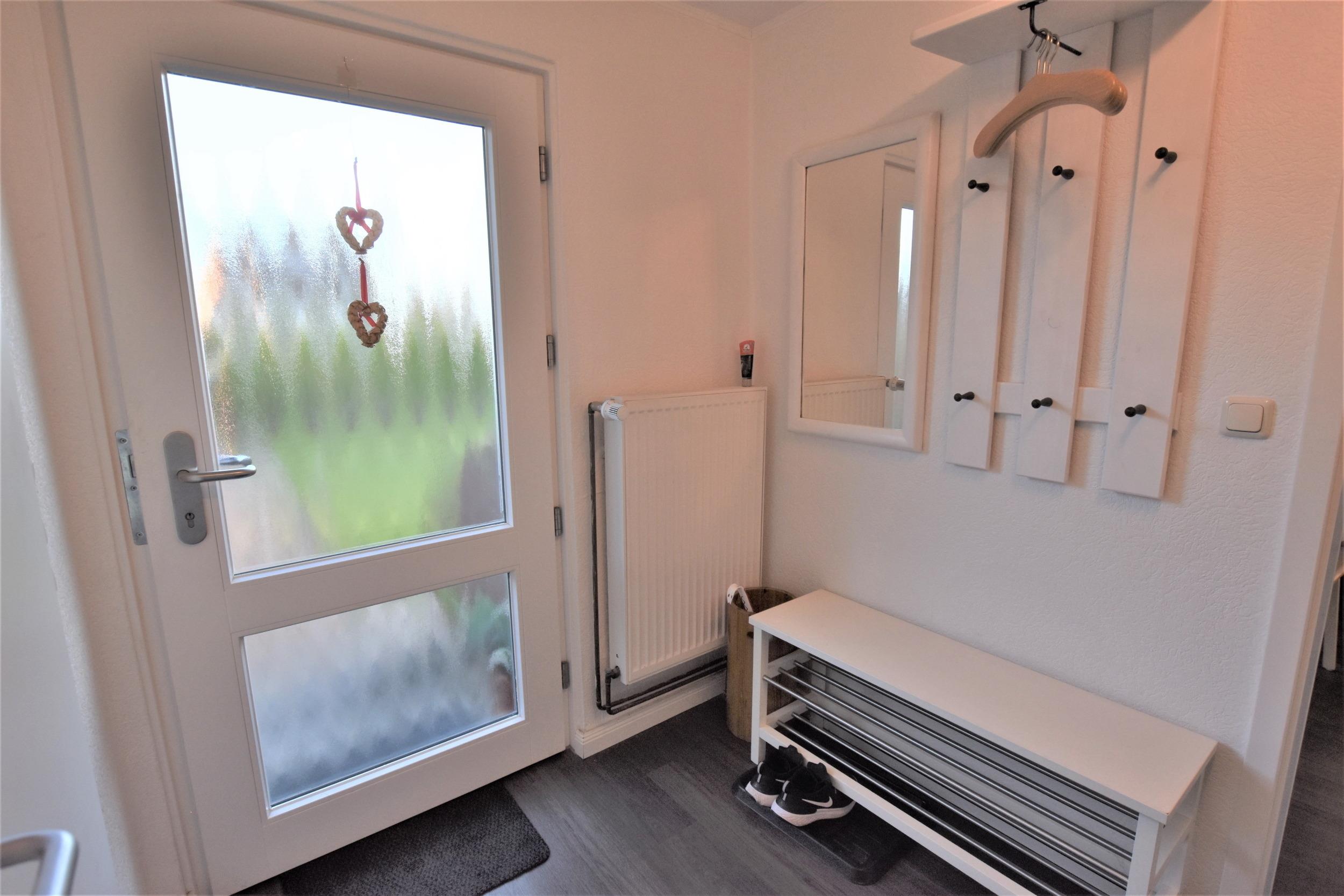 Eingangsbereich mit Garderobe. Duschbad mit WC, bodentiefer Dusche und Fenster. Schlafzimmer (1) Doppelbett (2*90*200cm), TV, Kleiderschrank, Nachttisch und Verdunklungsvorhänge. Vollausgestattete Küche mit Tresen und einer separaten Sitzgruppe. Großes Wohnzimmer mit gemütlicher Sitzgelegenheit, Stubentisch, TV, Blu-ray Player, Radio, Esstisch mit Stühlen für 8 Personen und direkter Zugang zum eingezäunten Garten mit bestuhlter Terrasse.