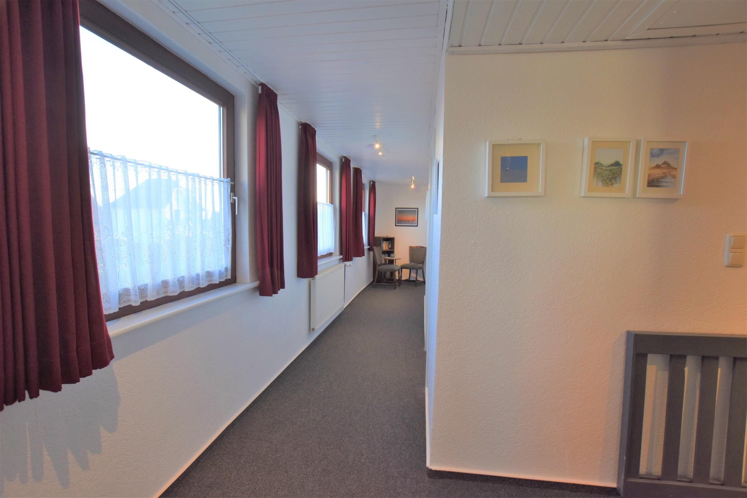 Flur mit Zugang zu den Räumen. Schlafzimmer (2) 2 Einzelbetten(90*200cm), Kleiderschrank, Nachttisch und Verdunklungsvorhänge. Schlafzimmer (3) Doppelbett (2*90*200cm), Kleiderschrank, TV, Nachttisch und Verdunklungsvorhänge. Schlafzimmer (4) Doppelbett (2*90*200cm), TV, Kleiderschrank, Kinderbett, Nachttisch und Verdunklungsvorhänge. Außerdem befindet sich im Obergeschoss ein zweites Bad mit Badewanne und Duschfunktion und WC.