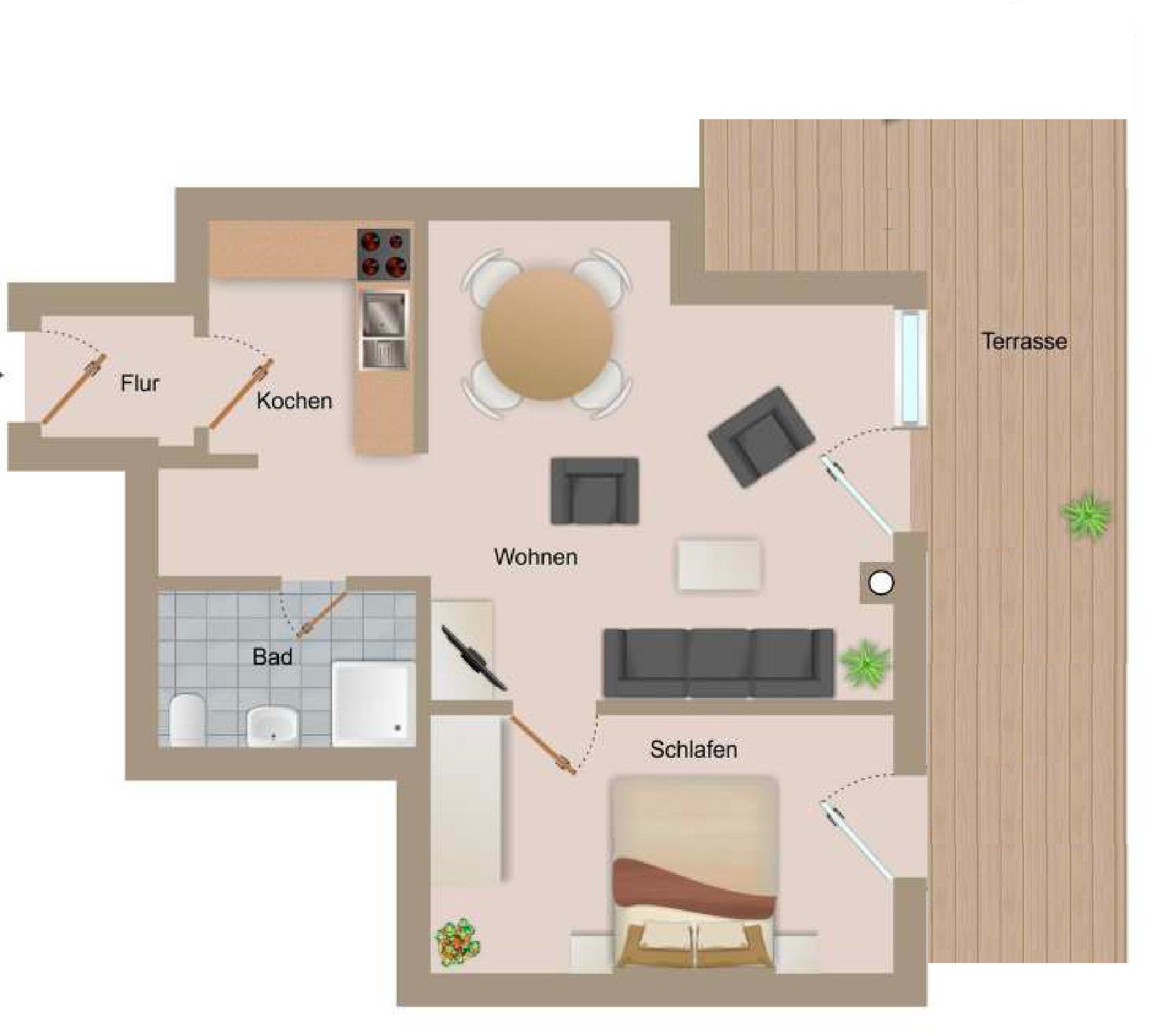 Die modern eingerichteten Ferienwohnung hat auf 52m² ausreichend Platz für 2 Personen. 2 weitere Personen finden auf dem Schlafsofa im Wohnzimmer ihre wohlverdiente Ruhe in der Nacht.