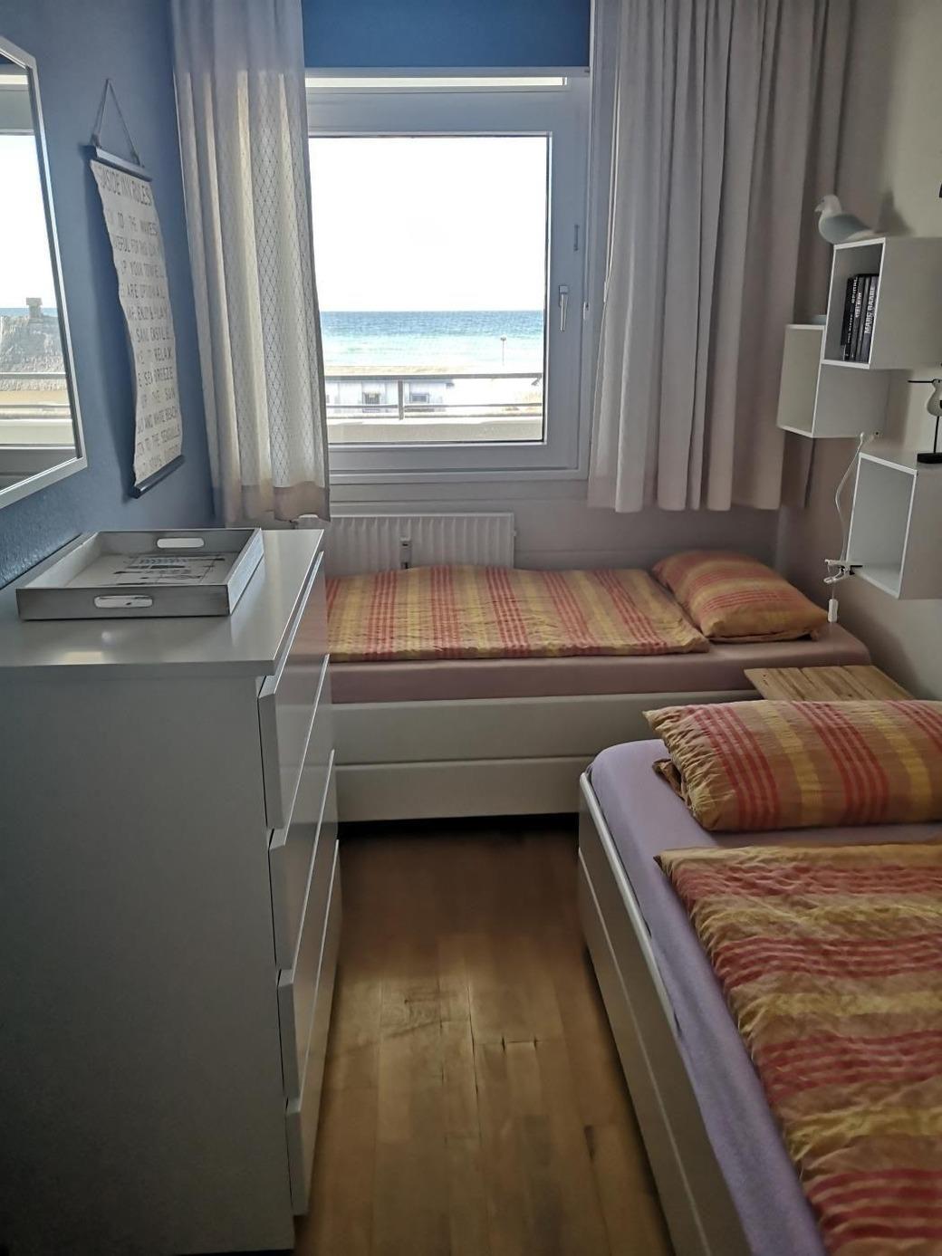 Durch den hauseigenen Zugang zum Strand sind kurze Wege garantiert. Das Wohnzimmer besitzt eine gemütliche Sitzecke und eine Essecke mit Durchreiche zur Küche. Einbauküche und Duschbad sind sehr hochwertig und gut ausgestattet. Es gibt ein separates Schlafzimmer mit zwei Einzelbetten.
