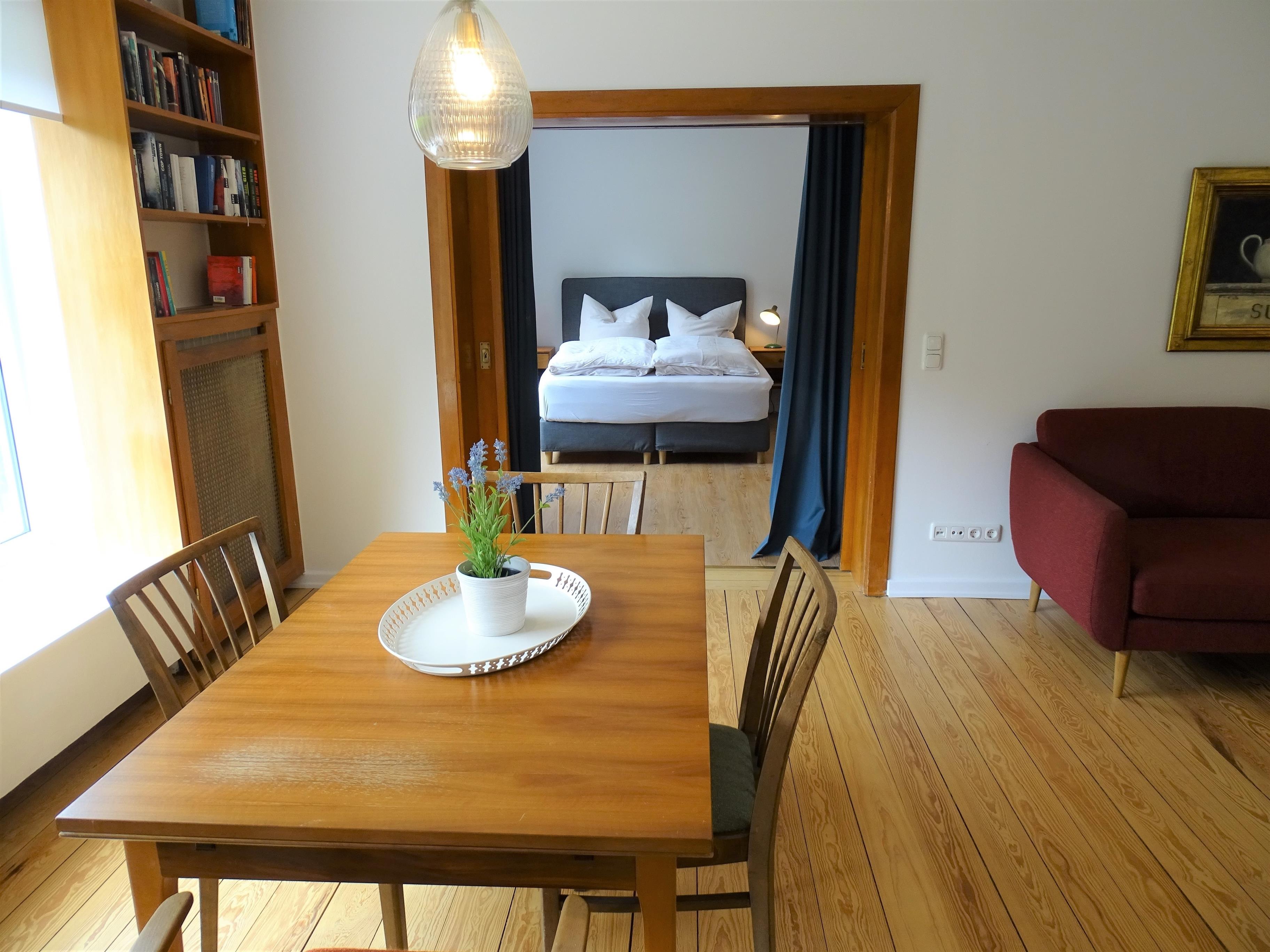 Die Ferienwohnung verfügt über 3 Zimmer, unterteilt in ein lichtdurchflutetes Wohnzimmer mit 2 Couchen, TV und Esstisch mit Bestuhlung. In dem angrenzenden Entspannungszimmer warten 2 gemütliche Ohrensessel auf Sie. In den 2 Schlafzimmern befinden sich je ein Boxspringbett ( 1,80 m x 2,00 m ), ein Kleiderschrank sowie ein TV.