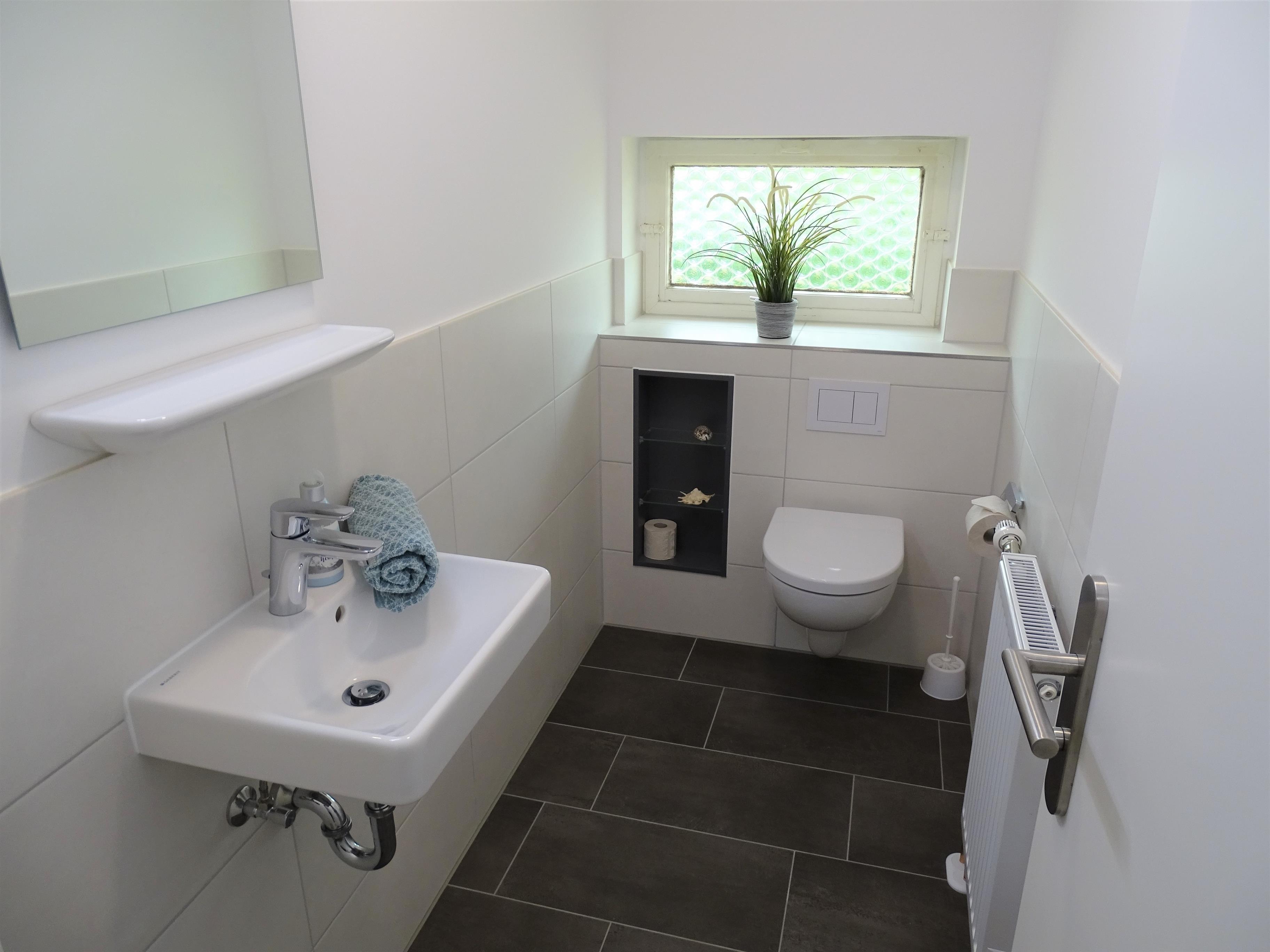 Das geräumige Bad verfügt über eine ebenerdige Dusche, Handwaschbecken und einen Waschtrockner, das WC befindet sich separat.