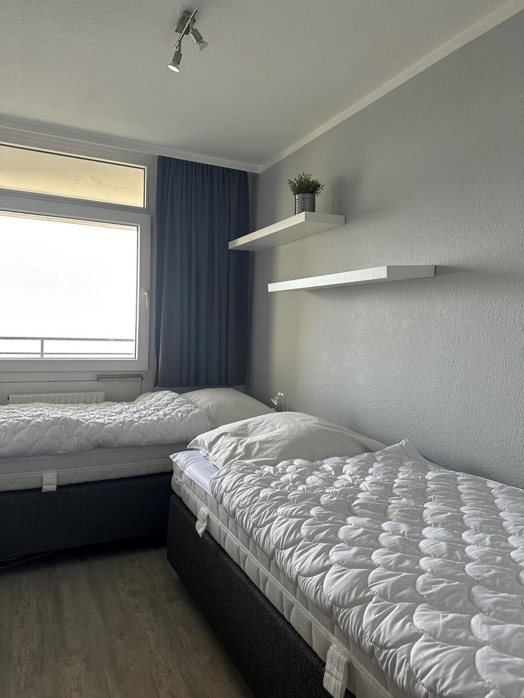 Mit dem Fahrstuhl oder auch mit der Treppe kommen Sie in jede Etage. Die Wohnung 42 befindet sich in der 4. Etage und hat herrlichen Seeblick. Das Wohnzimmer hat eine gemütliche Sitzecke, welche man zu einer Schlafmöglichkeit wandeln kann, Essecke und natürlich einen Balkon sind auch vorhanden. Das Bad enthält eine Dusche und WC. Im Schlafzimmer befinden sich zwei Einzelbetten. Die Küche ist ausgestattet mit Geschirrspüler etc. und hat eine Durchreiche zum Essbereich im Wohnzimmer.