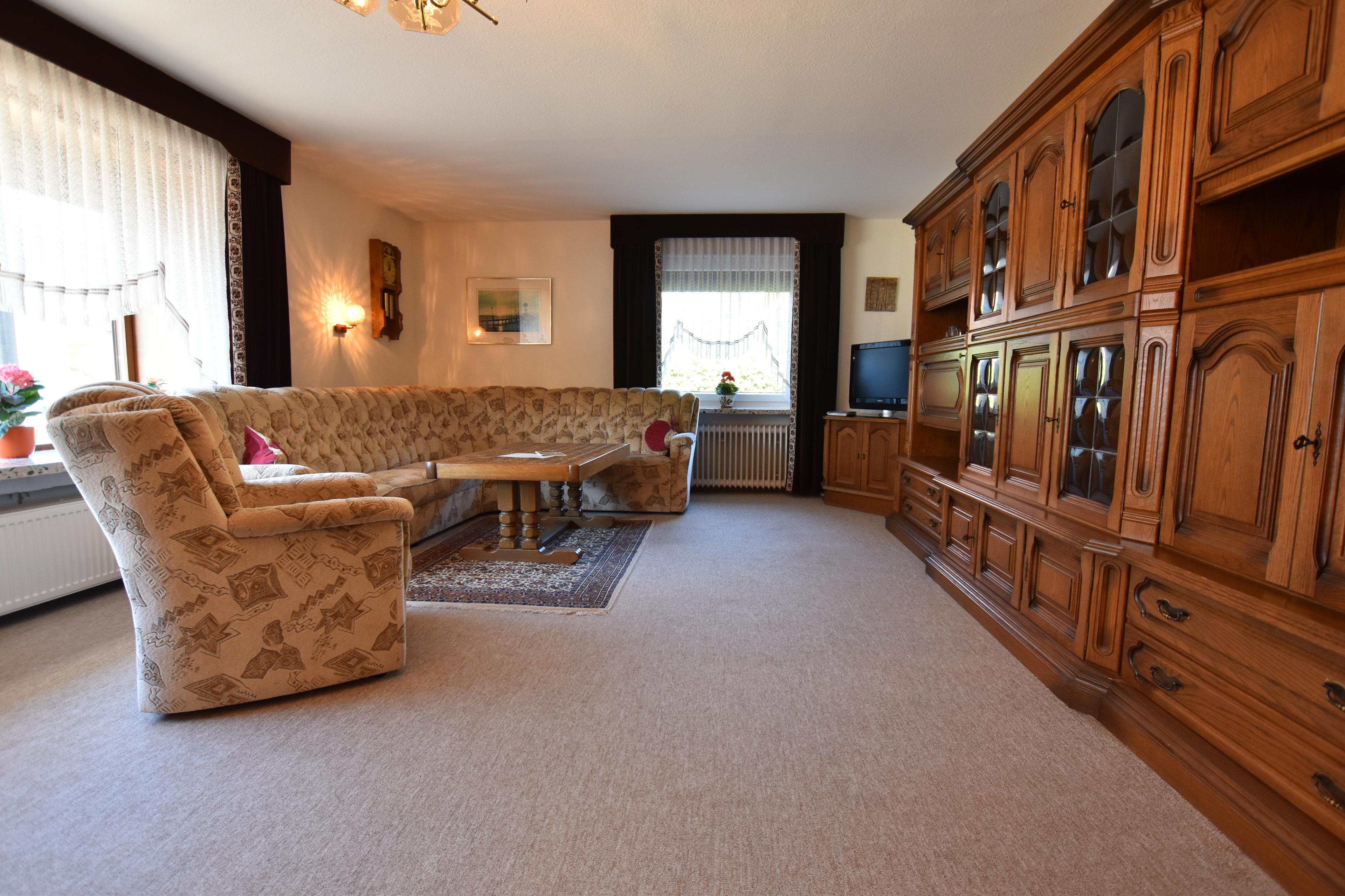 Unsere Ferienwohnung 3 liegt komplett im Erdgeschoss und bietet auf 120 qm bis zu 6 Erwachsenen und 1 Kind mit Babybett ausreichend Platz. Neben 2 Schlafzimmern mit Doppelbett und 2 Einzelbetten verfügt das Wohnzimmer zusätzlich bei Bedarf auch über ein Schrankbett, in dem zwei weitere Erwachsene schlafen können. Die max. Personenzahl von 6 Personen darf jedoch nicht überschritten werden.In der separaten Küche finden Sie auch das Esszimmer mit Sitzecke und zusätzlichem Esstisch. Weiterhin verfügt die Wohnung über zwei Bäder, einmal mit Dusche und einmal mit Badewanne sowie eine weitere Gästetoilette. Ebenso gehört zur Wohnung ein Garten mit Liegewiese, Terrasse sowie Gartenstühlen.