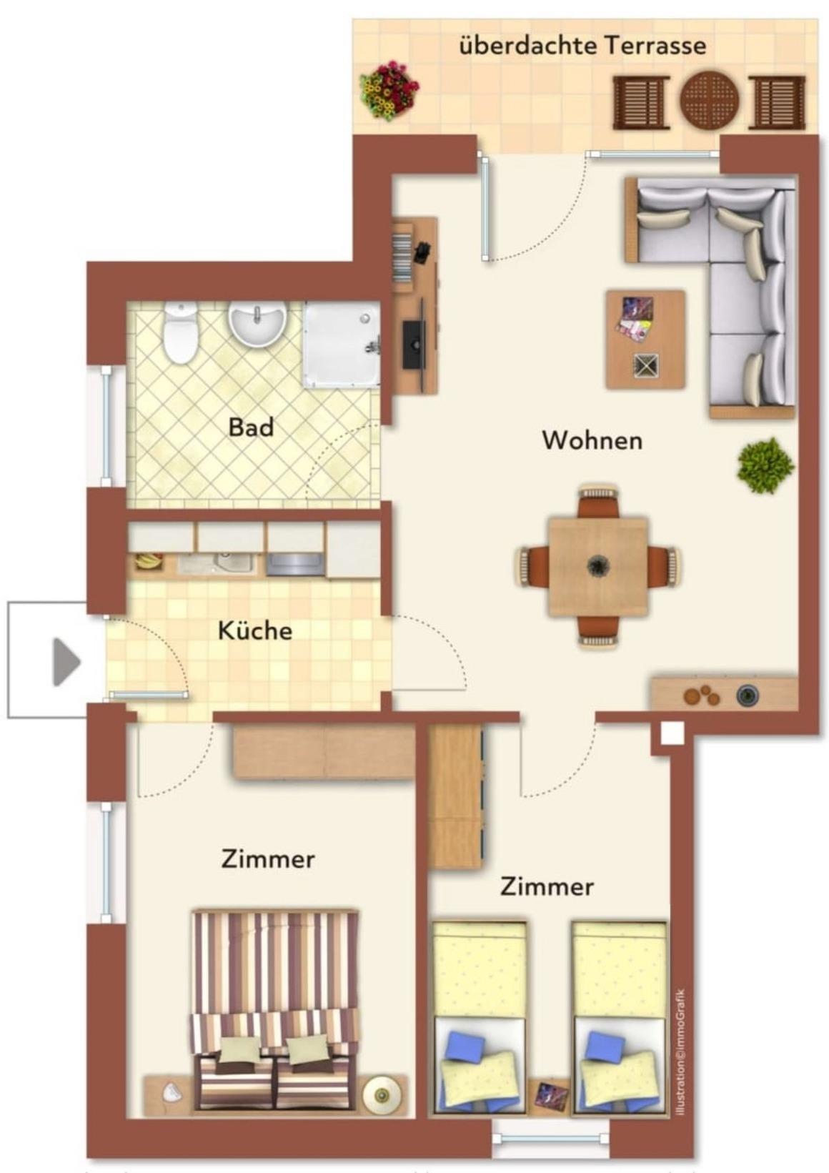 • Wohn-/Essbereich: Zugang zur möblierten Südterrasse für entspannte Abende im Freien.