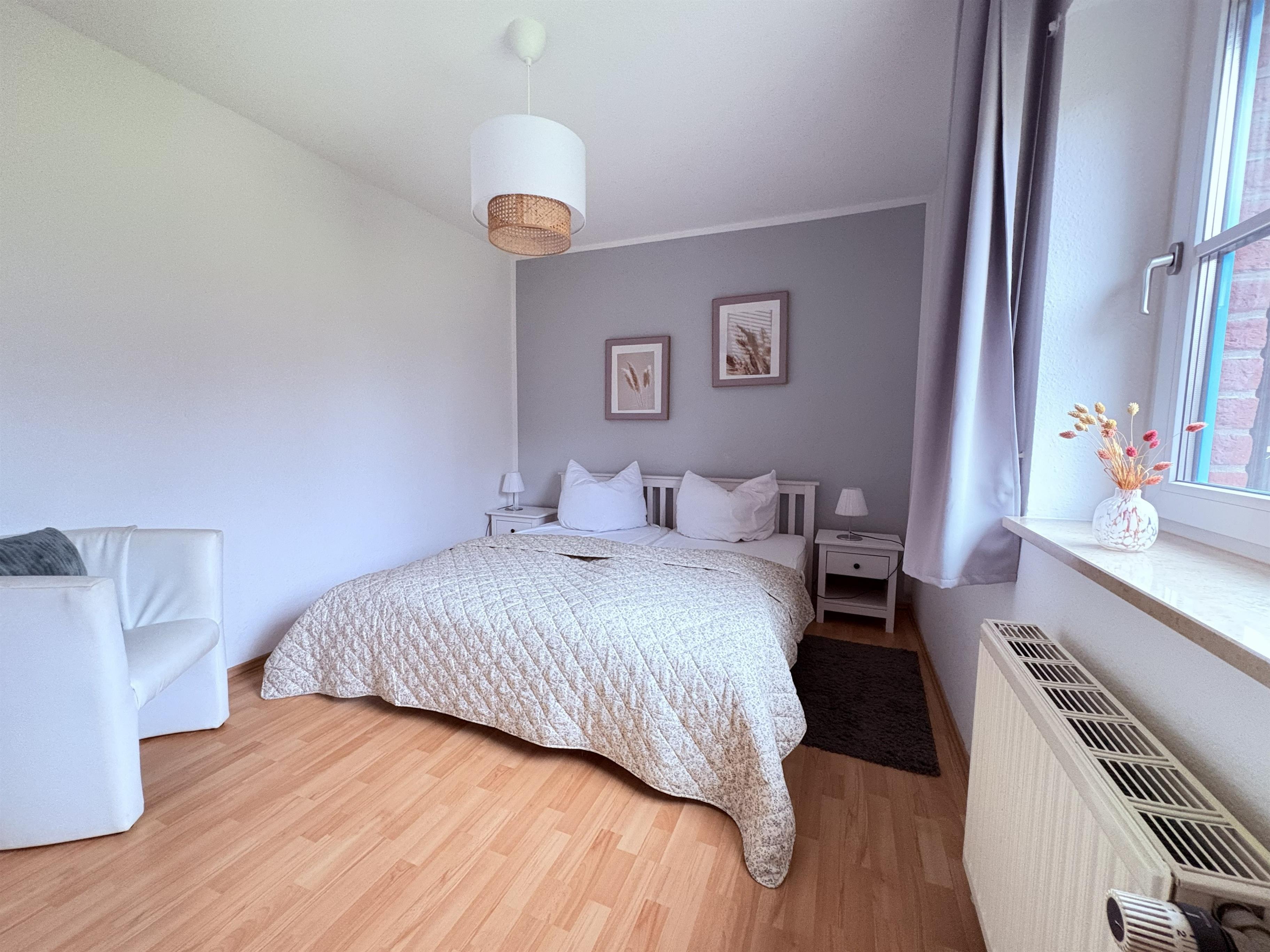 • Schlafzimmer 2: Doppelbett (180x200 cm), Kleiderschrank, Fenster mit Rollladen.