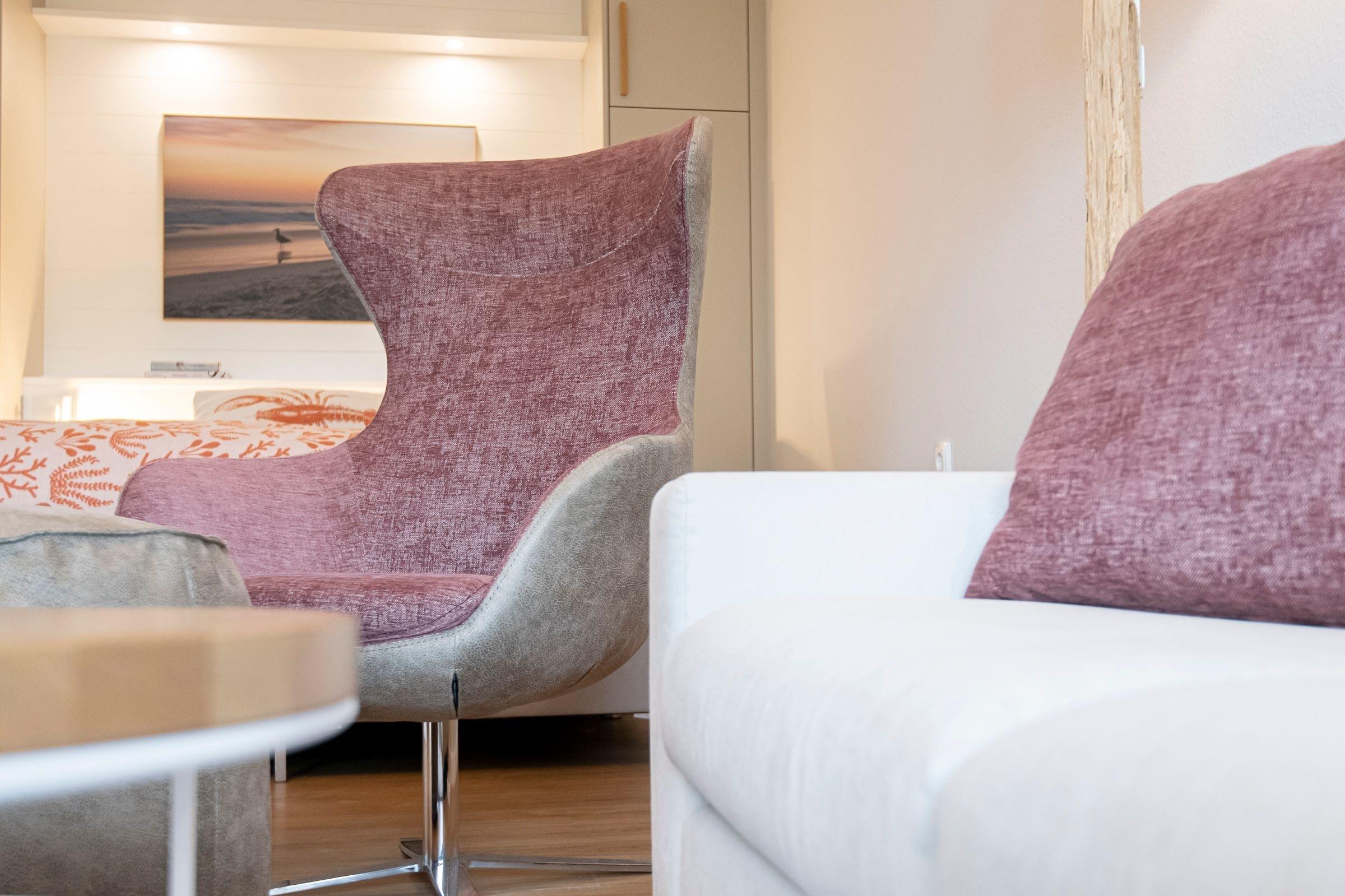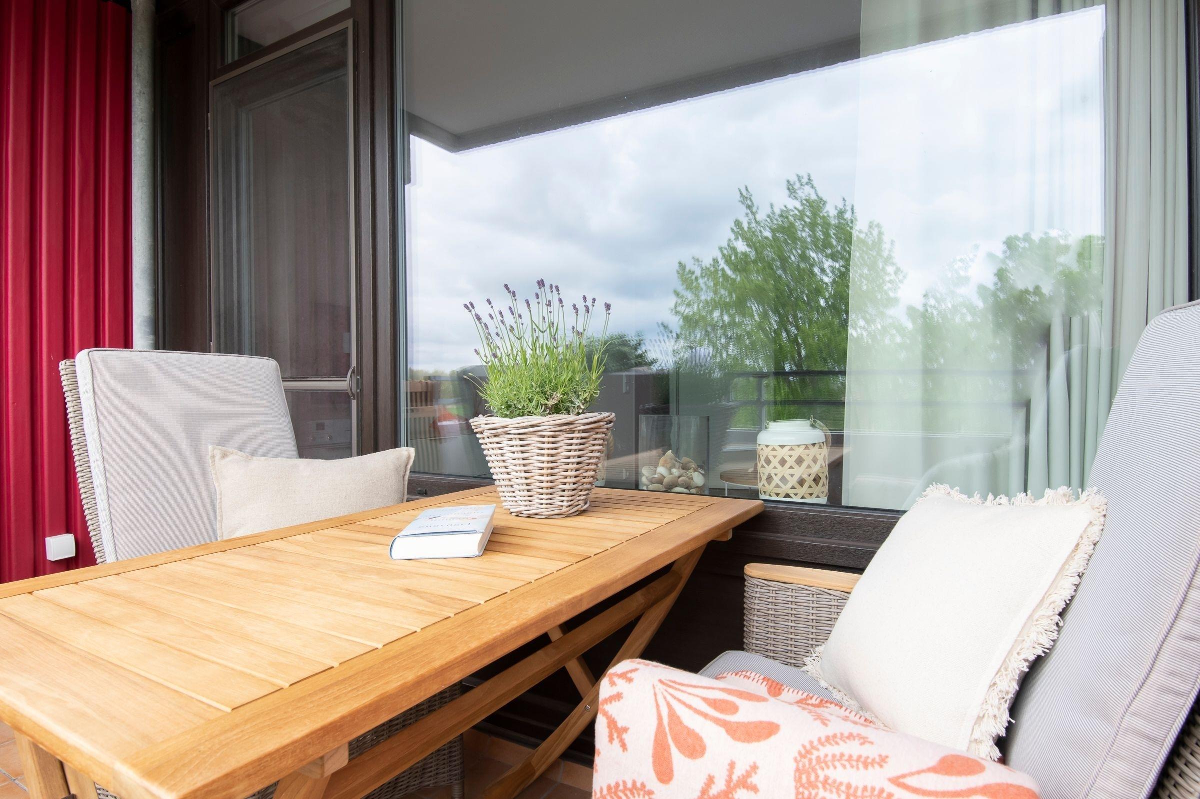 Die gesamte Einrichtung ist farblich perfekt aufeinander abgestimmt und wird Sie begeistern! Im kombinierten Wohn- und Schlafraum erwartet Sie ein komfortables Boxspring-Doppelbett (180x200 cm), ein gemütliches Ecksofa, ein Sessel sowie ein Flachbildfernseher. Die moderne Küche ist gut ausgestattet und verfügt über einen Esstisch, an dem Sie bequem mit 4 Personen speisen können. Im separaten Schlafzimmer mit französischem Doppelbett (140x200 cm) finden 2 weitere Gäste Platz. Das innenliegende Badezimmer mit WC und Dusche ist ebenfalls hell und modern eingerichtet. Auf dem möblierten Balkon können Sie die Nachmittagssonne oder den Sonnenuntergang genießen und den Tag in Ruhe ausklingen lassen. Diese Wohnung lässt keine Wünsche offen!