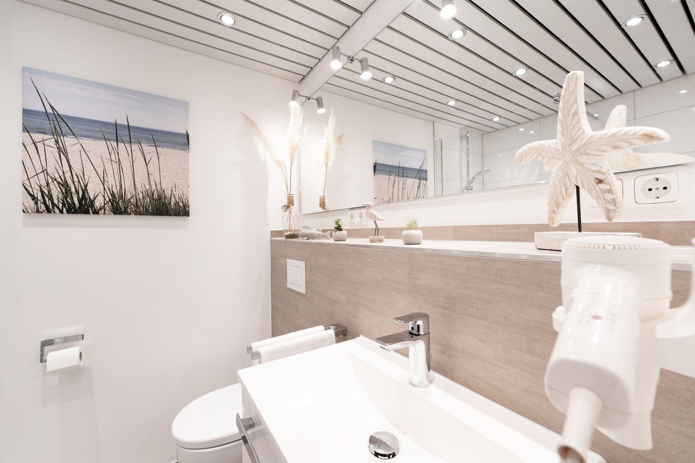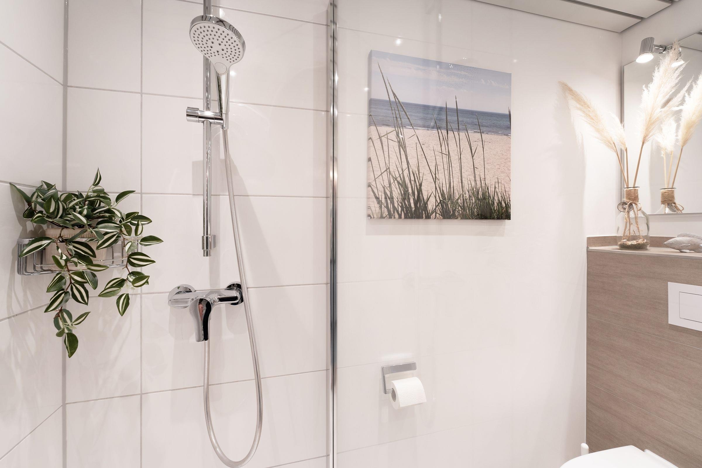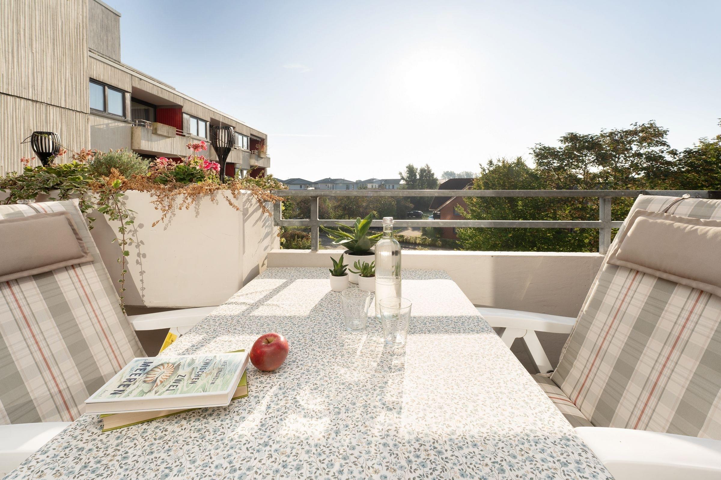 Der kombinierte Wohn- und Schlafbereich ist mit zwei komfortablen Sofas, einem Sessel, einem Flachbildfernseher und einem bequemen Doppelbett (2x 90x200 cm) ausgestattet. Das separate Schlafzimmer verfügt über ein Etagenbett (je 90x200 cm) und lässt sich mit Gardinen verdunkeln. Des Weiteren finden Sie eine gut ausgestattete Küche mit Essplatz sowie ein hochwertiges, modernes Badezimmer mit Dusche vor. Der Wohnbereich führt auf den möblierten, sonnigen Balkon und lädt zum Entspannen ein. Der WLAN-Anschluss ist inklusive.