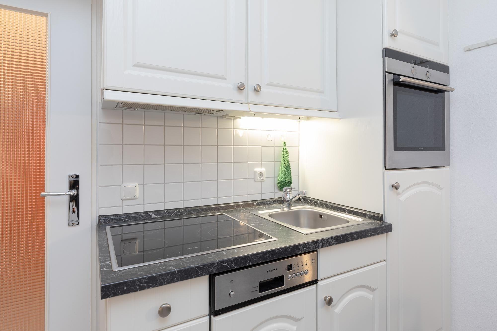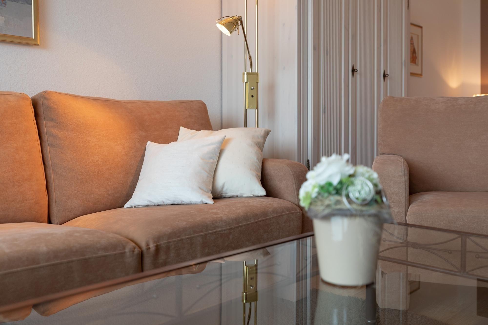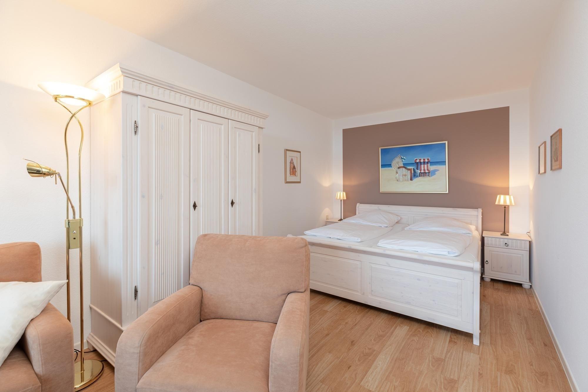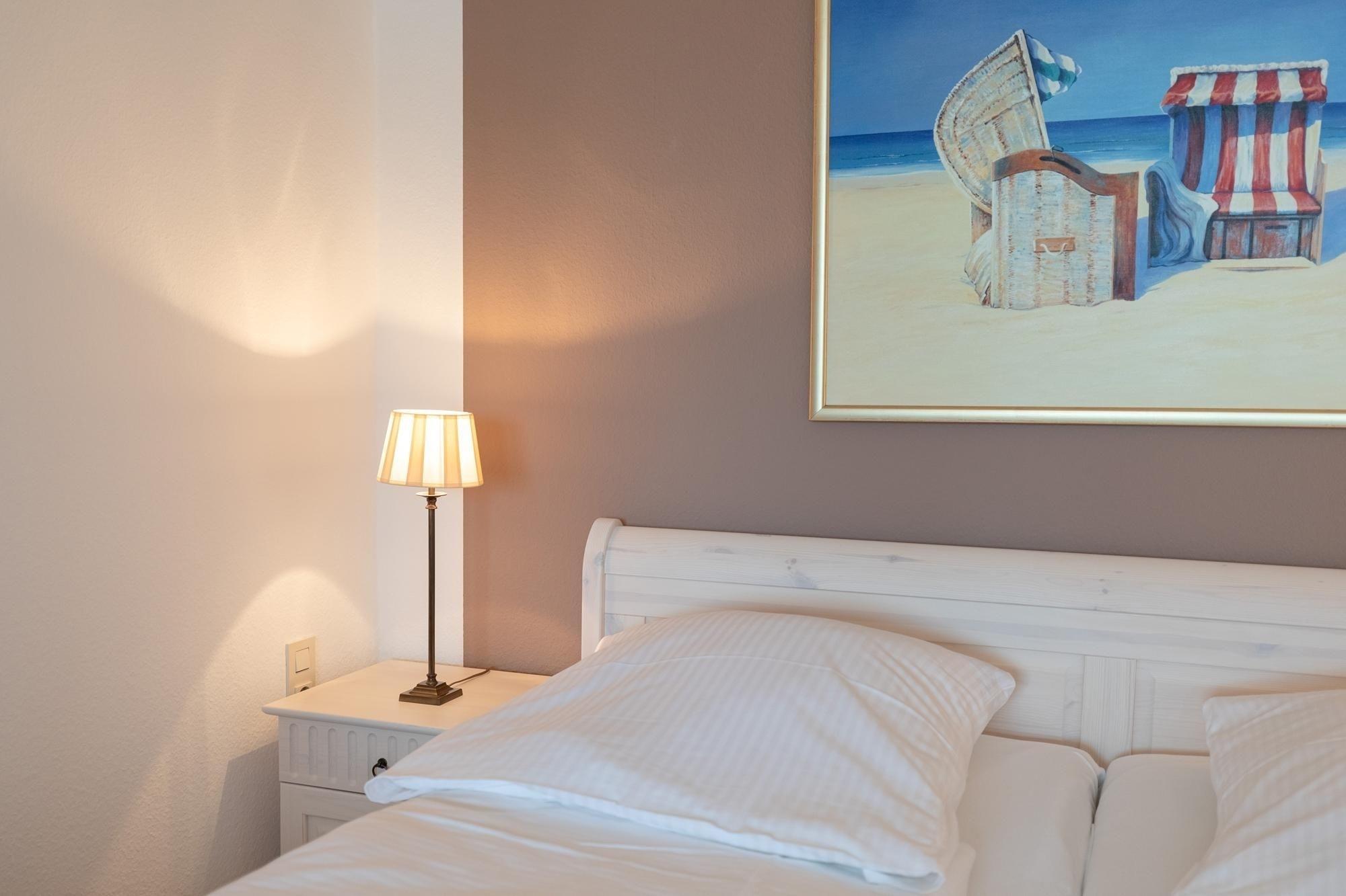 Der kombinierte Wohn- und Schlafraum überzeugt durch eine geschmackvolle Einrichtung mit hellen Möbeln. Es erwarten Sie ein komfortables Doppelbett (2x 90x200 cm), ein Kleiderschrank, ein gemütliches Sofa, ein Sessel sowie internetfähiges SAT-TV mit ca. 90 Sendeplätzen (teilweise in HD-Qualität). Eine moderne, voll ausgestattete Küche z. B. mit Geschirrspüler, Filter- und Kapselkaffeemaschine sowie einem Esstisch für 4 Personen ist ebenfalls vorhanden. Im separaten Schlafzimmer stehen Ihnen zwei Einzelbetten (je 80x200 cm) sowie ein weiterer Kleiderschrank zur Verfügung. Das innenliegende, hell geflieste Badezimmer verfügt über eine Dusche. Von Ihrem Balkon haben Sie einen wunderbaren Ostsee-Fernblick. Der WLAN-Anschluss ist selbstverständlich inklusive.