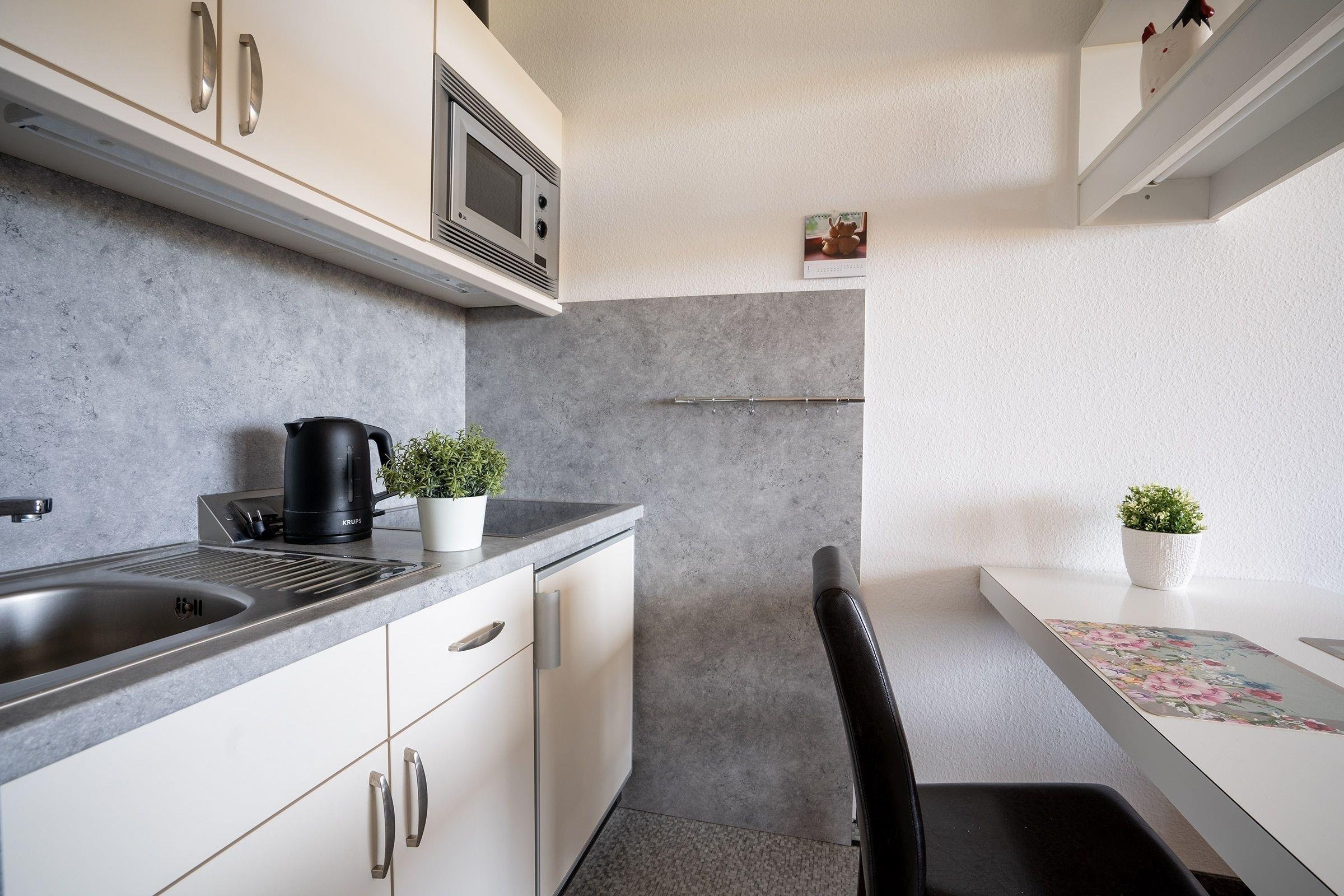 Das kombinierte Wohn- und Schlafzimmer empfängt Sie mit einem komfortablen Doppelbett (2x 80x200 cm), einem Sofa, einem Sessel und einem Fernseher. Ihre Urlaubsgarderobe können Sie in dem großen Kleiderschrank verstauen. In einer Nische neben dem Bett befindet sich eine kleine Lese-Ecke mit Blick ins Grüne. An den Wohnbereich grenzt eine offene, gut ausgestattete Küche mit Küchenbar, an der Sie zu zweit Platz nehmen können. Das innenliegende Badezimmer ist mit einer Badewanne ausgestattet. Vom Balkon aus können Sie den traumhaften Blick auf die Felder und Wiesen sowie wunderschöne Sonnenuntergänge genießen. Der WLAN-Anschluss ist selbstverständlich inklusive.