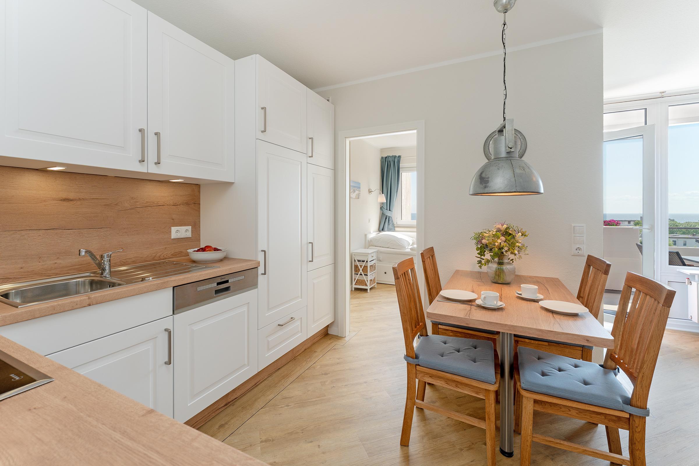 Die Ferienwohnung umfasst eine Wohnfläche von ca. 46m² , ist für bis zu 4 Personen geeignet und verfügt über einen großen Balkon. Der kombinierte Wohn-/Schlafbereich besticht durch geschmackvolles Ambiente. Das Elternbett (2x 90x200 cm) hat eine bequeme Komforthöhe. Das separate Schlafzimmer mit zusätzlichem Flachbildfernseher und integriertem DVD-Player bietet einen weiteren komfortablen Schlafplatz für bis zu 2 Personen im Kojenbett (je 80x200 cm). Auch von hier genießen Sie einen herrlichen Blick aufs Meer. Die große Küche ist sehr gut ausgestattet, ein Geschirrspüler erleichtert den Urlaubsalltag. Im Badezimmer setzt sich das moderne Design fort. Im Wohnzimmer verfügt der große Smart TV über viele Programme in HD-Qualität. Kostenloses, schnelles WLAN ist selbstverständlich.