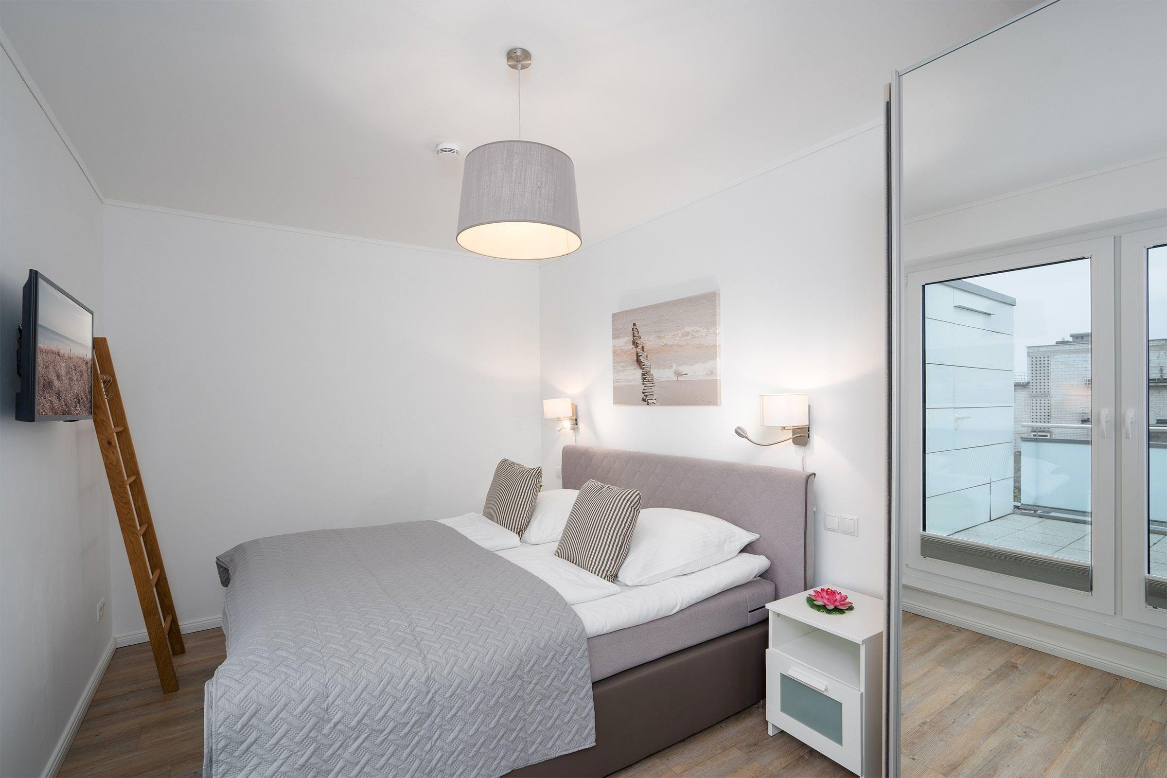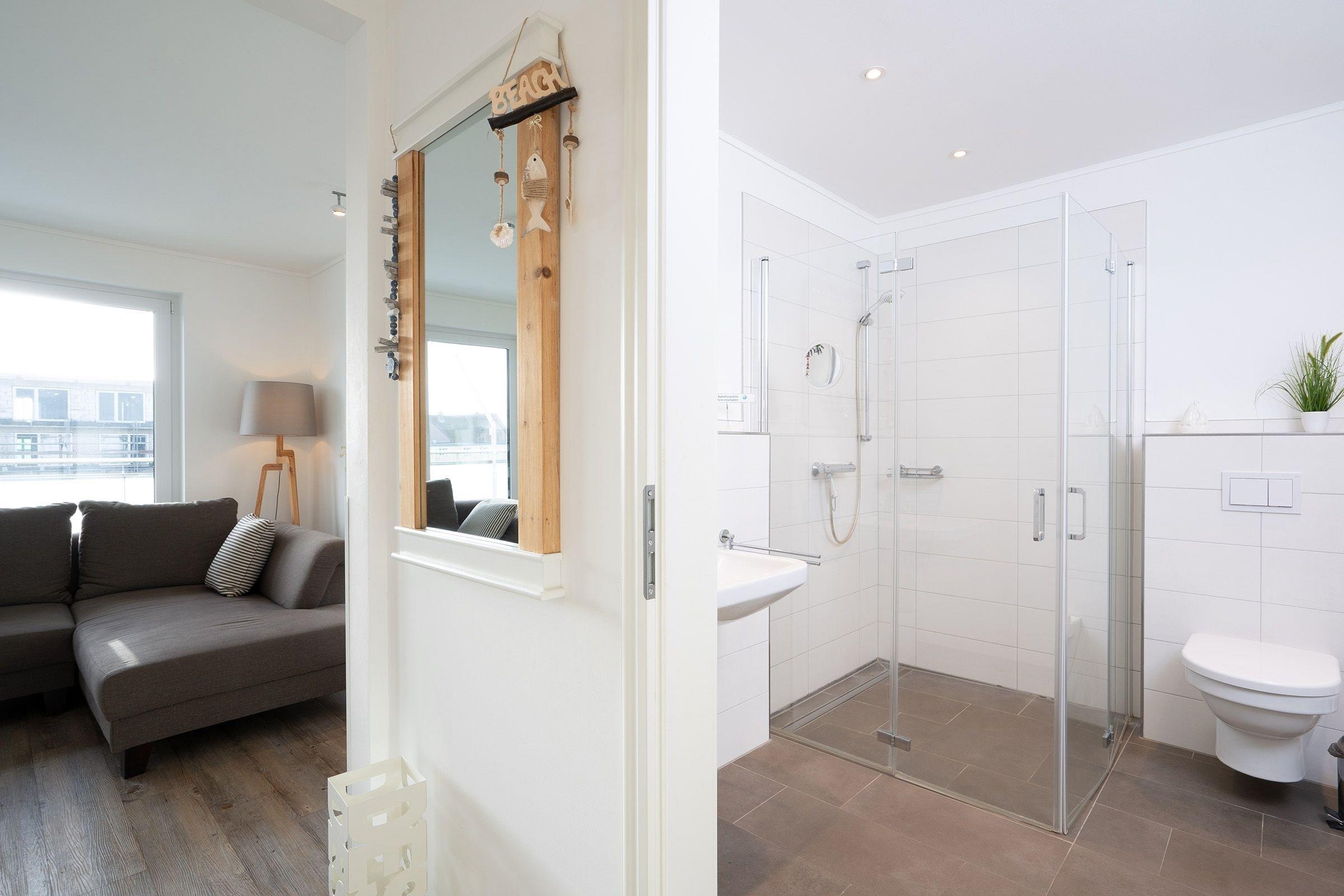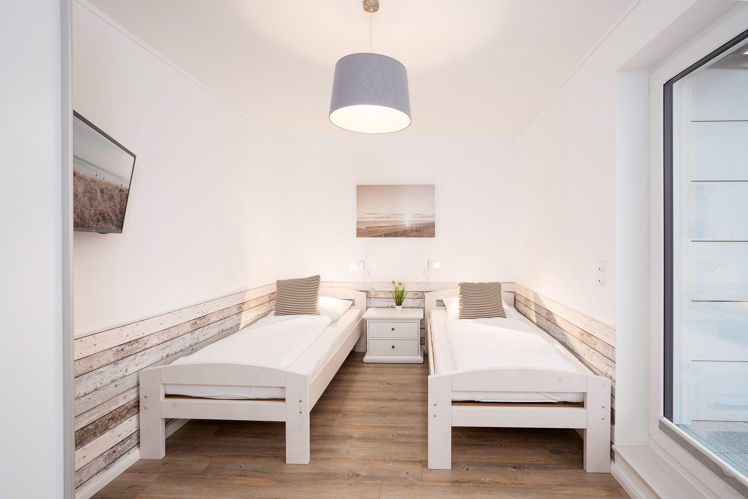Es begrüßen Sie ein geschmackvoll eingerichtetes Wohn- und Esszimmer mit einer integrierten, voll ausgestatteten Küchenzeile. Zwei separate Schlafräume (1 komfortables Boxspring-Doppelbett 190x200 cm, 2 Einzelbetten mit je 90x200 cm) sowie ein Wohlfühlbad mit ebenerdiger Dusche warten auf Sie. Sowohl im Wohn- als auch in den Schlafräumen befindet sich je ein Smart-TV. Verdunkelungsplissees sorgen im in den Schlafzimmern für erholsame Nächte. Im Hauswirtschaftsraum steht Ihnen ein Waschtrockner zur Verfügung. Von allen Zimmern gelangen Sie auf die ca. 35 m² große Dachterrasse. Genießen Sie Ihr Frühstück im Strandkorb oder lassen Sie den Tag mit einem Grill-Abend ausklingen. Zusätzlich steht Ihnen ein Gemeinschaftsgarten mit Kinderspielplatz zur Verfügung. Ein Elektrogrill, ein Kinderhochstuhl, ein Kinderreisebett sowie der WLAN-Anschluss sind für Sie inklusive.