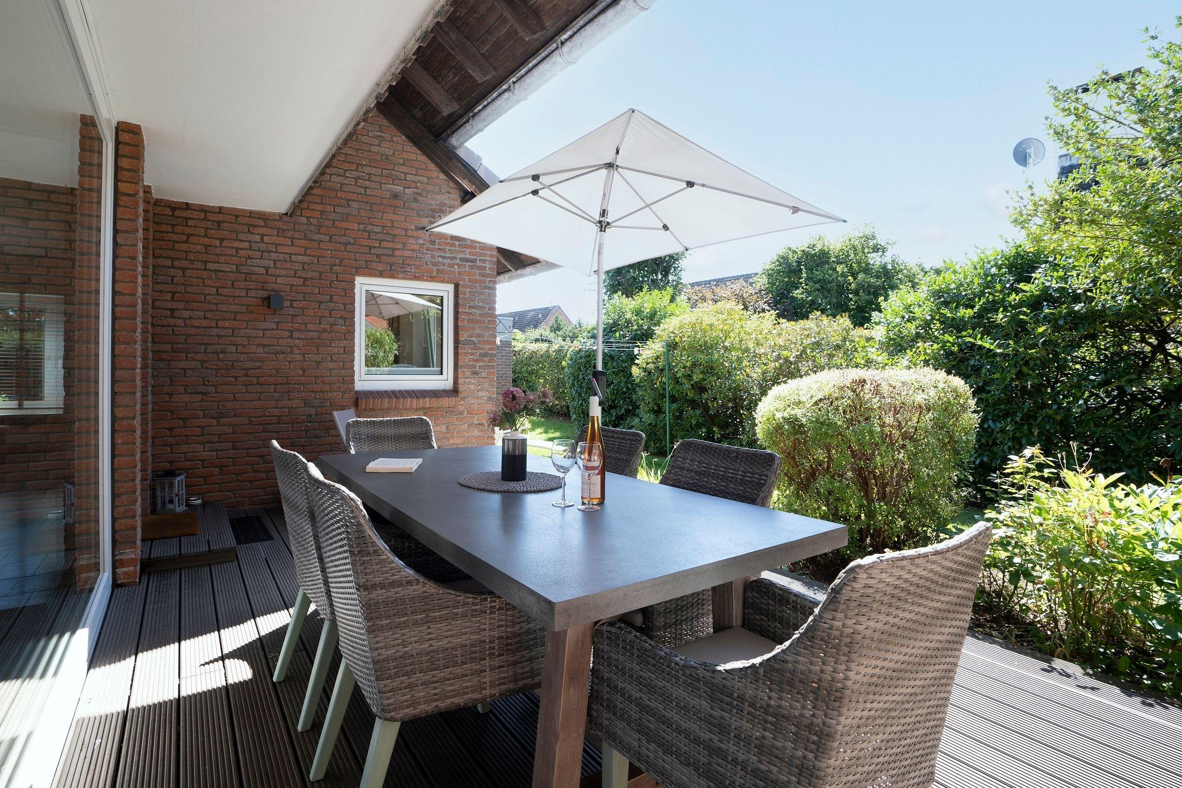 Der helle, unheimlich charmante Wohnraum mit Kamin und Flatscreen-TV geht über in die großzügige Wohnküche, die mit vielen technischen Raffinessen versehen wurde. An dem eindrucksvollen, markanten Holztisch werden Sie viele gesellige Urlaubsstunden verbringen. Die wunderschöne, vom Garten eingerahmte Terrasse, wartet ebenfalls darauf, Sie mit viel Sonne und unserer frischen Ostseeluft überzeugen zu können. Sitzgelegenheiten und Sonnenliegen stehen für Sie bereit, ein Sonnenschirm spendet bei Bedarf Schatten.