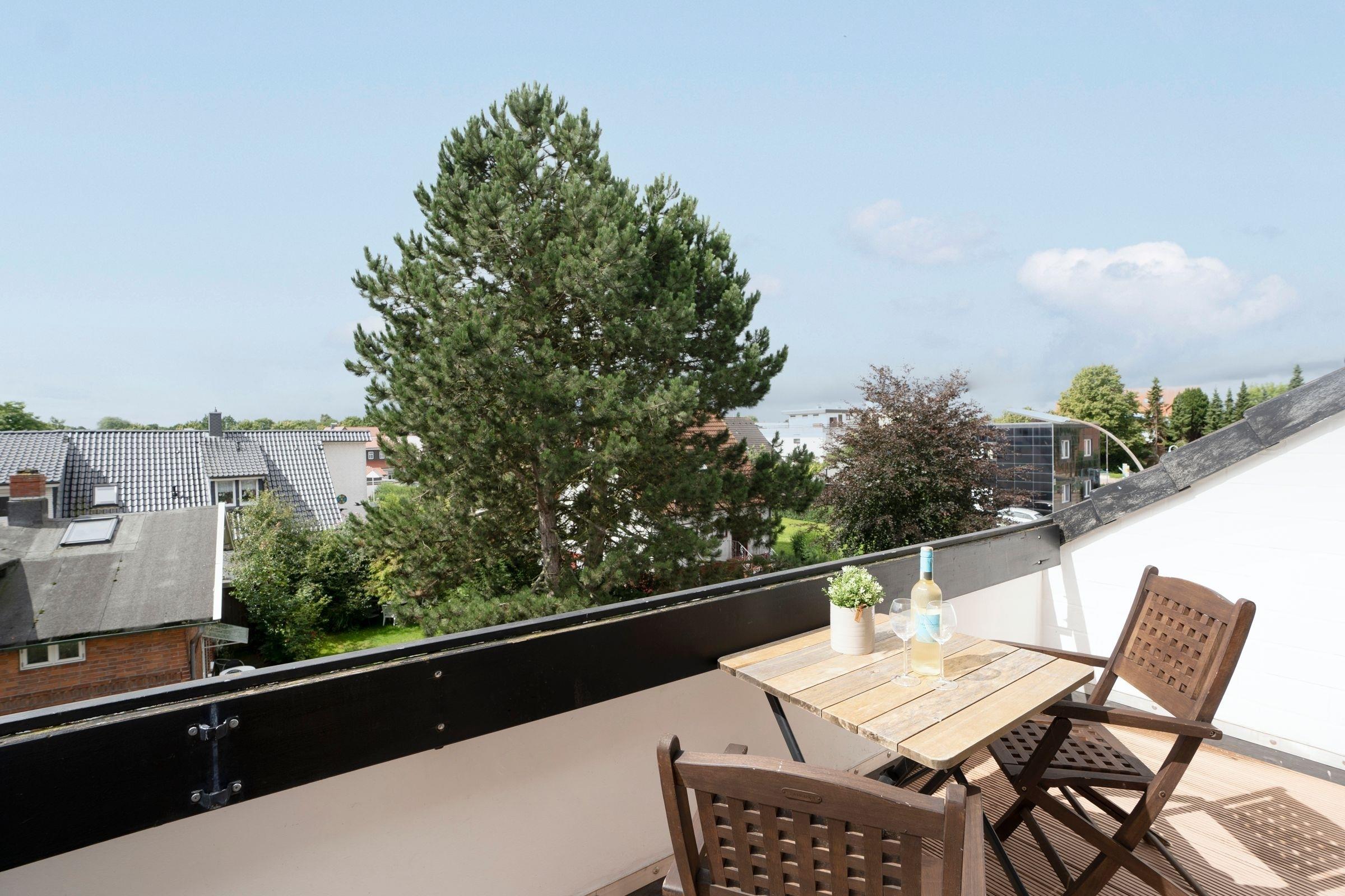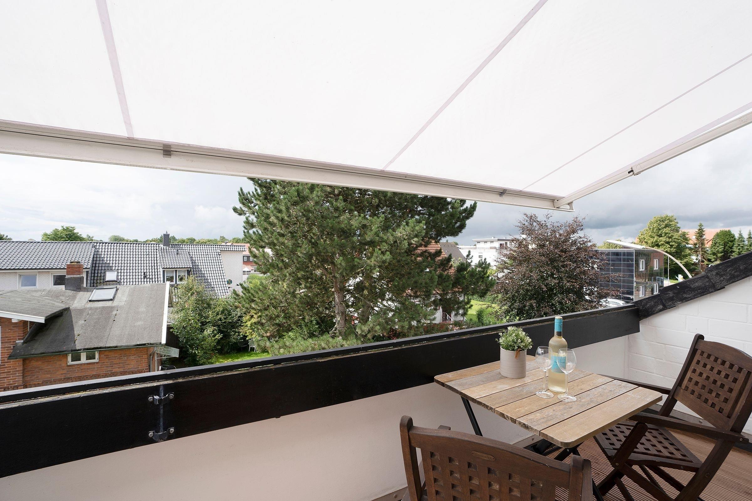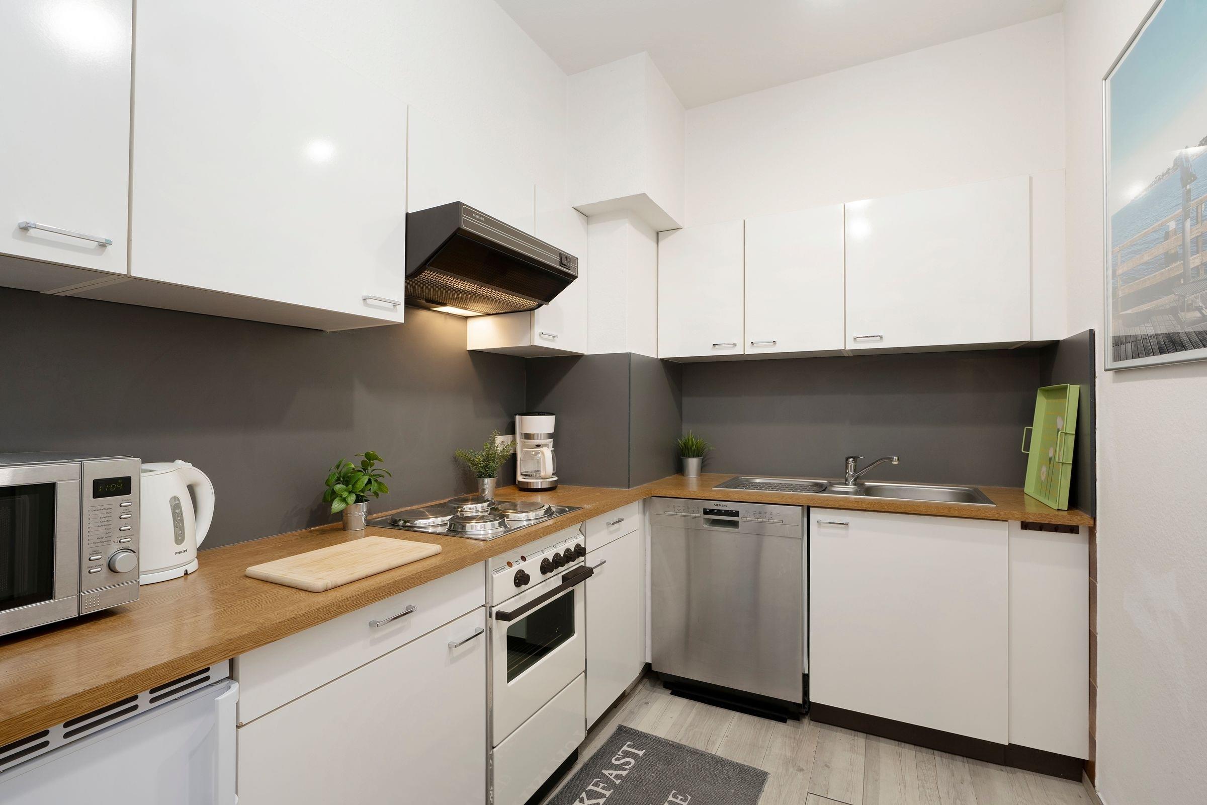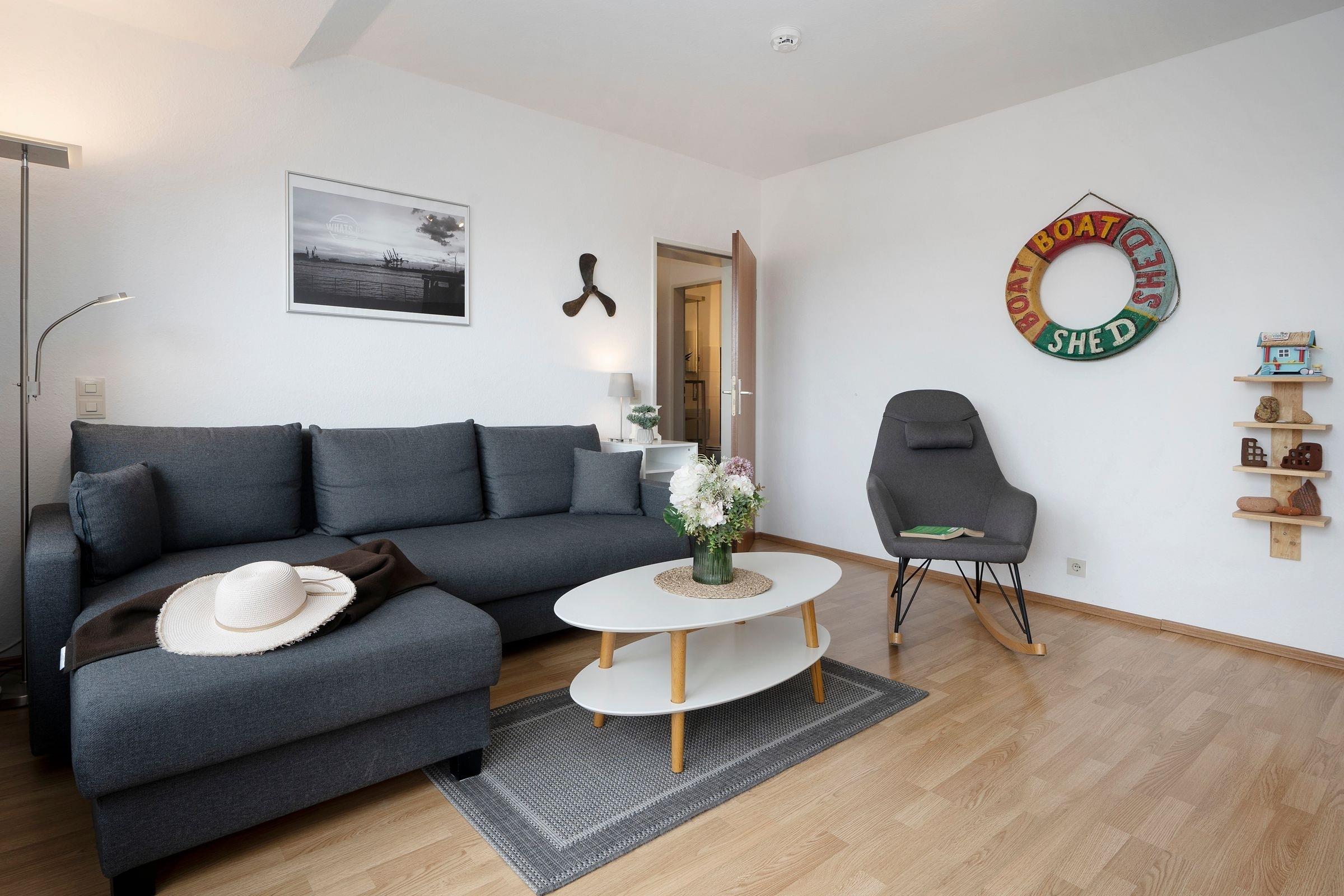 Im 2. Stock gelegen empfängt Sie diese 2-Zimmer-Wohnung mit einer Wohnfläche von ca. 45m² und ausreichend Platz für bis zu 4 Personen. Das Domizil teilt sich auf in ein großzügiges Wohnzimmer mit komfortablem Schlafsofa (140x200cm) und direktem Zugang zum möbliertem Balkon, eine separate, gut ausgestattete Küche, ein separates Schlafzimmer mit 2 Einzelbetten (90x200cm) und Kleiderschrank, sowie ein Duschbad. Im Außenbereich schützen eine Markise und ein Sonnenschirm im Sommer vor zu starker Sonneneinstrahlung. Der lichtdurchflutete Wohnbereich umfasst einen integrierten Essplatz, sowie eine Fernsehecke mit modernem Flachbildfernseher. Das gesamte Interieur Ihrer Ferienwohnung ist geschmackvoll und freundlich gestaltet.