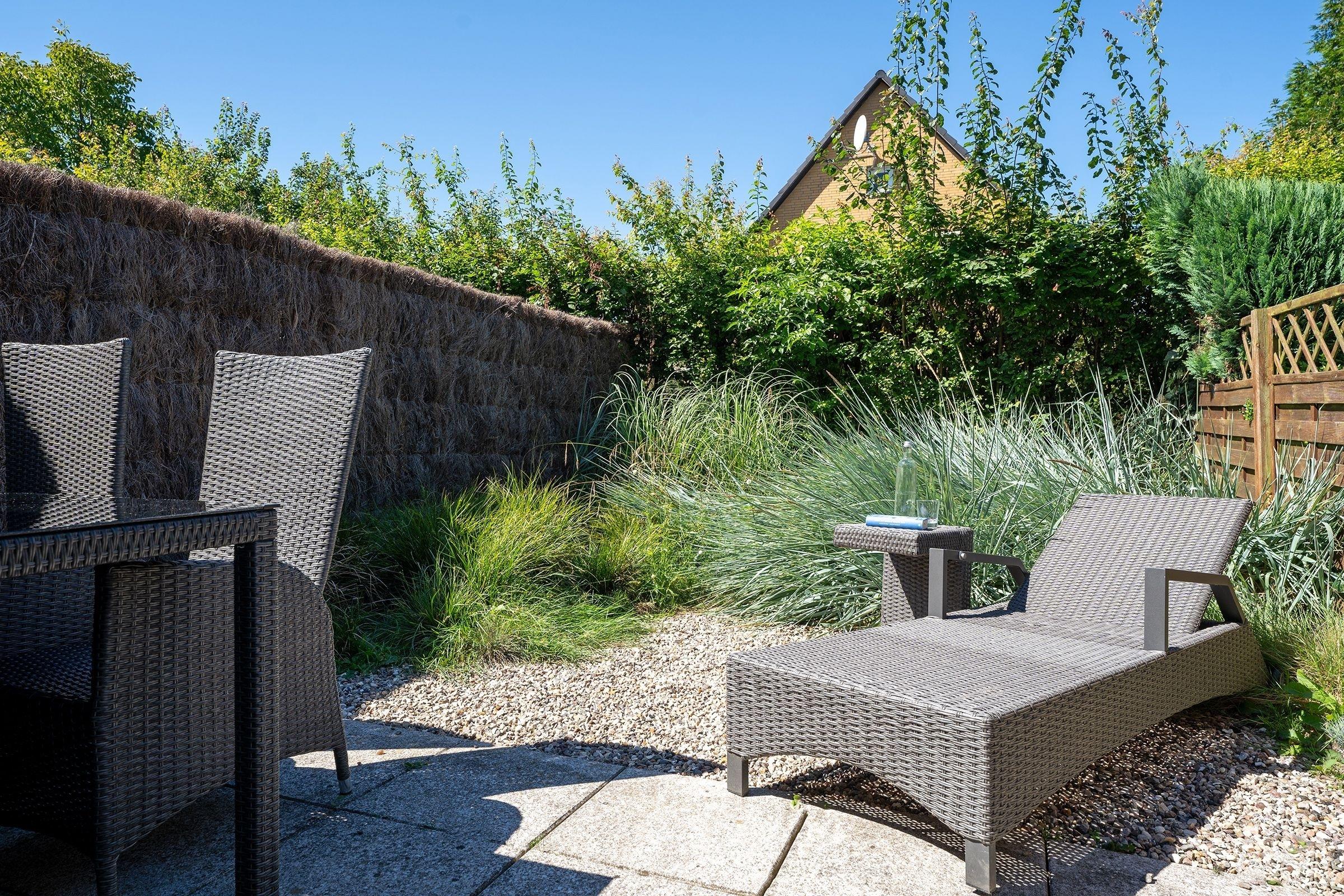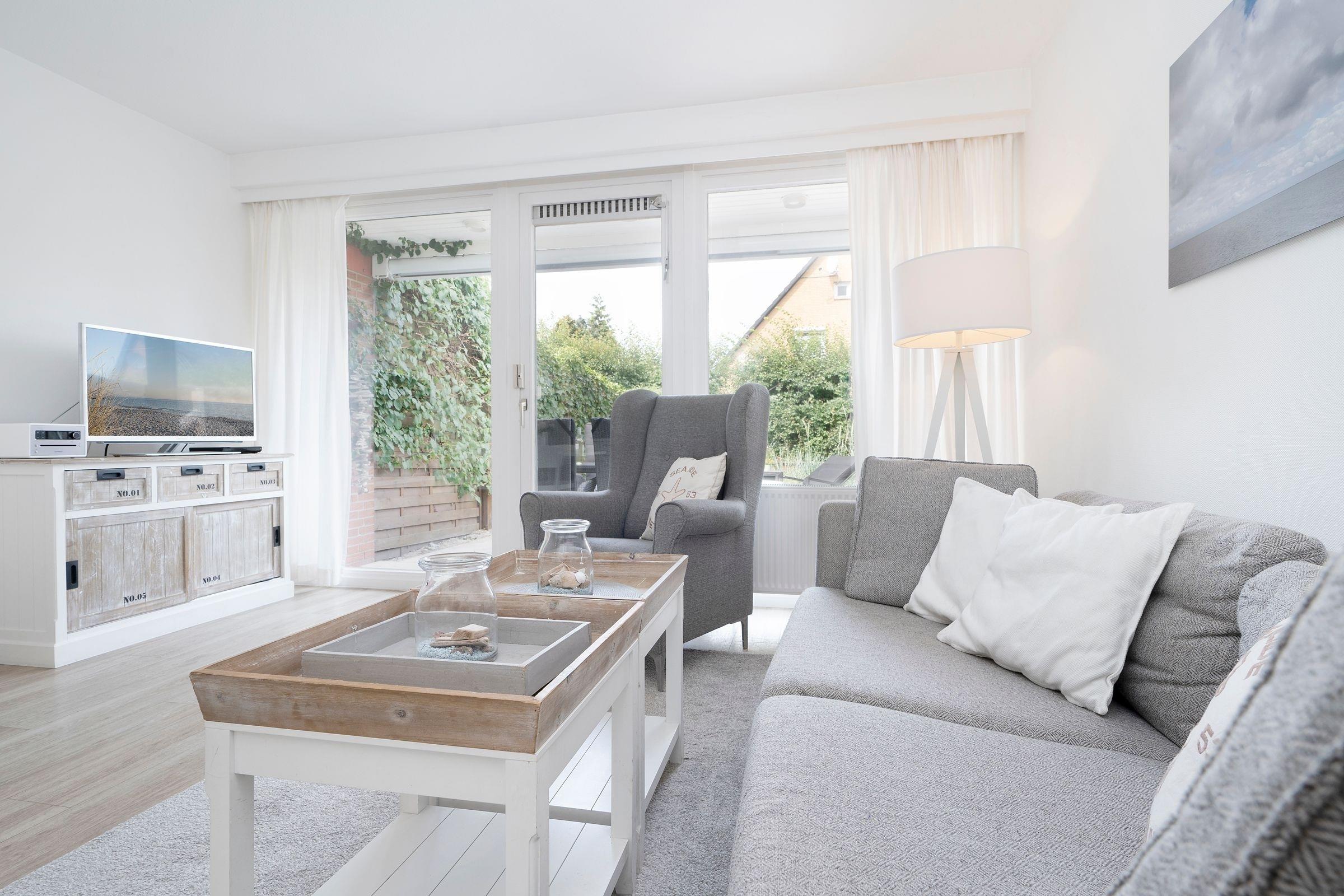 Hell und lichtdurchflutet empfängt Sie der mit viel Liebe zum Detail eingerichtete Wohnbereich. Hier sorgen ein bequemes Sofa und ein Sessel für Komfort und laden zu gemütlichen Fernseh-Abenden ein. Die moderne, voll ausgestattete Küche grenzt offen an den Wohnbereich und verfügt über alle notwendigen Küchenutensilien. Im Obergeschoss erwarten Sie ein Schlafzimmer mit Doppelbett (2x 90x200 cm) und ein Schlafzimmer mit zwei Einzelbetten (je 90x200 cm) und einem Fernseher. Das Duschbad mit Fenster befindet sich im Erdgeschoss und ist neben einem WC mit einer Dusche ausgestattet. Genießen Sie Ihren Urlaub mit einem guten Buch auf der überdachten, möblierten Terrasse oder verbringen Sie erholsame Stunden am nur ca. 400 m entfernten Strand.