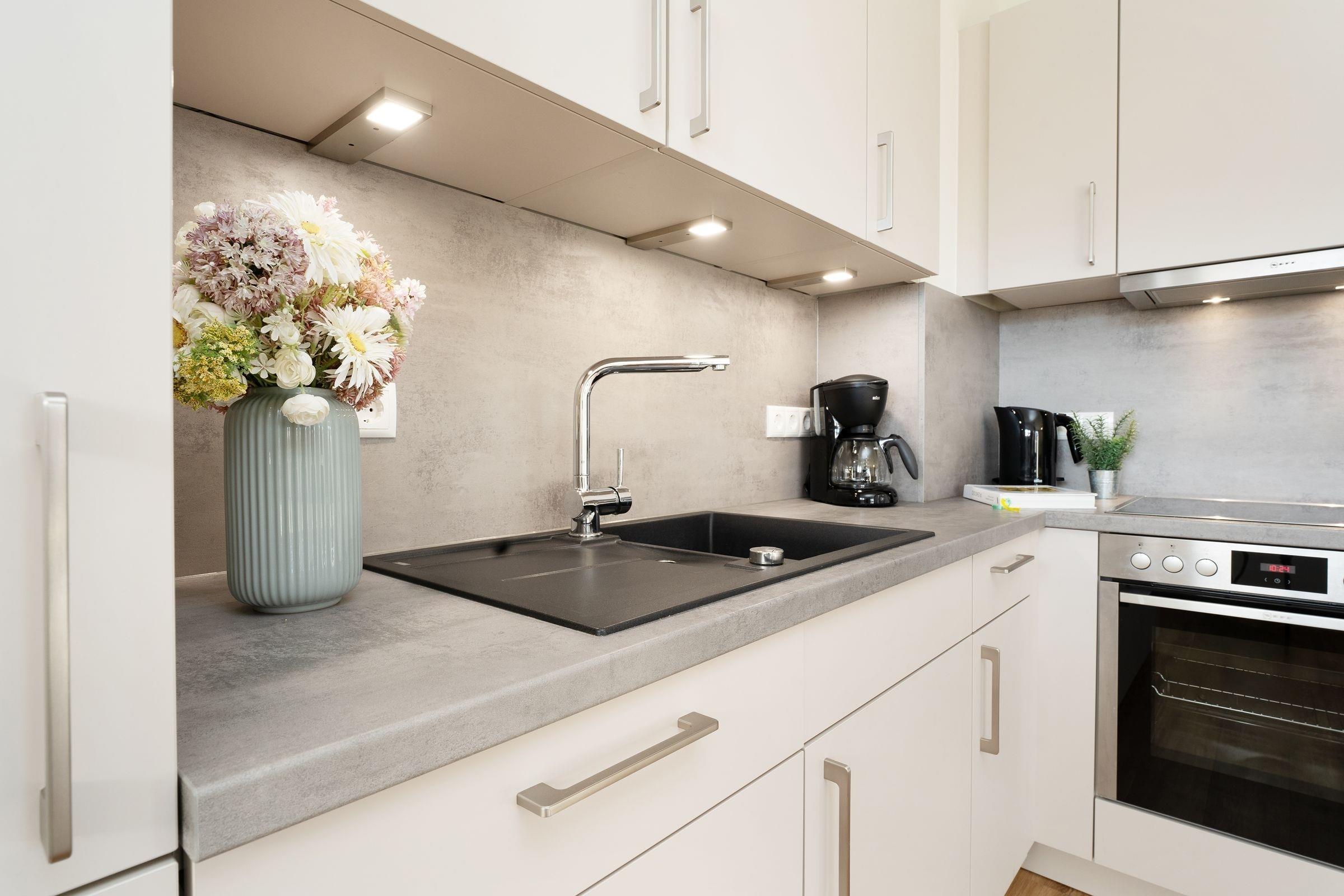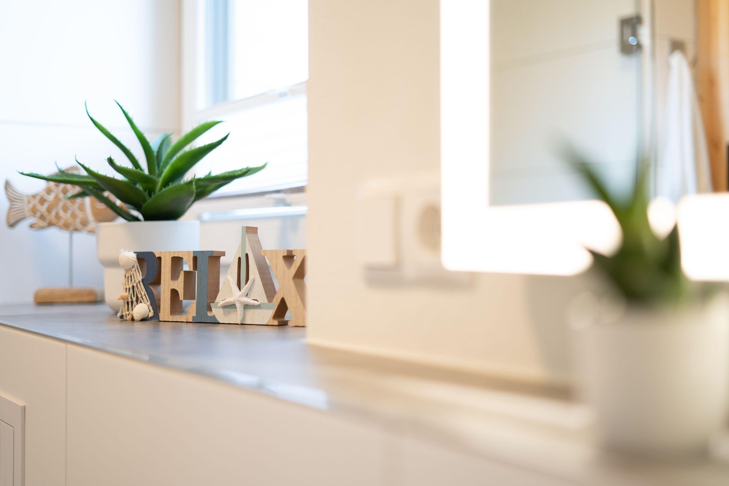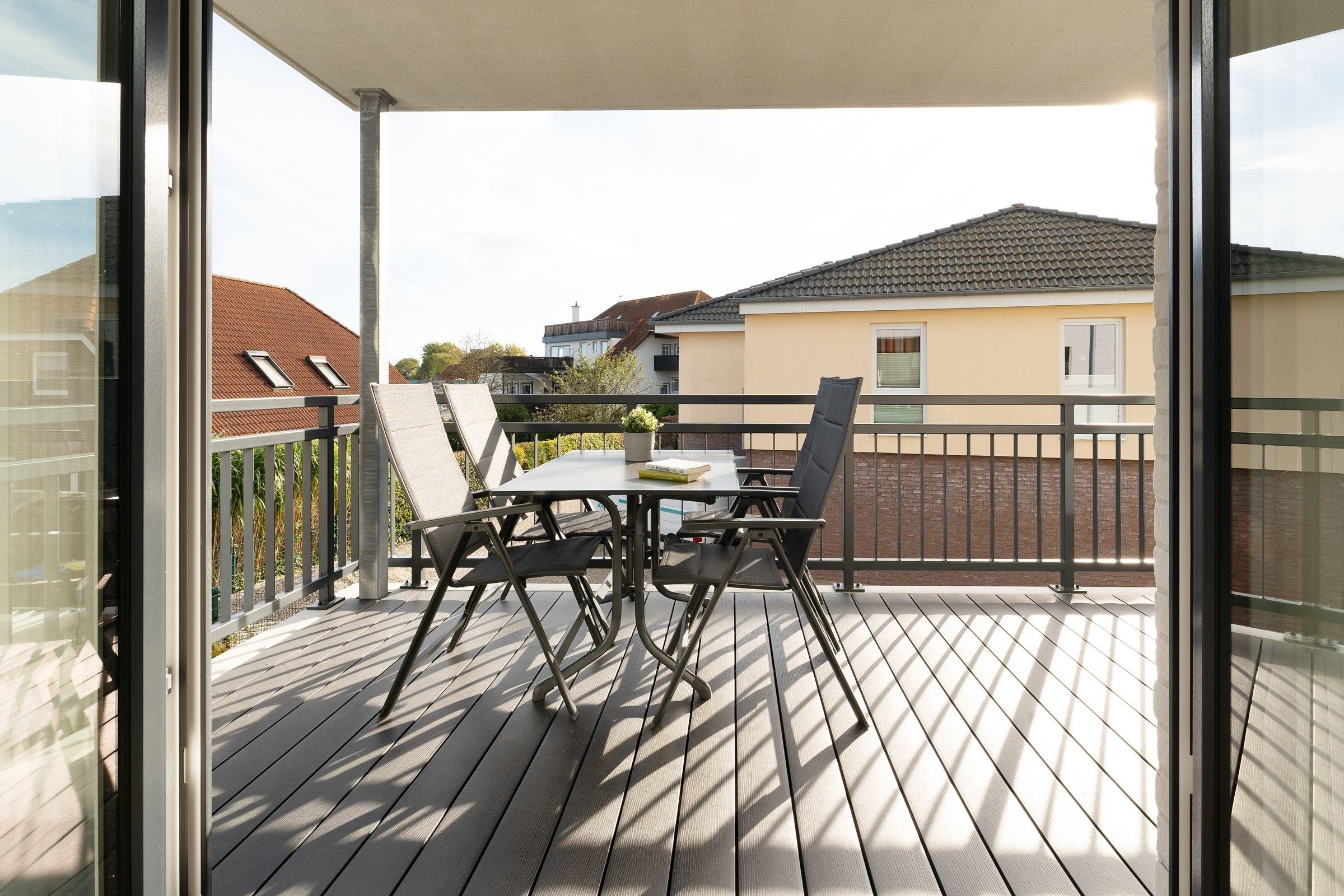 Der lichtdurchflutete Wohn- und Essbereich mit komfortablem Ecksofa und großem Flachbildfernseher ist das Herzstück dieser Wohnung. Die angrenzende, offene Küche ist sehr gut ausgestattet und bietet ausreichend Platz zum gemeinsamen Kochen. Auf dem überdachten, möblierten Balkon mit Süd-Ost-Ausrichtung sorgen zwei Sonnenliegen und ein Sonnenschirm für weiteren Komfort. Die Wohnung verfügt über zwei separate Schlafzimmer. Beide sind mit einem Boxspring-Doppelbett (180x200 cm, durchgehender Topper) sowie einem Kleiderschrank und einem TV eingerichtet. Zusätzlich zum Hauptbadezimmer mit WC, bodengleicher Dusche und eigener Sauna gibt es ein Gäste-WC. Die Fußbodenheizung in der gesamten Wohnung sorgt stets für eine angenehme Wärme.