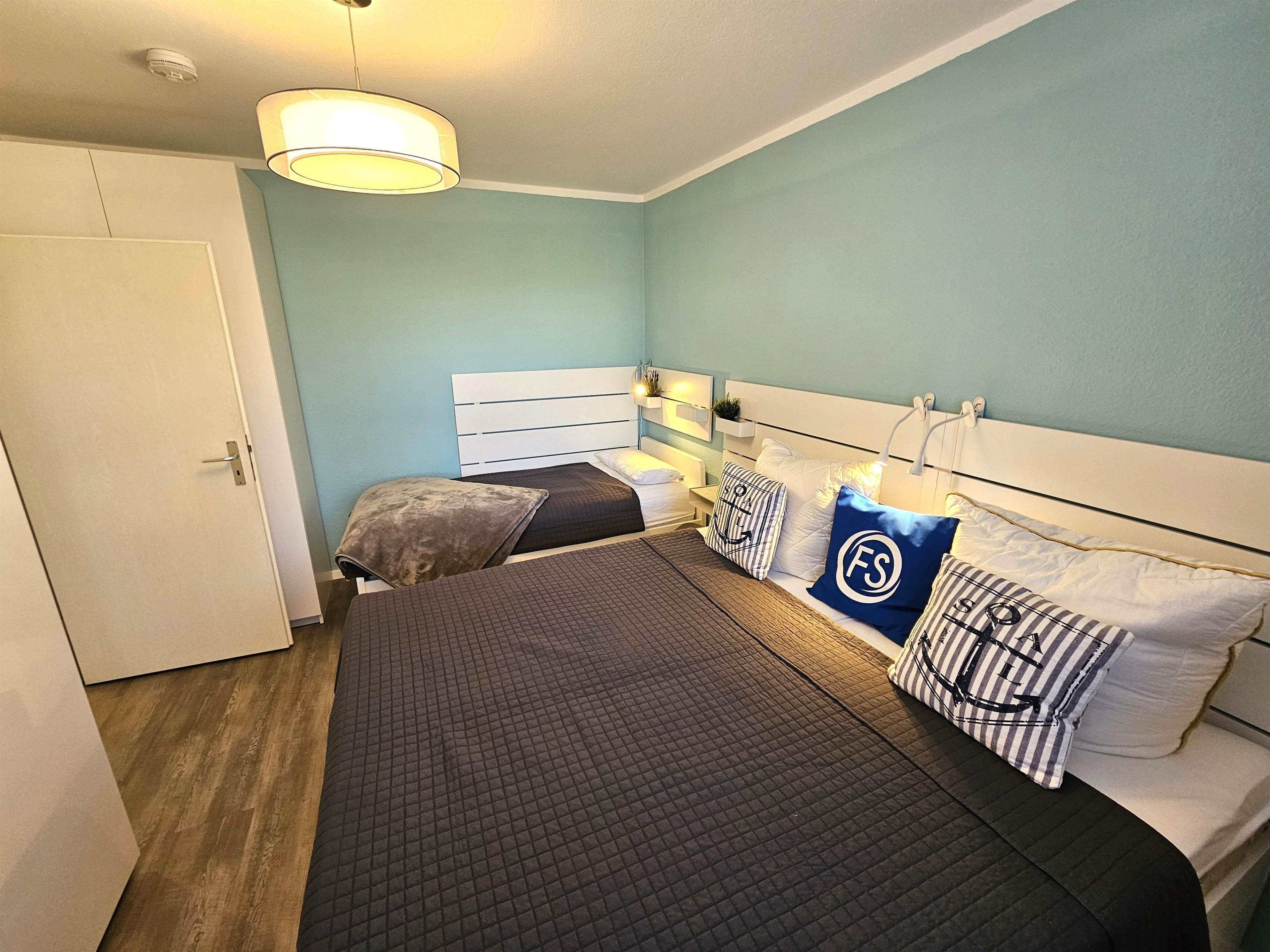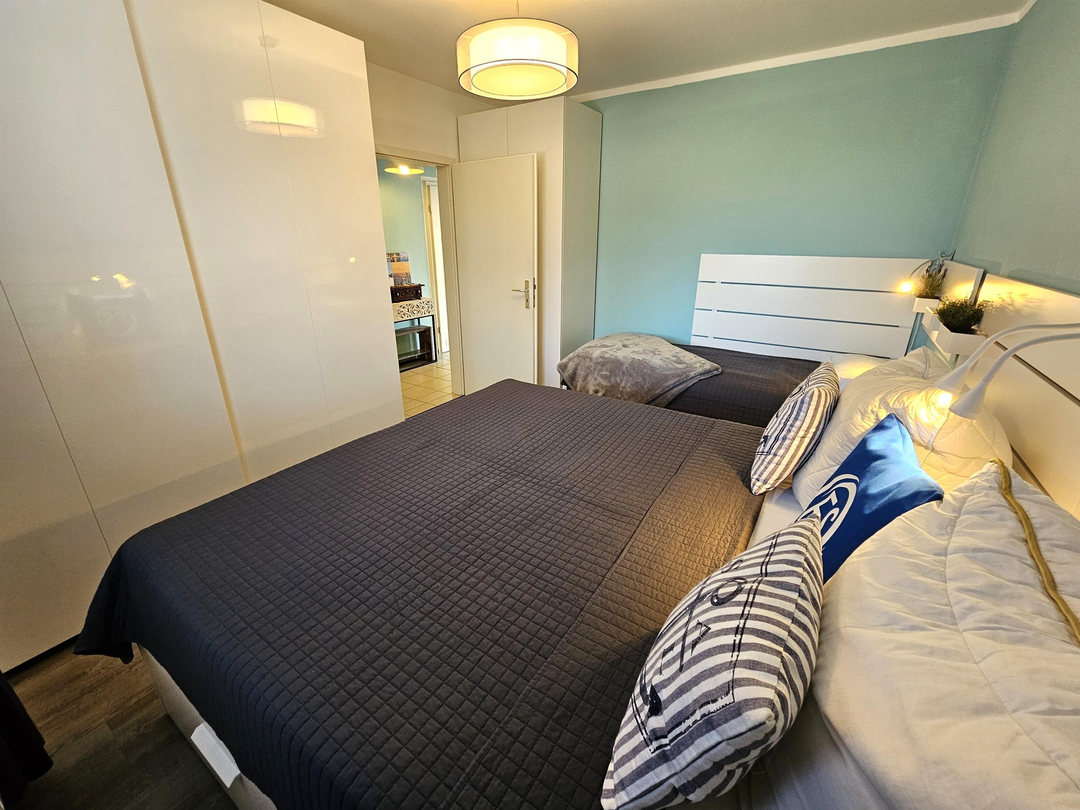 Auf der rechten Seite befindet sich zunächst das Schlafzimmer. Dieses ist ausgestattet mit einem komfortablen Doppelbett (zwei Einzelmatratzen à 80 x 200 cm) sowie einem zusätzlichen Einzelbett (90 x 200 cm). Kleiderschränke bieten ausreichend Stauraum. Ein Fenster sorgt für angenehmes Tageslicht, während Verdunklungsvorhänge für erholsamen Schlaf sorgen.