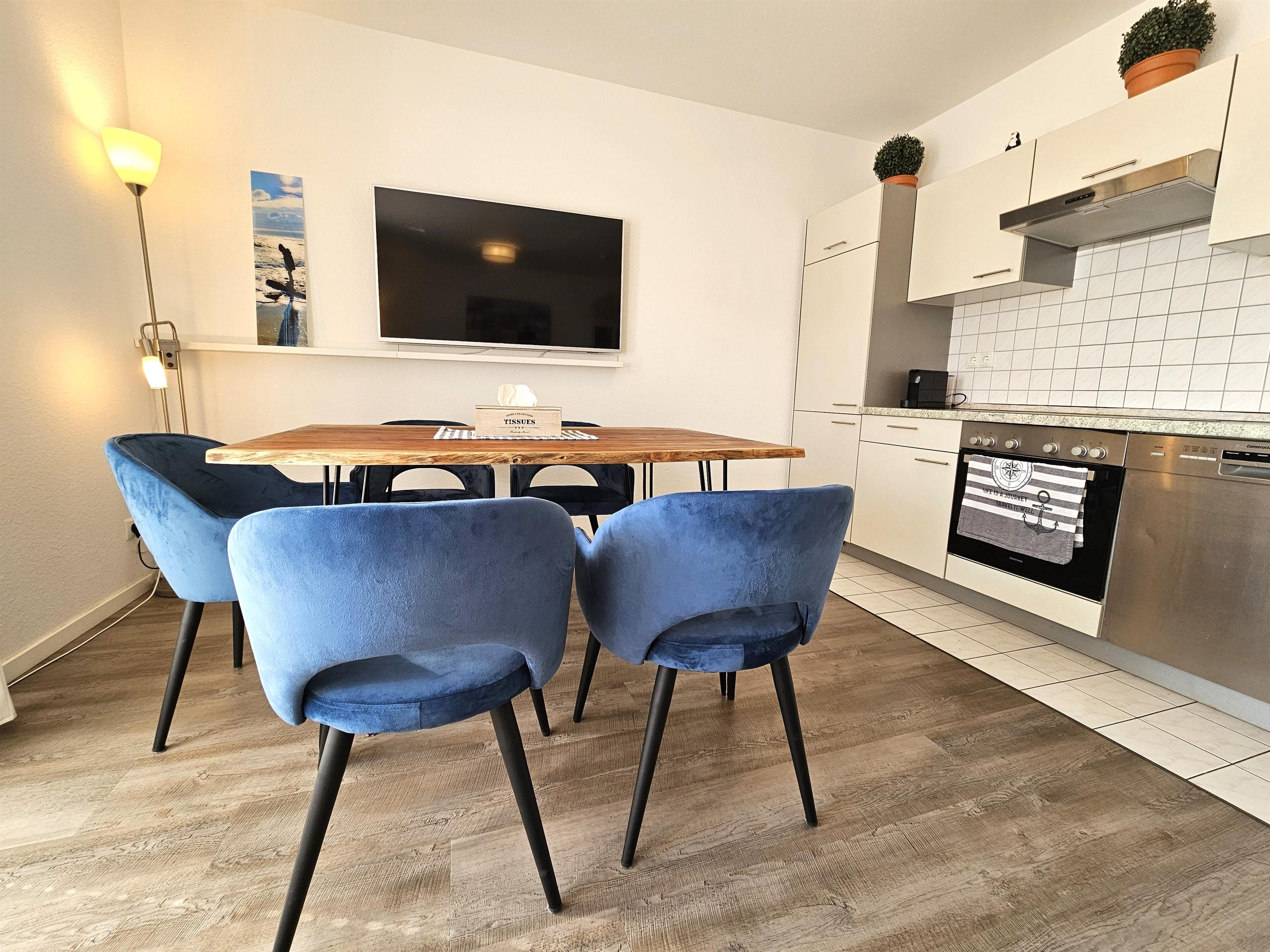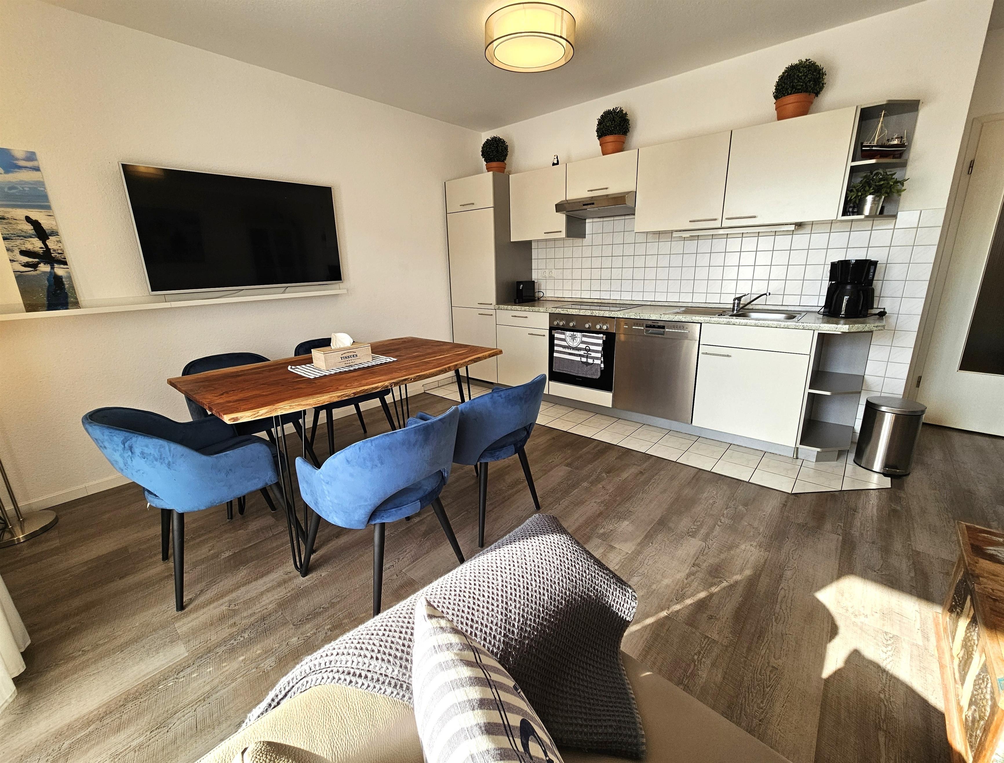 Geradeaus gelangen Sie in den großzügigen Wohn- und Essbereich mit offener Küche. Das Wohnzimmer ist mit einer modernen Sofagarnitur, einem stilvollen Esstisch mit fünf Stühlen sowie einem großen, an der Wand montierten Fernseher ausgestattet. Die offene Küche bietet alle Annehmlichkeiten für einen komfortablen Aufenthalt, darunter Backofen, Ceranfeld, Geschirrspüler, Kühlschrank, Toaster und Kaffeemaschine.