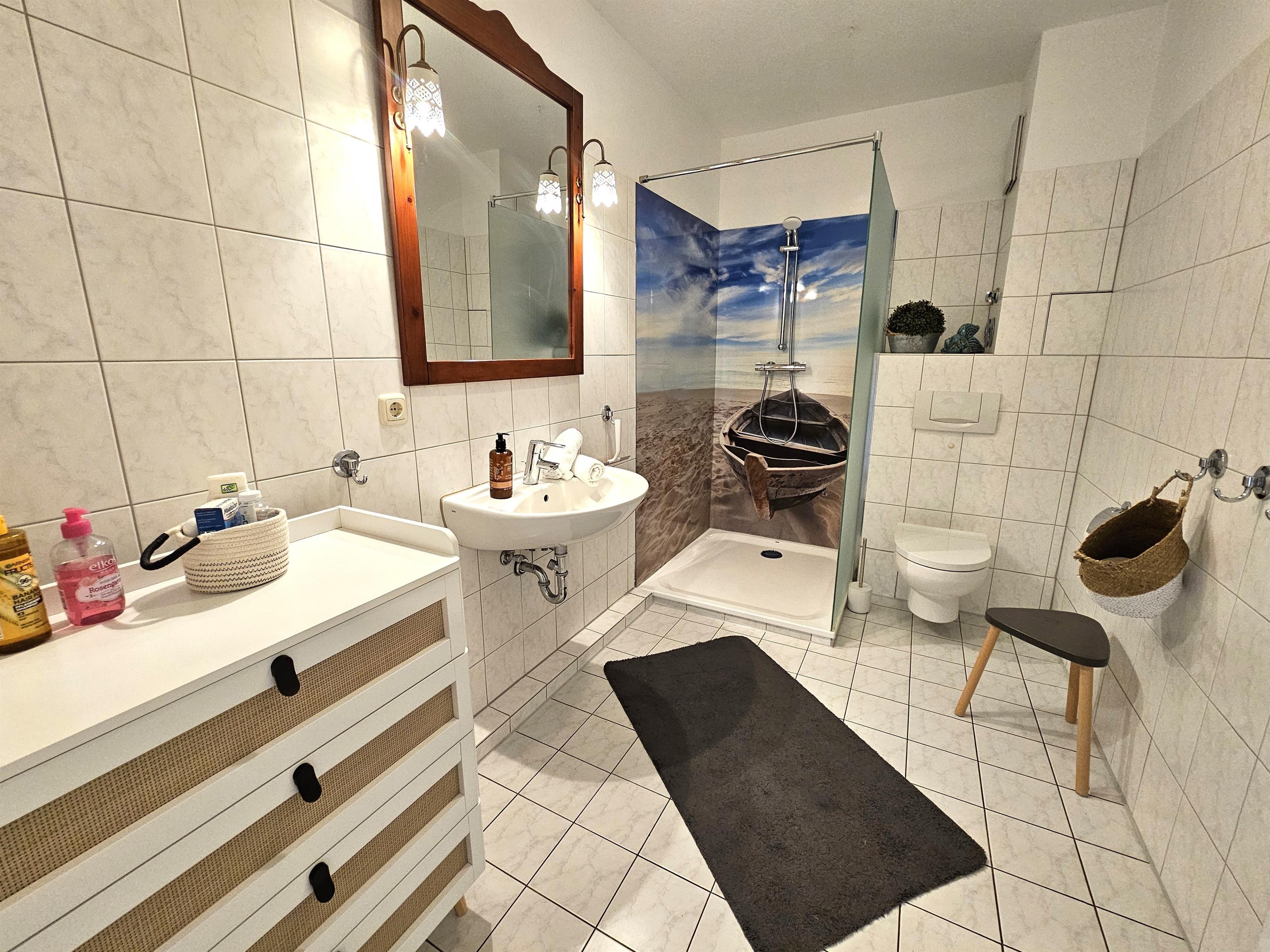 Ebenfalls auf der rechten Seite liegt das Duschbad. Dieses verfügt über eine ebenerdige Dusche, ein Waschbecken mit Spiegel sowie eine Toilette.
