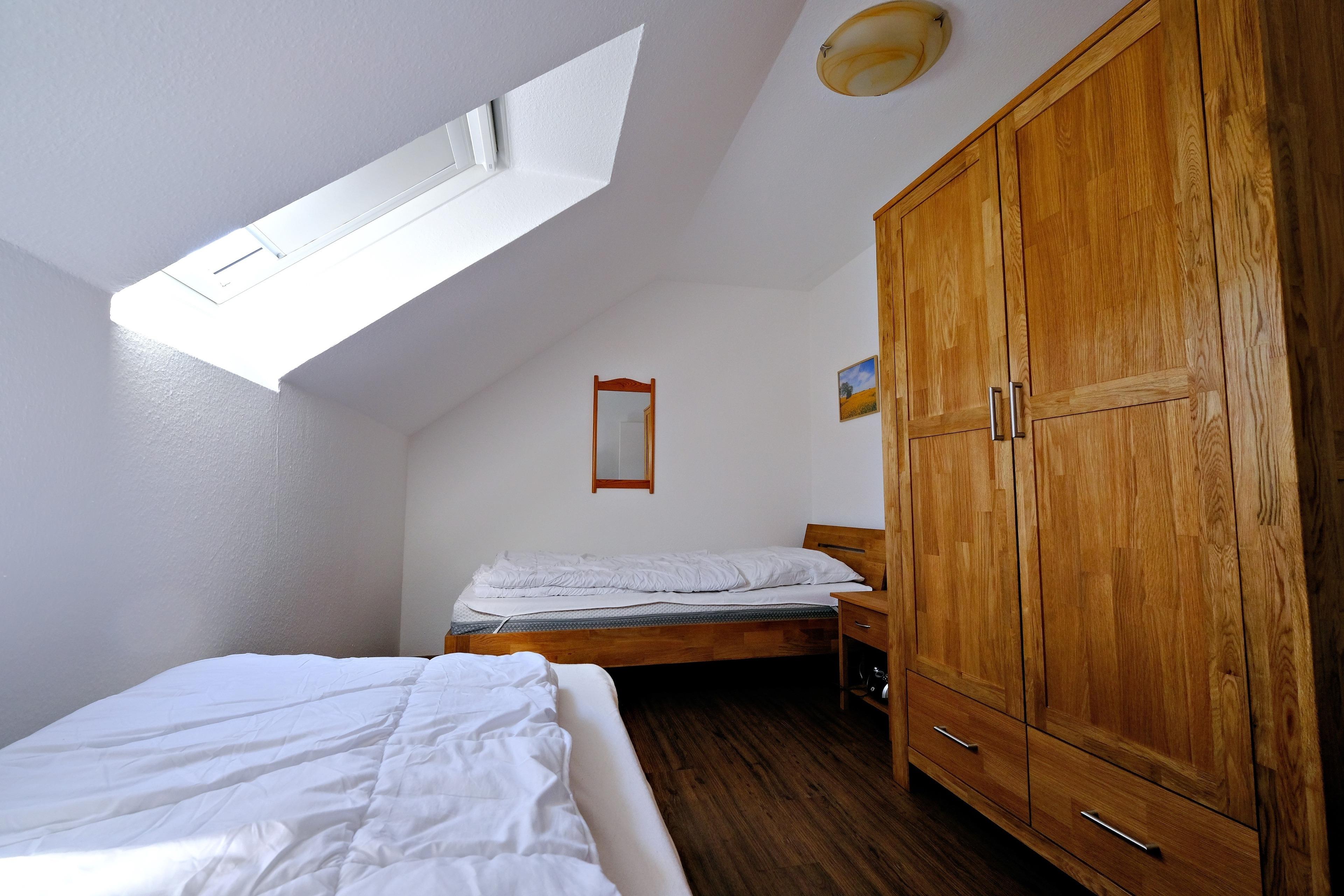 1.Obergeschoss: Flur, Schlafzimmer mit Doppelbett (2x90x200 cm), Schlafzimmer mit zwei Einzelbetten (90x200 cm)