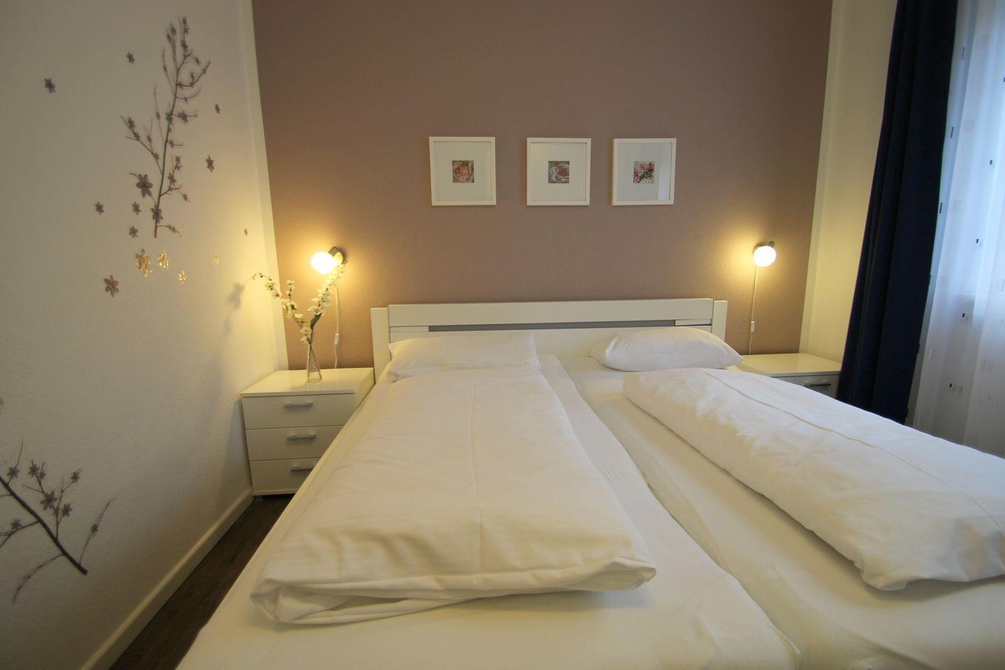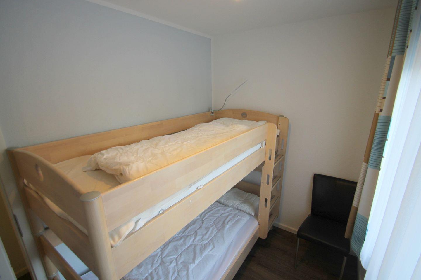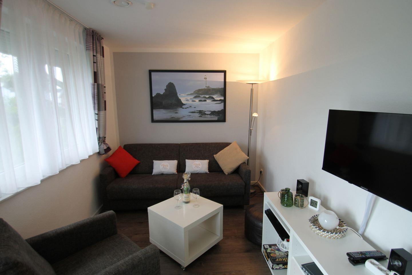 Wohnung im Obergeschoss einer Doppelhaushälfte mit Balkon. Sehr schöne lichtdurchflutete Wohnung für insgesamt bis zu sechs Personen. Wohnzimmer mit Schlafsofa (1 x 180x200 cm) mit offener Küche, die mit den modernsten Elektrogeräten ausgestattet ist. Ein Schlafzimmer mit Doppelbett (2 x 90x200 cm), das zweite Schlafzimmer ist mit einem Etagenbett ausgestattet. Tageslichtduschbad in modernem Look. BluRay-Player, HiFi mit Ipod Docking. Verdunklungsvorhänge sichern den erholsamen Schlaf. Waschmaschine und Trockner sind im Haus vorhanden und ergänzen die Komfortausstattung für die Gäste. Ruhige Lage mit kurzem Fußweg zum Hauptstrand. PKW-Stellplatz am Haus. Ein lieber Hund ist herzlich Willkommen!