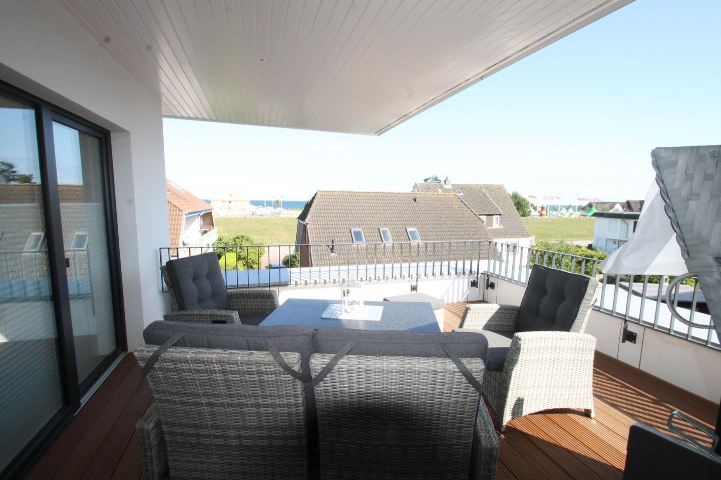 Traumpenthouse mit Meerblick und bestuhlter Dachterrasse mit Strandkorb.