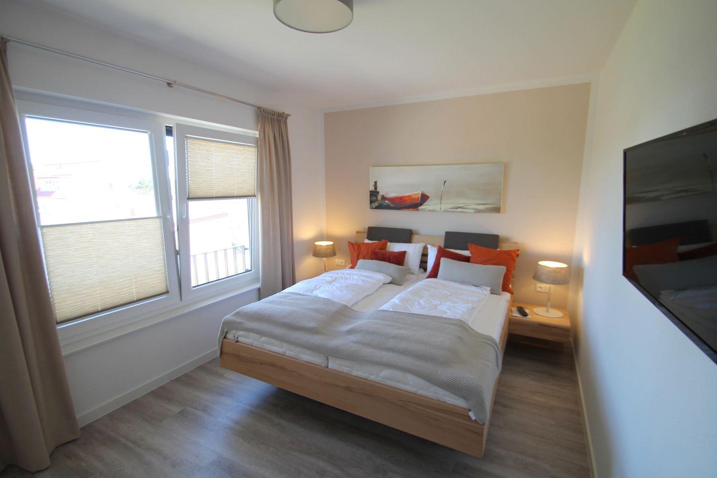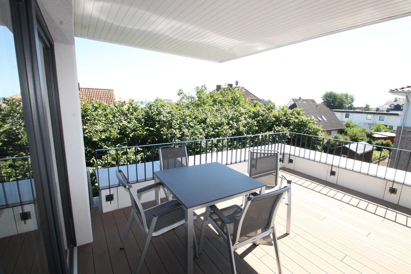 Stilsicher und geschmackvoll eingerichtete drei Zimmer Penthouse-Wohnung im 2. OG mit Dachterrasse und Teilmeerblick, nur 100 Meter vom Strand entfernt. Die Wohnung verfügt über zwei Schlafzimmer, Wohnzimmer mit offener Küche und direktem Zugang zur großen Dachterrasse. Die Terrasse ist mit Möbeln und mit einem Strandkorb für Ihren Hochgenuss im Urlaub ausgestattet. Viele Raffinessen werden auch den technisch begabten Gast überzeugen. Ein großzügiges Duschbad mit bodentiefer Glas-Dusche, Föhn und ein Gäste-WC sowie ein Abstellraum vervollständigen diese Komfortwohnung. Elektrische Rollläden garantieren einen ungestörten Schlaf. PKW-Stellplatz direkt am Haus. Ein Fahrstuhl bringt Sie bis an die Wohnungstür. Auch Ihre Fahrräder finden hier ihren Unterstellplatz. Super Lage, tolle Wohnung, hier geht das Herz des Gastes auf. Einziehen, wohlfühlen. Hier erleben Sie Urlaub mit dem gewissen Extra.