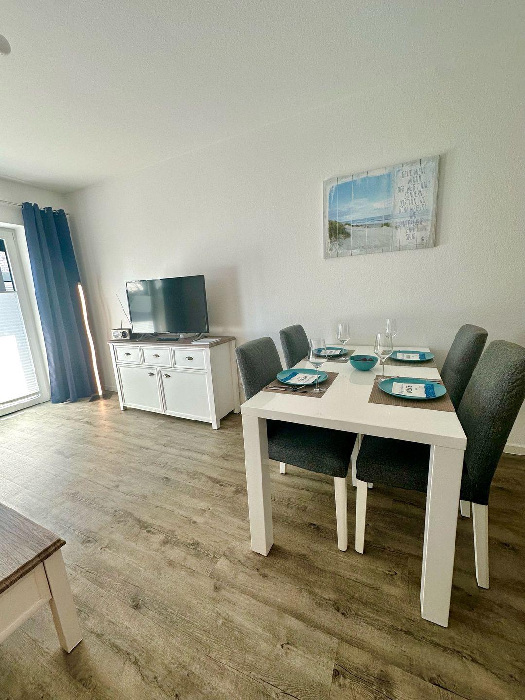 Die Wohnung verfügt über ein großzügiges Schlafzimmer mit Doppelbett (2 x 90x200 cm), großem Kleiderschrank und TV. Außerdem einem Wohnzimmer mit TV, einer Komfort-Schlafcouch für 2 Personen, einer schicken offenen Küche mit Essecke und direktem Zugang zur Südterrasse. Die Zimmer können mit den elektrischen Rollläden verdunkelt werden. Auf der Terrasse erwarten Sie moderne Möbel, ein original Ostsee Strandkorb und ein Elektrogrill. Über den großzügigen Flur erreichen Sie das das schöne Duschbad mit bodentiefer Dusche und einem zusätzlich beheizbaren Handtuchhalter. Zur kostenlosen Nutzung stehen im Abstellraum Waschmaschine und ein Trockner bereit. Das vorhandene Kinderbett kann zusätzlich aufgestellt werden. Ein kostenloser Privatparkplatz sowie ein abschließbarer Fahrradschuppen stehen Ihnen direkt am Haus zur Verfügung. Die Ausstattung und die direkte Nähe zum Strand lassen Ostseeträume wahr werden. Ziehen Sie einfach ein und genießen Sie von Beginn an.