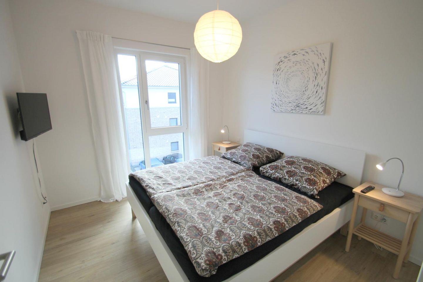 Die Wohnung verfügt über zwei behagliche Schlafzimmer: Das eine mit einem höheren Doppelbett für einen bequemen Einstieg und zusätzlichem Smart TV, das andere mit zwei getrennten Einzelbetten und kleinem Schreibtisch, ideal für Kinder oder als Rückzugsort für Homeoffice.