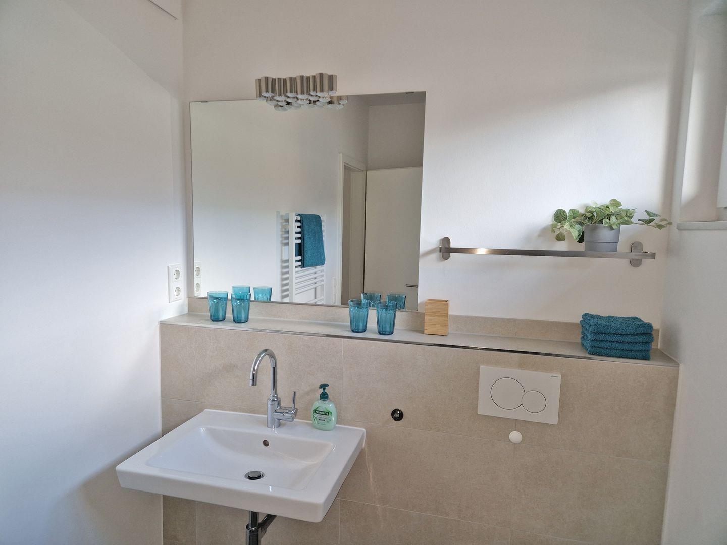 Das schöne in Sandfarben gehaltene Tageslicht-Bad bietet eine geräumige bodengleiche Dusche sowie ein WC. Darüber hinaus ist ein separates Gäste-WC vorhanden. Ein kleiner Abstellraum mit Waschmaschine rundet diese Komfortwohnung ab.