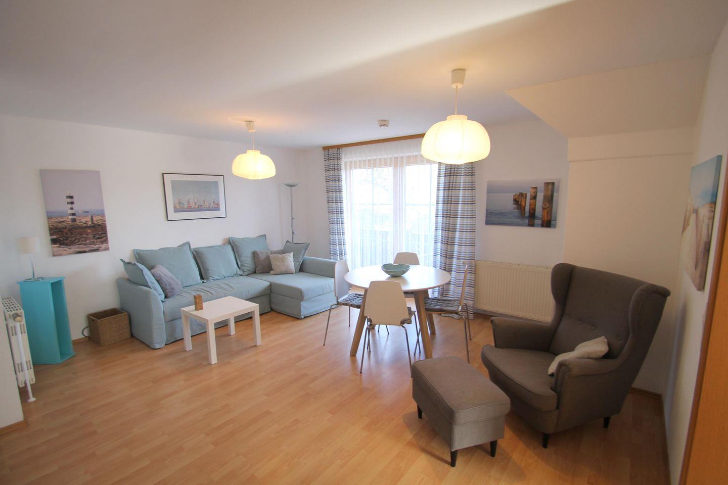 Die Wohnung befindet sich im ersten Obergeschoss eines kleinen, ruhigen Ferienwohnhauses. Es erwarten Sie zwei behagliche Schlafzimmer (ein Schlafzimmer mit Doppelbett (2 x 90x200 cm), ein weiteres mit zwei Einzelbetten (90x200 cm)), ein gemütliches Wohnzimmer mit bequemer Couch und TV (inkl. Blue Ray-Player) sowie ein bestuhlter Balkon – perfekt, um mit einer Tasse Kaffee die frische Meeresluft und den Tag ganz entspannt zu beginnen oder ausklingen zu lassen.