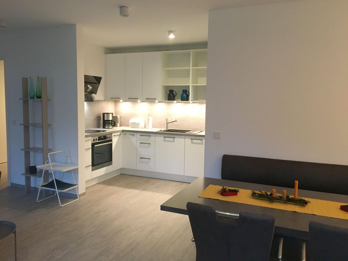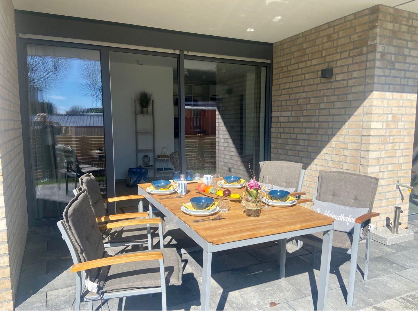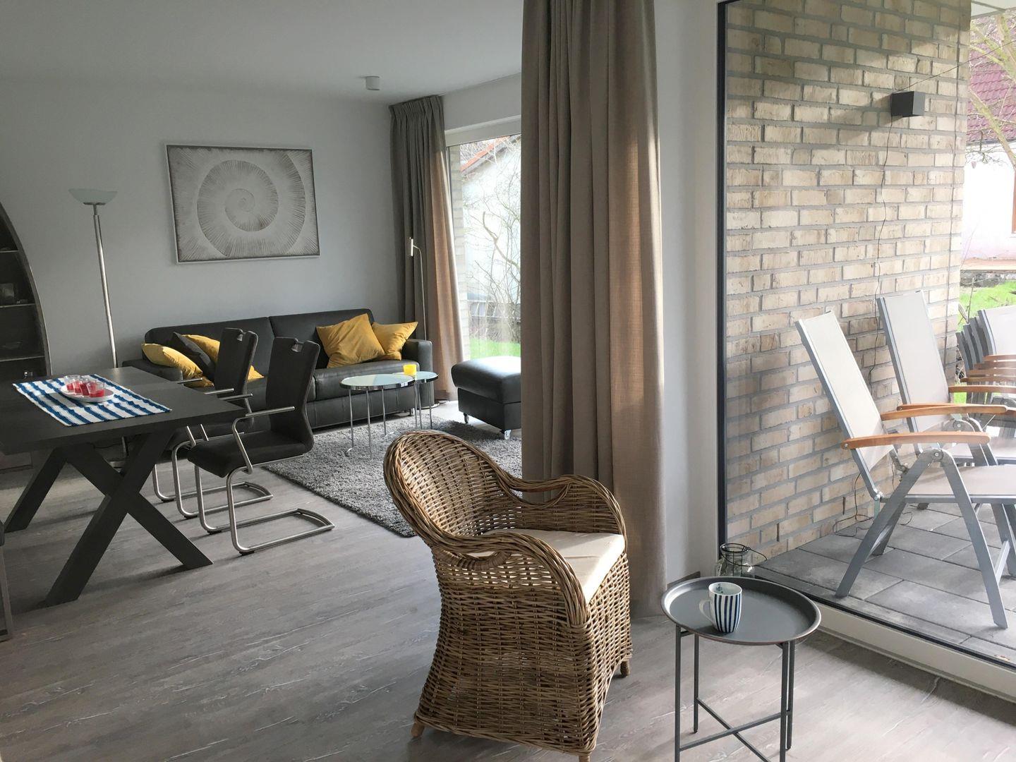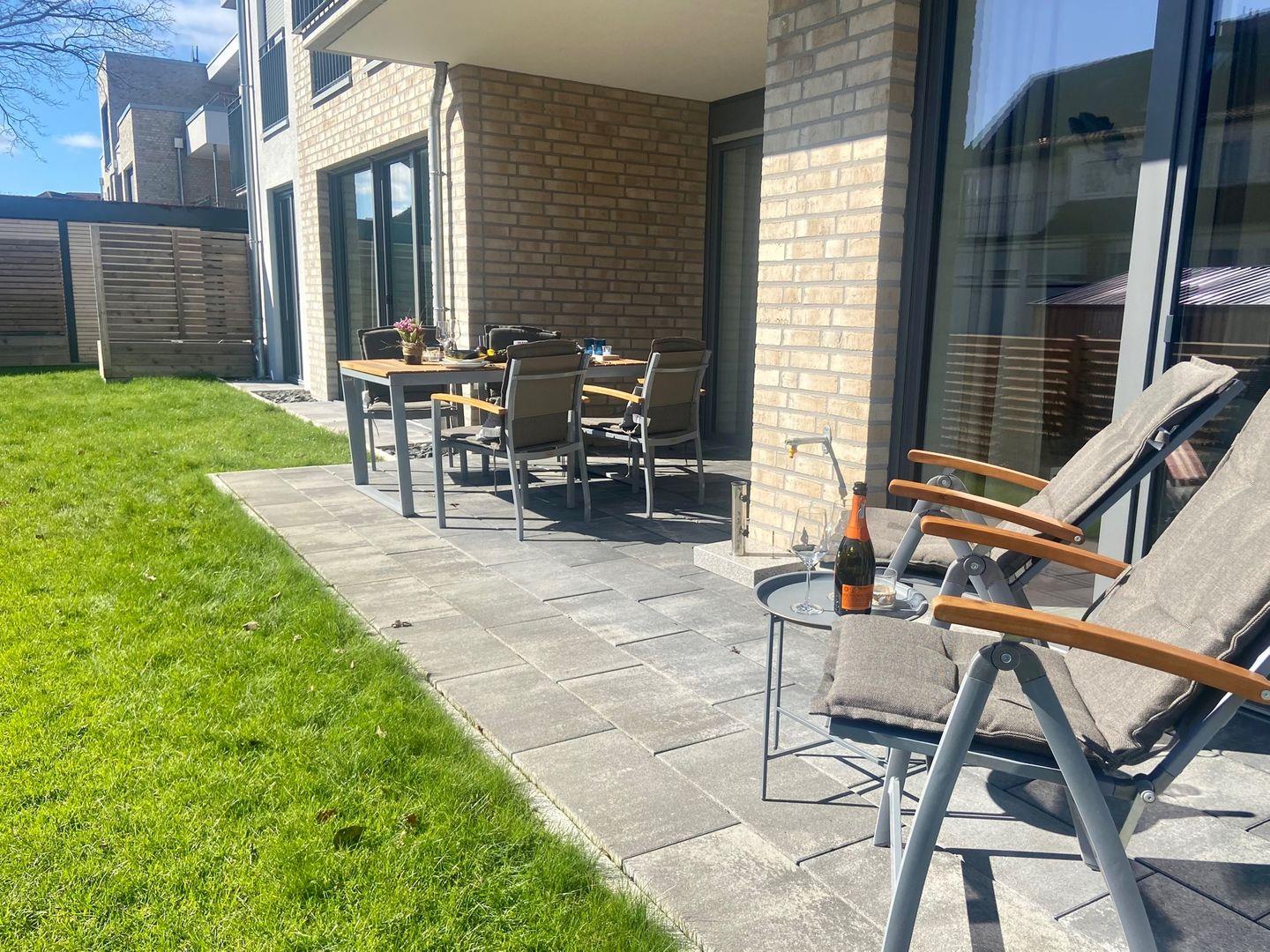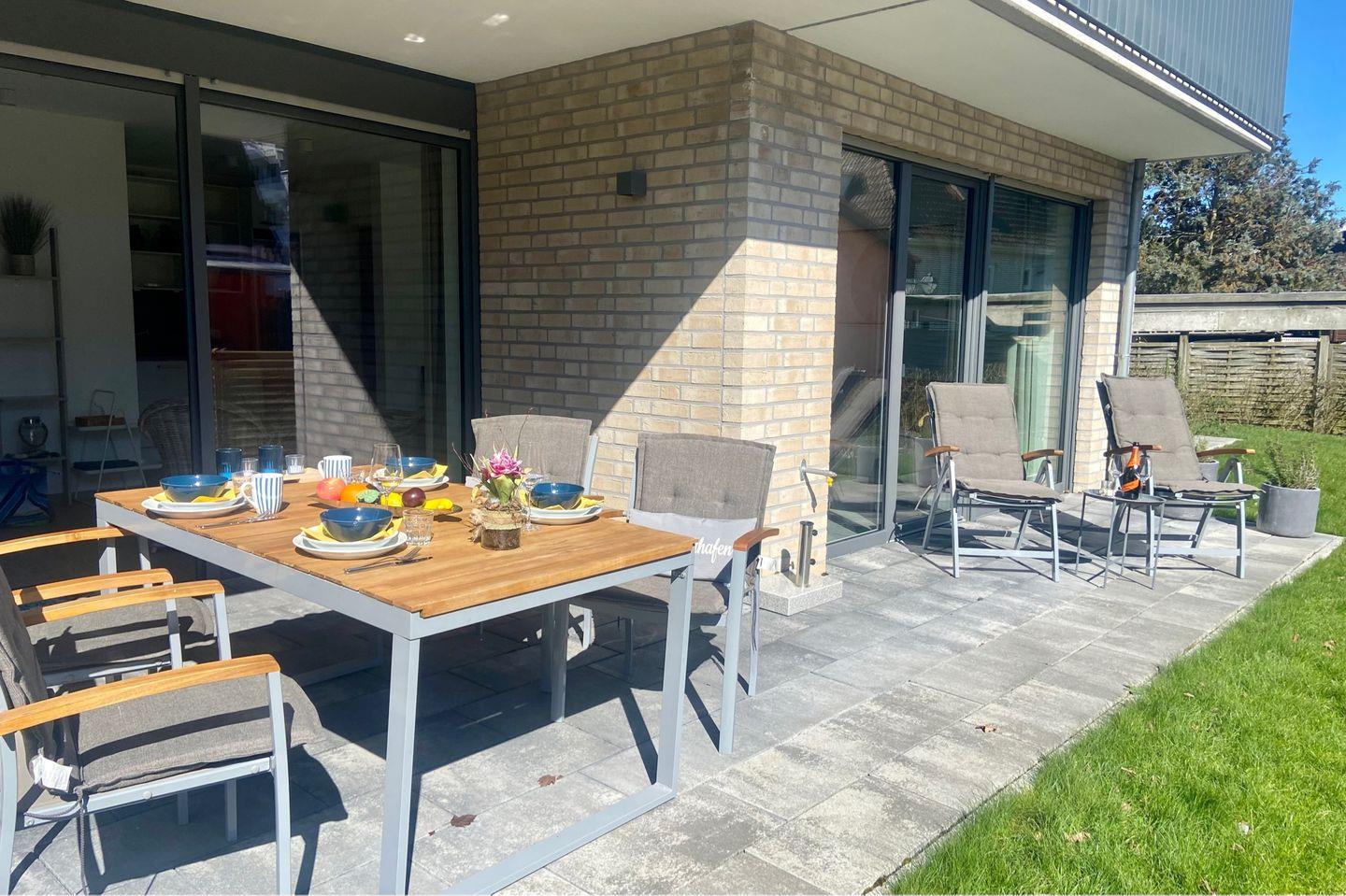 Sehr schöne Parterrewohnung mit gehobenem Neubaustandard auch in der Ausstattung und Auswahl der Möbel. Diese 3- Zimmer Wohnung befindet sich in unmittelbarer Nähe zum Strand in zweiter Reihe hinter dem Deich. Nebst Wohnzimmer mit offen integrierter Küche verfügt die Wohnung über zwei Schlafzimmer, jeweils mit Doppelbett mit Matratzen unterschiedlicher Härtegrade (1 Doppelbett 2 x 90x200cm und 1 Doppelbett 1x 160x200 cm). Die Wohnung ist ausgelegt für bis zu sechs Personen. Vervollständigt wird die Ausstattung dieser Komfortwohnung durch eine moderne Schlafcouch für zwei Personen im Wohnzimmer. Hier befindet sich ein QLED TV und zwei etwas kleinere LED TV in den Schlafzimmer. Neben dem Duschbad verfügt diese Wohnung über ein separates Gäste-WC. Im Abstellraum befindet sich die wohnungseigene Waschmaschine für die Gäste. Die großzügige Terrasse ist nach Süden ausgerichtet und möbliert. Zur Wohnung gehört ein PKW-Stellplatz direkt am Haus. Einfach top, einziehen und wohlfühlen !