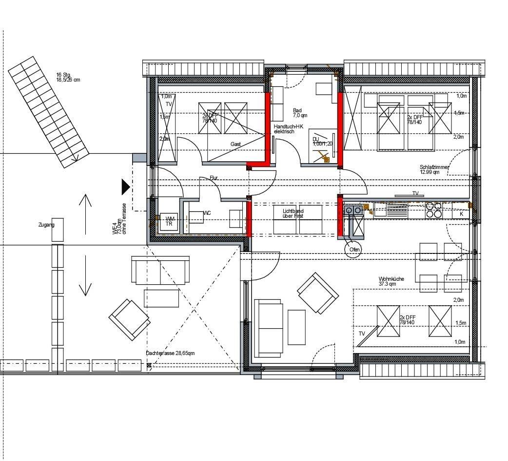das Elternschlafzimmer mit Doppelbett (1 x 180x200 cm) und das Kinderzimmer mit Tagesbett wo im Handumdrehen Platz für Übernachtungsgäste geschaffen wird. Einfach die Liegefläche herausziehen und schon haben Sie ein bequemes Doppelbett (2 x 80x200 cm)!! Selbstverständlich können Sie die Veluxfenster in den Schlafzimmern verdunkeln. Ein Wohlfühlbad mit bodengleicher Dusche und ein Gäste-WC gehören ebenfalls zur Wohnung. Besonderes Highlight dieser Wohnung ist zweifelsohne die zirka 30 m² große Dachterrasse mit Lounge Möbeln und einem Strandkorb in Südwest-Sonnenlage. Der PKW-Stellplatz vor dem Haus gehört zu dieser Wohnung. Ihre mitgebrachten Fahrräder können Sie im Garten abstellen. Ein Kinderbett und ein Kinderhochstuhl sowie ein Bollerwagen für die kleinen Gäste gehören zur Grundausstattung.