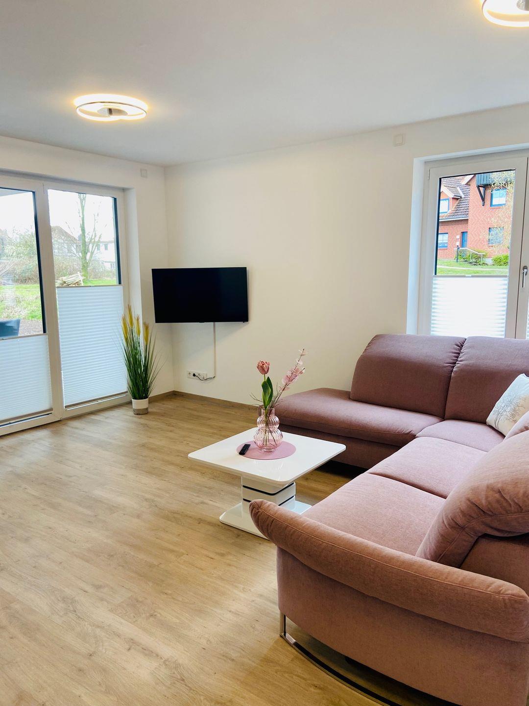 Urlaubsfeeling pur - Entdecken Sie diese sehr schöne neue, ruhige und strandnahe Ferienwohnung direkt hinterm Deich in Südwestlage. Die hell und modern eingerichtete barrierefreie 3-Zimmer-Wohnung befindet sich im Erdgeschoss und ist nur 100m vom Strand entfernt. Ein besonderes Highlight ist die Süd-/Westterrasse mit freiem Blick ins Grüne und auf einen kleinen Bach, auf der Sie bis in die Abendstunden die Sonne im Strandkorb genießen können. Die Wohnung verfügt über zwei Schlafzimmer, beide mit TV – in einem Schlafzimmer finden Sie ein Doppelbett mit den Maßen 180 x 210 cm, in dem 2. Schlafzimmer befindet sich ebenfalls ein Doppelbett (Betten sind zu zwei Einzelbetten trennbar). In beiden Schlafzimmern sorgen elektrische Jalousien – die sich in allen Räumen der Wohnung befinden - für Ihren Schlafkomfort. Die Wohnung verfügt weiterhin über ein Wohn-/Esszimmer mit heller, offener Küche (Küchenarbeitsplatte mit 103 cm Höhe) und direktem Zugang zur Süd-Westterrasse. Zusätzlich zu dem WC im schönen, geräumigen Tageslicht-Duschbad mit Spiegelschrank und mit barrierefreier Dusche steht Ihnen ein separates Gäste-WC zur Verfügung. Die Waschmaschine befindet sich im Abstellraum der Wohnung. Der wohnungseigene PKW-Stellplatz ist direkt am Haus. Hier können Sie - bei Bedarf - Ihr Elektrofahrzeug gegen Gebühr an der zur Wohnung gehörenden Ladesäule laden. Freuen Sie sich auf eine helle, moderne und mit viel Liebe eingerichtete Wohnung mit Wohlfühlfaktor. Liebe Hunde ( max. 2) sind herzlich Willkommen!
