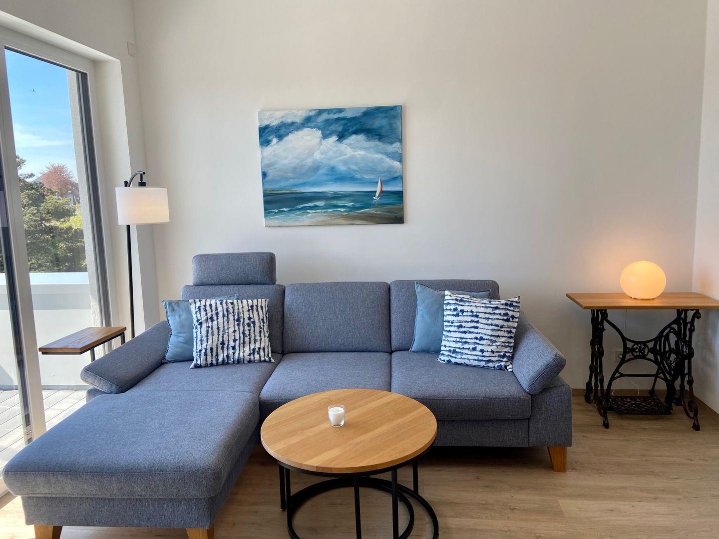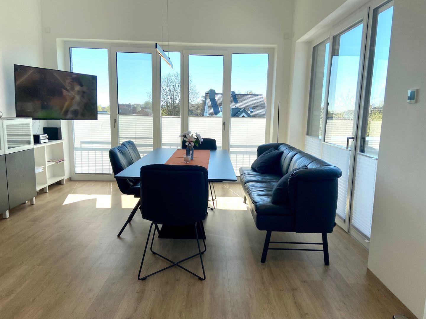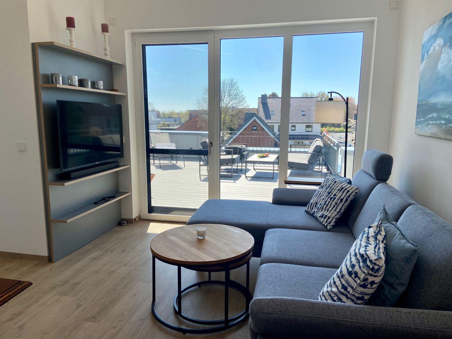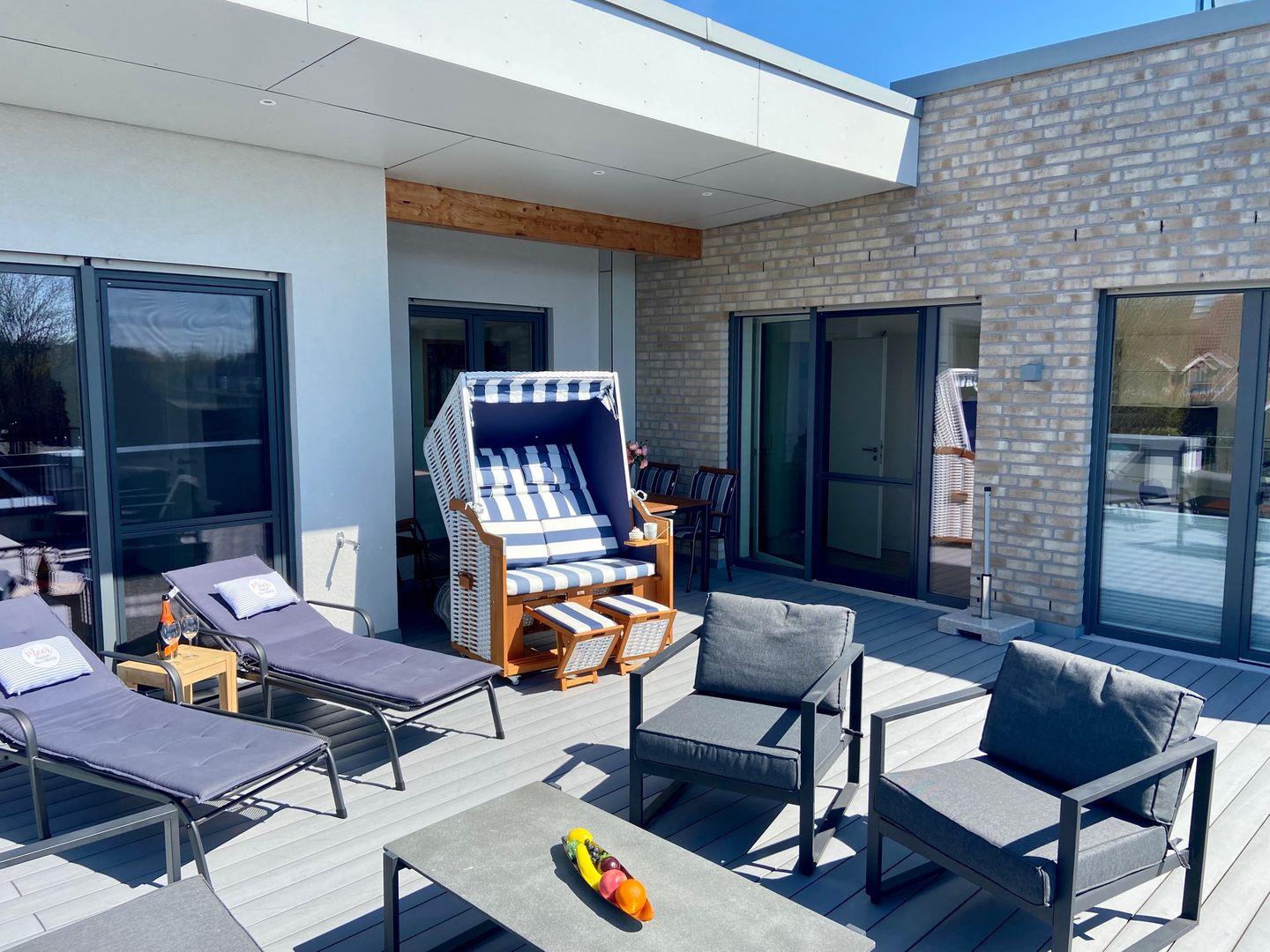 Willkommen in Ihrem luxuriösen Rückzugsort an der Küste! Diese exklusive Penthousewohnung der Premiumklasse bietet Ihnen eine einzigartige Kombination aus modernem Lifestyle und charmanten Antiquitäten. Die großzügige Neubauwohnung mit drei Zimmern begeistert durch eine weite Dachterrasse, die mit stilvollen Lounge-Möbeln, einem gemütlichen Strandkorb, zwei Sonnenliegen und einer Esstisch-Garnitur ausgestattet ist. Hier können Sie die frische Luft in vollen Zügen genießen und das Leben unter freiem Himmel zelebrieren.