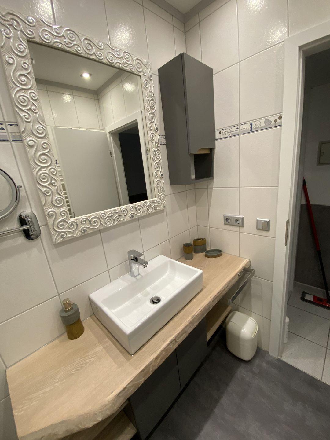 - Zugang vom Flur ins moderne helle Badezimmer mit Dusche und WC
