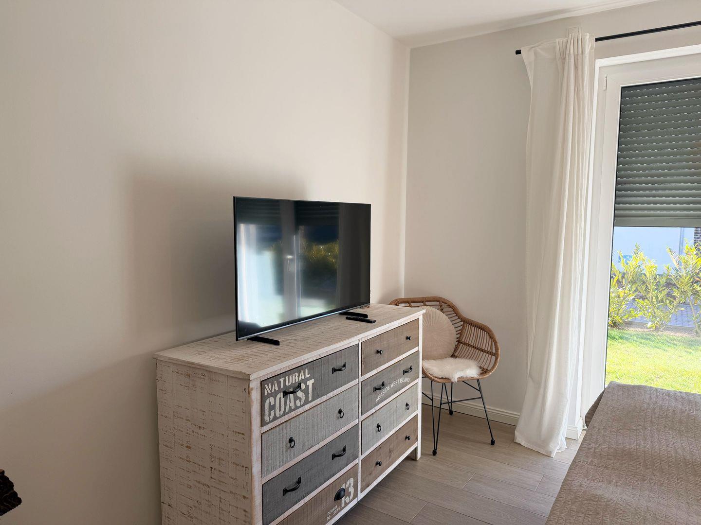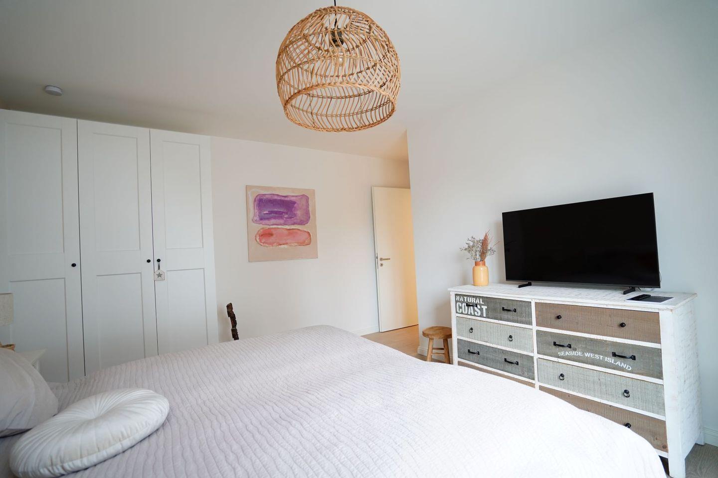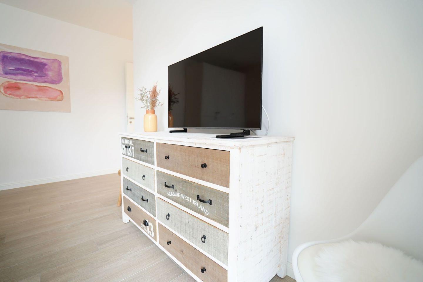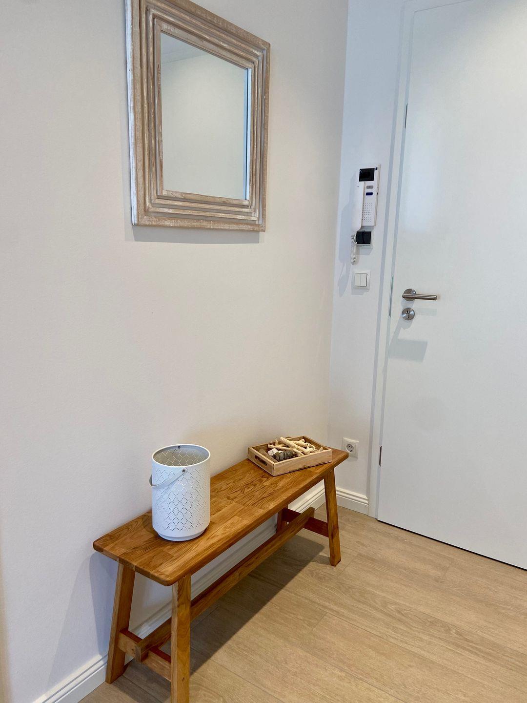 Die moderne, stilvoll eingerichtete Wohnung lässt keinen Wunsch offen. Es gibt einen großzügigen Wohnraum mit TV, Wii mit einer Auswahl an diversen Spielen, Radio mit CD, Bücher und WLAN. Die offene, moderne Einbauküche mit großzügigem Essbereich genügt höchsten Ansprüchen und verfügt über Nespresso-Maschine, Backofen, Spülmaschine und Induktionskochfeld. Zwei separate Schlafzimmer - eines mit TV - mit hochwertigen Doppelbetten sowie ein modernes Bad mit großem, ebenerdigen Duschbereich und Fußbodenheizung stehen zur Verfügung. Zusätzlich gibt es ein Gäste-WC. Die große Terrasse ist mit Esstisch und Stühlen ausgestattet und teilweise überdacht. Ein fester PKW-Stellplatz ist für Sie reserviert. Eine Wallbox kann gegen Gebühr genutzt werden. Ein Fahrradabstellraum, ein kleiner Abstellraum in der Wohnung und eine Waschmaschine sind ebenfalls für Ihren Komfort vorhanden. Ein Kinderreisebett sowie einen Hochstuhl finden Sie in der Wohnung. Bei dieser Wohnung handelt es sich um ein Nichtraucherobjekt. Haustiere sind nicht erlaubt!