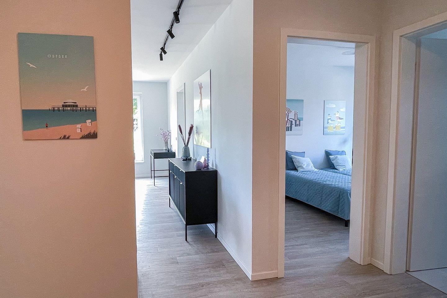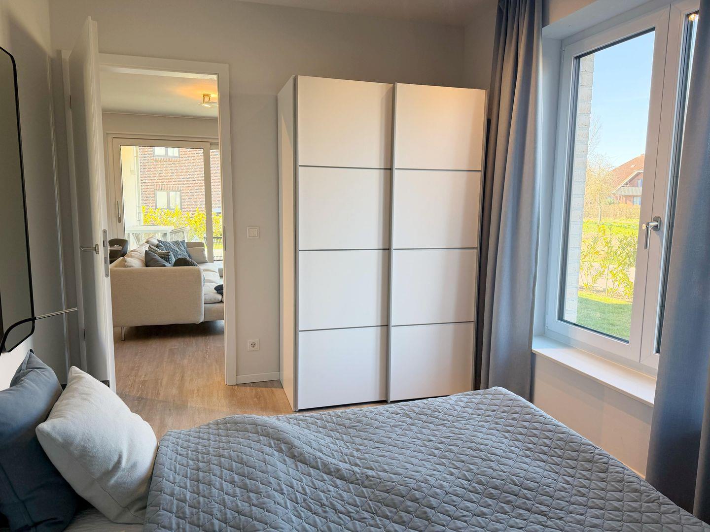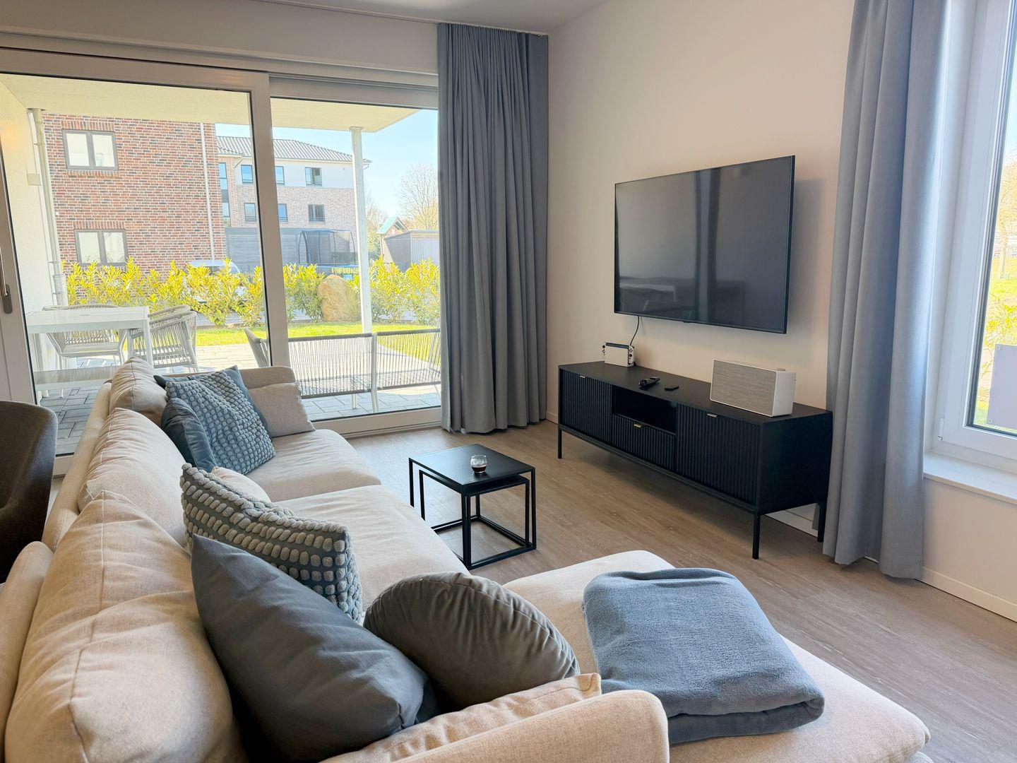 Bereits beim Betreten der Wohnung ist der Wohlfühl-Charakter ausgelöst. Der Eingangsbereich ist mit einer Garderobe ausgestattet. Das erste Schlafzimmer ist mit einem Doppelbett eingerichtet, dass bei Bedarf auch getrennt werden kann. Außenrollläden verdunkeln das Zimmer für einen ruhigen Schlaf. Das zweite Schlafzimmer ist mit einen Bett mit der Größe 180x200 , einem TV-Gerät sowie einem Kleiderschrank eingerichtet. Außenrollläden sorgen auch hier für einen erholsamen Schlaf. Das in heller Optik gehaltene Duschbad hat eine bodentiefe Dusche, Fön und einen Handtuchheizkörper. Der Wohn-Essbereich ist großzügig eingerichtet und durch die bodentiefen Fenster mit Süd- und Westausrichtung hell und freundlich. Ein großer Tisch mit bequemen Schalenstühlen bietet ausreichend Platz. Die offene Küche mit heller Oberfläche ist mit hochwertigen Elektrogeräten ausgestattet: Herd mit integriertem Dunstabzug, Backofen, Mikrowelle, Geschirrspüler, Kühl-/Gefrierkombination, Wasserkocher, Toaster, Filterkaffeemaschine, Nespressomaschine und Milchaufschäumer. Der Wohnbereich ist bequem fein ausgestattet. Ein Smart -Flachbildschirm lässt keine Wünsche offen. Via Bluetooth verbinden und eigene Musik hören - Kein Problem. Auch an einem verregneten Tag lädt eine Nintendo-Switch inkl. einiger Spiele ein, die Zeit gemütlich auf dem Sofa zu verbringen . Vom Wohnzimmer kommen Sie auf die Terrasse in Süd- und West Lage . Die Sonne begrüßt seine Gäste zum Mittag und Abend. Ein großer Tisch mit vier Stühlen und ein bequemes Loungesofa lädt zu gemütlichen Stunden ein. Außerdem verfügt die Wohnung über ein Gäste-WC. Eine Waschmaschine befindet sich in einem Abstellraum in der Wohnung.