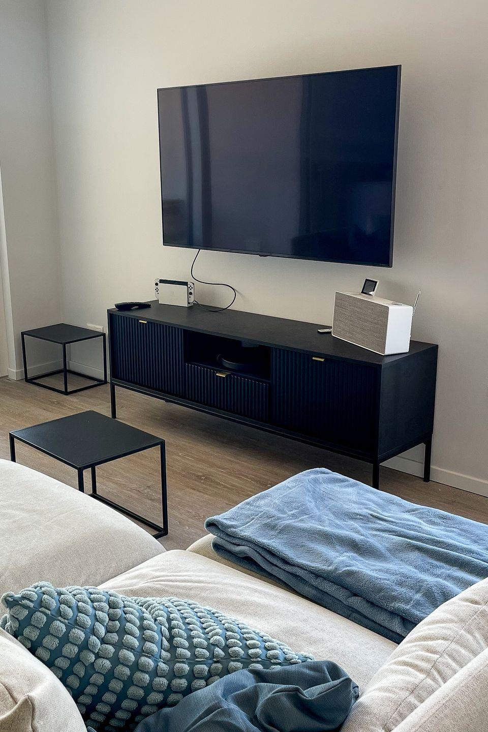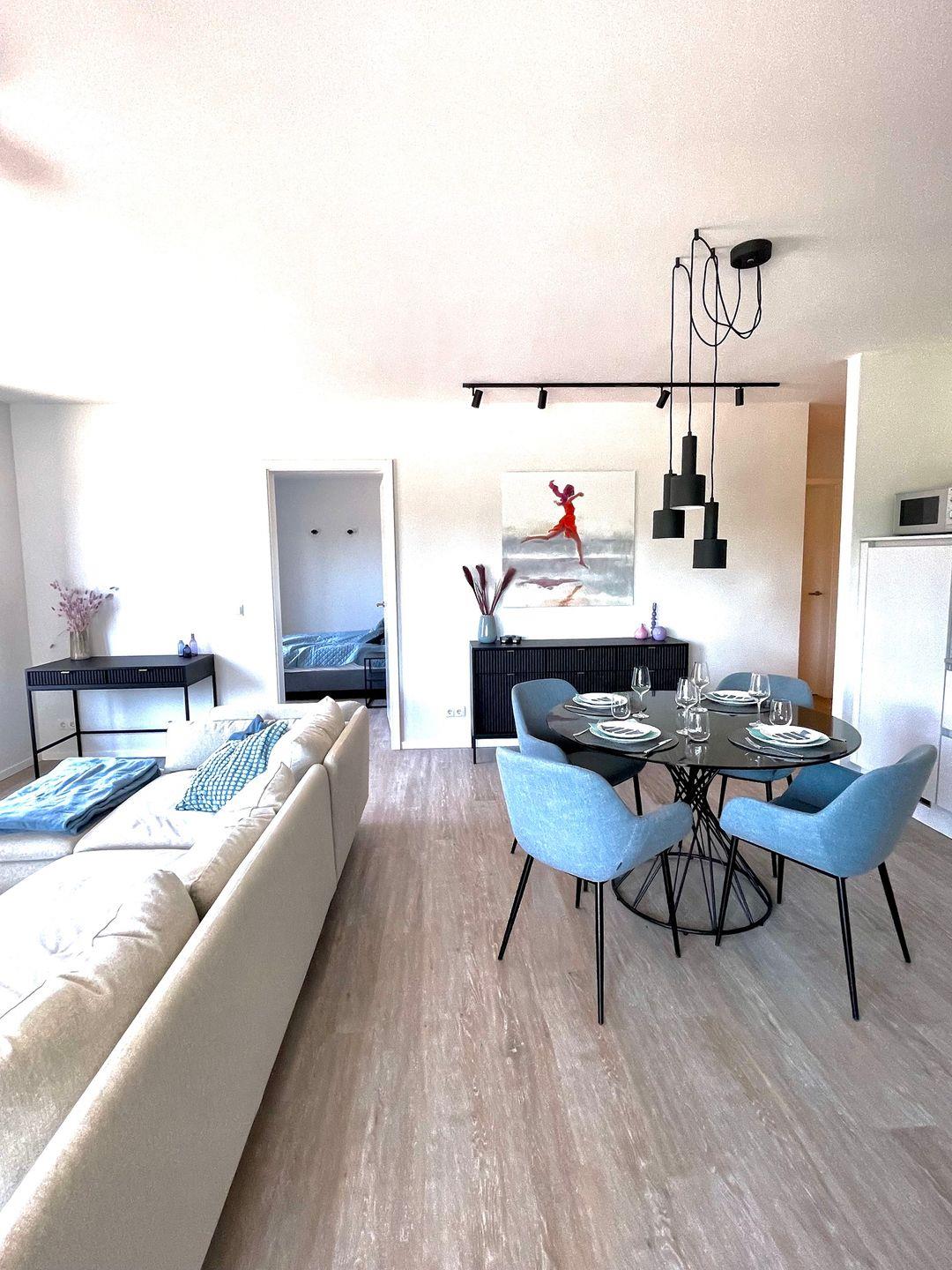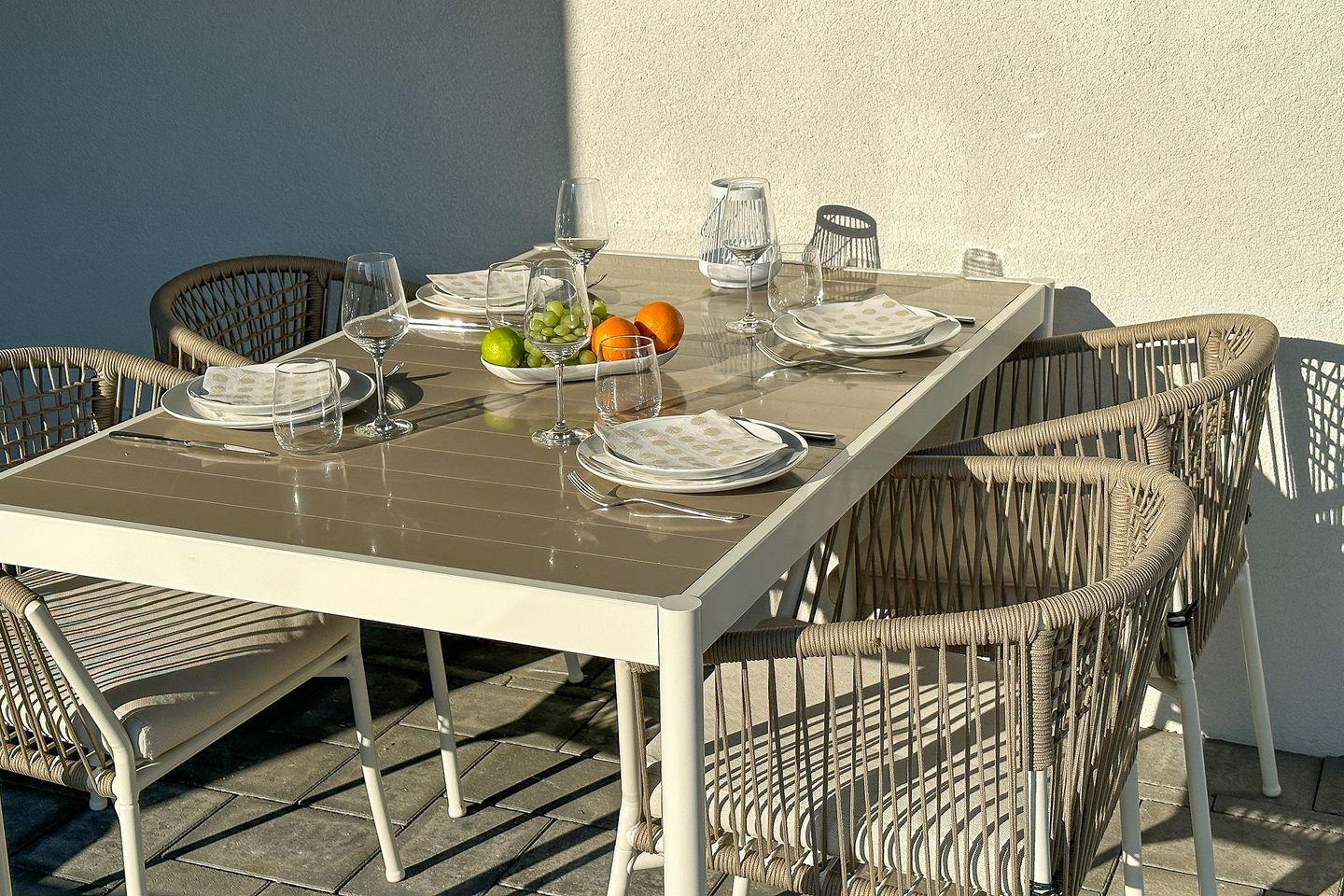 Bereits beim Betreten der Wohnung ist der Wohlfühl-Charakter ausgelöst. Der Eingangsbereich ist mit einer Garderobe ausgestattet. Das erste Schlafzimmer ist mit einem Doppelbett eingerichtet, dass bei Bedarf auch getrennt werden kann. Außenrollläden verdunkeln das Zimmer für einen ruhigen Schlaf. Das zweite Schlafzimmer ist mit einen Bett mit der Größe 180x200 , einem TV-Gerät sowie einem Kleiderschrank eingerichtet. Außenrollläden sorgen auch hier für einen erholsamen Schlaf. Das in heller Optik gehaltene Duschbad hat eine bodentiefe Dusche, Fön und einen Handtuchheizkörper. Der Wohn-Essbereich ist großzügig eingerichtet und durch die bodentiefen Fenster mit Süd- und Westausrichtung hell und freundlich. Ein großer Tisch mit bequemen Schalenstühlen bietet ausreichend Platz. Die offene Küche mit heller Oberfläche ist mit hochwertigen Elektrogeräten ausgestattet: Herd mit integriertem Dunstabzug, Backofen, Mikrowelle, Geschirrspüler, Kühl-/Gefrierkombination, Wasserkocher, Toaster, Filterkaffeemaschine, Nespressomaschine und Milchaufschäumer. Der Wohnbereich ist bequem fein ausgestattet. Ein Smart -Flachbildschirm lässt keine Wünsche offen. Via Bluetooth verbinden und eigene Musik hören - Kein Problem. Auch an einem verregneten Tag lädt eine Nintendo-Switch inkl. einiger Spiele ein, die Zeit gemütlich auf dem Sofa zu verbringen . Vom Wohnzimmer kommen Sie auf die Terrasse in Süd- und West Lage . Die Sonne begrüßt seine Gäste zum Mittag und Abend. Ein großer Tisch mit vier Stühlen und ein bequemes Loungesofa lädt zu gemütlichen Stunden ein. Außerdem verfügt die Wohnung über ein Gäste-WC. Eine Waschmaschine befindet sich in einem Abstellraum in der Wohnung.