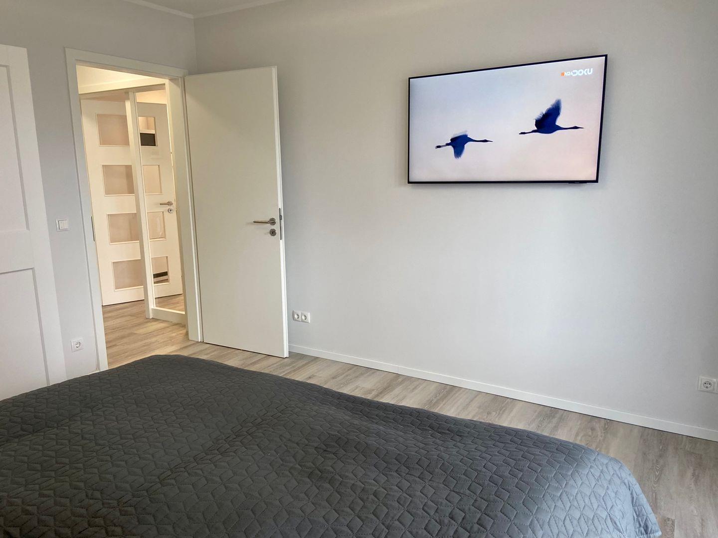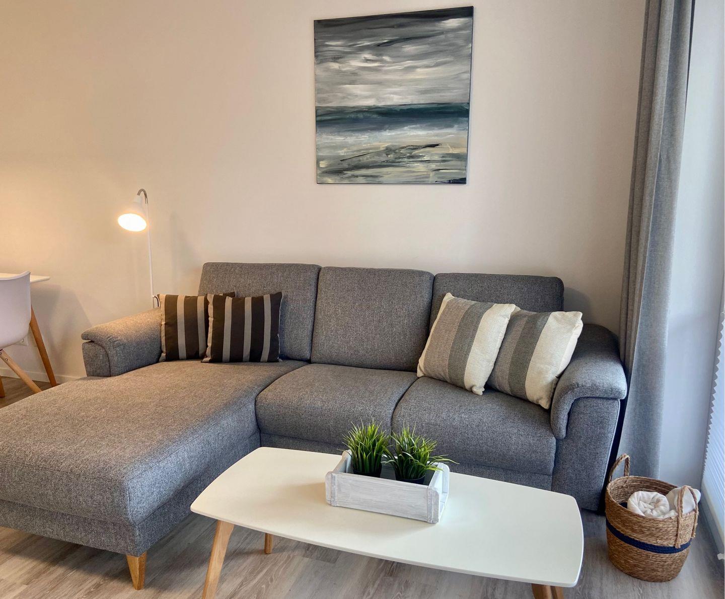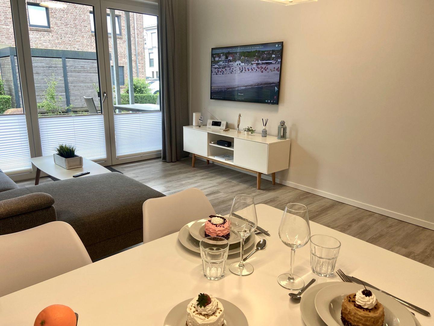 Bodentiefe Fensterelemente und die geschmackvolle, maritime Einrichtung mit Liebe zum Detail, schaffen eine helle und freundliche Atmosphäre zu Wohlfühlen. Die 65 qm werden optimal genutzt und bieten ein schönes Ambiente für 2 Personen. Es erwartet Sie ein großzügiges Wohnzimmer und ein Schlafzimmer mit einem Doppelbett (180x200 cm), ein TV und ein ausreichend großer Kleiderschrank. Im Wohnzimmer gibt es einen Essbereich für 4 Personen und eine Sofaecke mit TV und Radio. Eine schöne, teilweise überdachte Terrasse in Südausrichtung, ausgestattet mit Gartenmöbeln und einem Strandkorb, lädt zu jeder Tageszeit zum Entspannen ein. Die Fenster sind mit Vorhängen und elektrischen Außenrollläden versehen. Die moderne Küchenzeile ist ebenfalls im Wohnzimmer integriert. Das hochwertige Bad verfügt über eine Dusche, Waschbecken, WC, Fön und Handtuchwärmer. Im Abstellraum können Sie die Waschmaschine nutzen. Ein kostenloser Internetzugang über WLAN steht selbstverständlich zur Verfügung.
