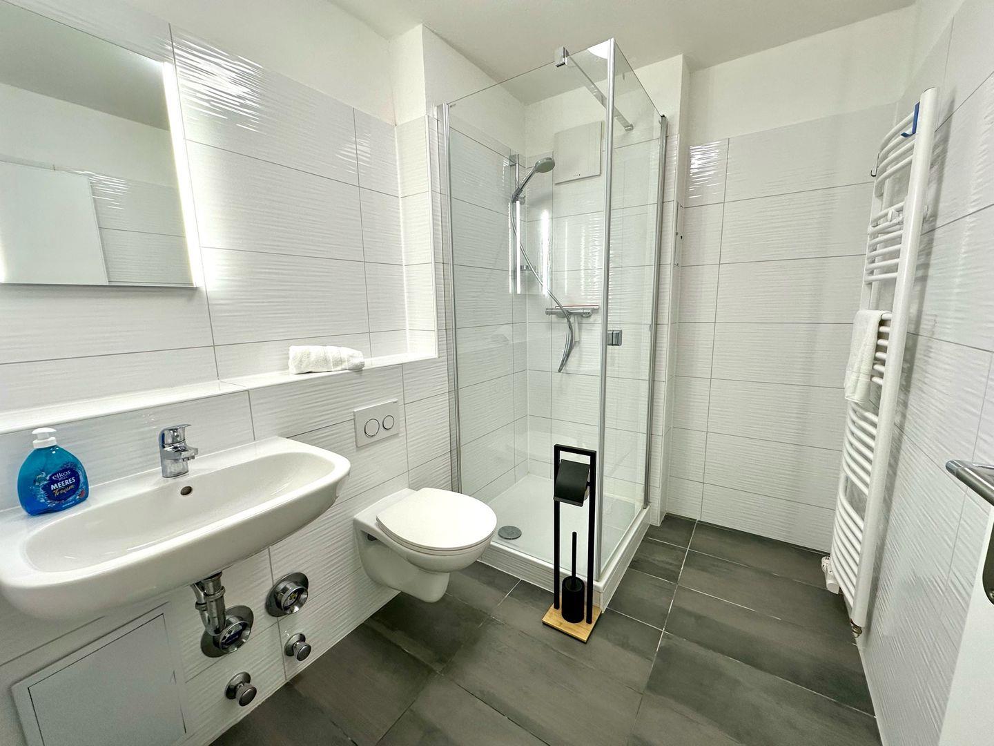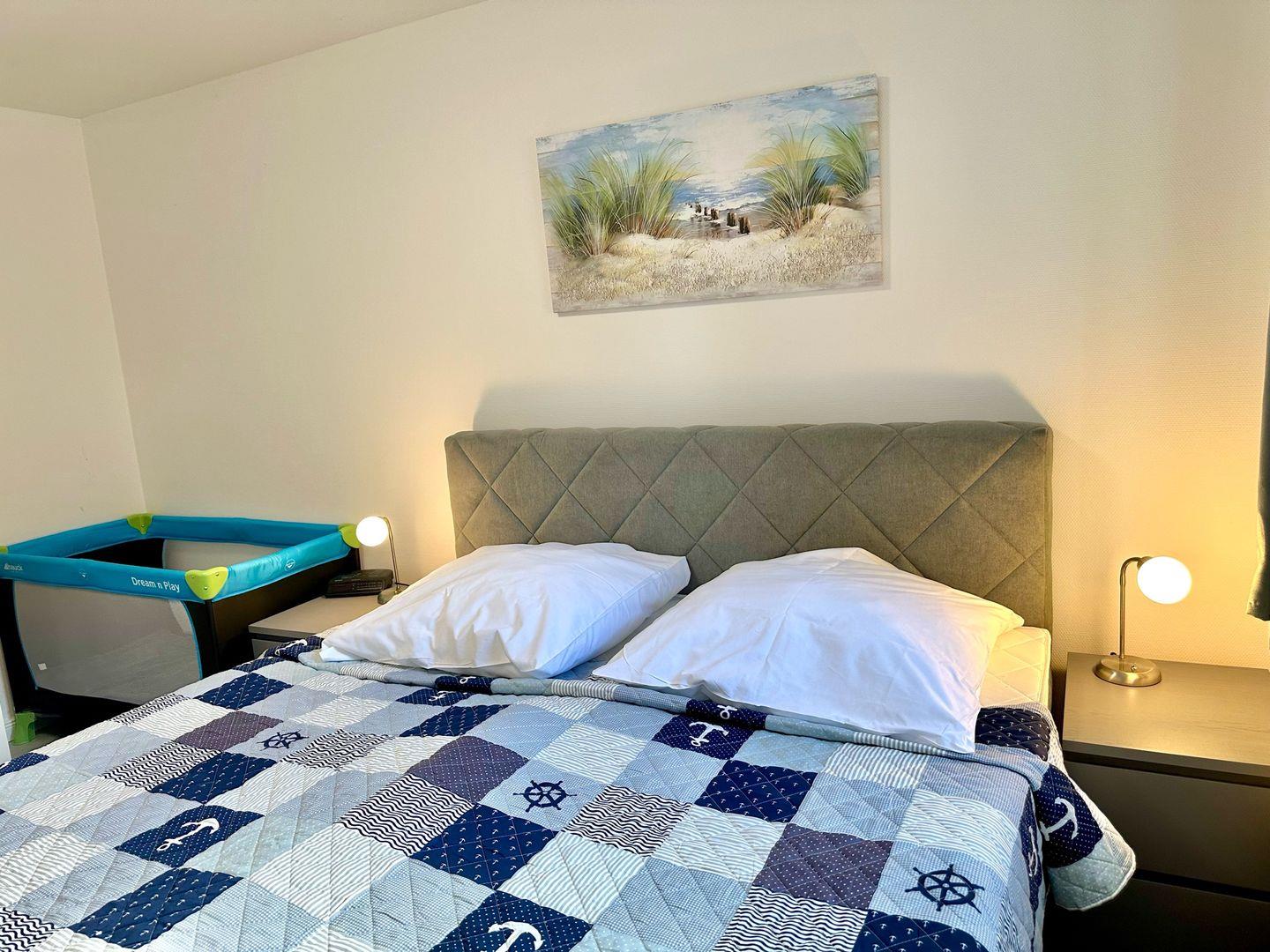 Das Schlafzimmer besticht durch ein großzügiges Boxspringbett (1 x 180x200 cm), zwei Nachttische, ein Kinderreisebett und einen geräumigen 3-türigen Kleiderschrank. Das Badezimmer verfügt über eine moderne Dusche und ein WC.